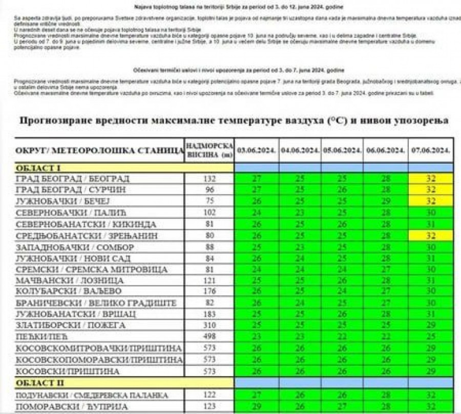 STIŽE PRVI TROPSKI TALAS! Sledi niz od pet dana sa visokim temperaturama, a sve počinje od ovog Autor: Republika Vesti 04.06.2024 22:45 Pratite nas i putem Android ili iOS aplikacija Leto 2024. godine je otpočelo 1. juna, a prema prognozama Republičkog hidrometeorološkog zavoda, pred nama su naredni dani sa visokim temperaturama. Foto: shutterstock Nakon nedelje nestabilnosti sa pljuskovima, grmljavinom i gradom, očekuje se pretežno sunčano vreme sa temperaturama koje će biti iznad proseka. U petak 7. juna, temperatura će dostići 33 stepena u nekoliko gradova i okruga, a do ponedeljka se predviđa da će biti toplije sa maksimalnim temperaturama do 33 stepena širom Srbije. Ovo označava početak prvog tropskog talasa za ovu godinu. Gordana Marinković Ljuboja, meteorolog RHMZ, ističe da su temperature od 30 stepeni Celzijusa već tropski dan, dok je tropska noć kada je minimalna temperatura iznad 20 stepeni. Prema najnovijoj prognozi, u Beogradu se očekuju tropske noći tokom vikenda. - Temperatura već od 30 stepeni Celzijusa je tropski dan. Od četvrtka narednih pet dana će temperatura biti od 30 do 33 stepena, i to je normalno vreme za početak juna - kaže Gordana Marinković Ljuboja, prenosi Blic. Foto: RHMZ Prognoza Institut „Batut“ je objavio preporuke za postupanje u slučaju visokih temperatura, upozoravajući da se očekuje tropski talas od 7. do 9. juna u pojedinim delovima Srbije, a 10. juna u većem delu zemlje. "Žuto" upozorenje na visoke temperature Prema prognozi, Beograd, Bečej i Zrenjanin mogu očekivati temperature od 32-33 stepena Celzijusa, što je dovelo do izdavanja „žutog“ upozorenja. Ostali gradovi poput Niša, Loznice, Vršca, Sremske Mitrovice, Kikinde, Novog Sada i Leskovca takođe će imati visoke temperature, ali bez upozorenja. Foto: Printscreen/Batut Tabela Batuta o uticaju vremena na zdravlje Institut "Batut" savetuje građane da održavaju termoregulaciju unošenjem dovoljne količine tečnosti, izbegavajući izlaganje spoljašnjim mikroklimatskim uslovima, uzimanjem manjih, ali češćih obroka, te izbegavanjem hrane sa visokim sadržajem proteina. Takođe, preporučuje se nošenje odeće od prirodnih materijala velike prozračnosti radi lakšeg isparavanja znoja. Poštovani čitaoci, možete nas pratiti i na platformama: Facebook, Instagram, YouTube, TikTok, Telegram, Vajber. Pridružite nam se i prvi saznajte najnovije i najvažnije informacije. Naše aplikacije možete skinuti sa Google Play i Apple AppStore. Pročitajte i... Vremenska prognoza 15:41 14.05.2024 UPOZORENJA RHMZ SE SAMO NIŽU! U Srbiju stiže NEVREME iz Hrvatske i Bosne i Hercegovine: OČEKUJU SE GRMLJAVINA, KIŠA I OLUJNA KOŠAVA - UDARI I DO 100 KM NA ČAS! Vremenska prognoza 14:48 12.05.2024 STIŽE PROMENA! Nova vremenska prognoza za naredne dane! Vremenska prognoza 12:50 04.06.2024 UPALJENI SVI ALARMI! Ekstremne vrućine stižu u Srbiju, OVA TRI GRADA će najgore proći, Batut poslao UPOZORENJE! Vremenska prognoza 08:04 04.06.2024 POSLE JUČERAŠNJIH PLJUSKOVA, JEDAN LEP DAN! Odložite danas kišobrane, međutim u OVOM delu zemlje nastavak kišnog talasa BONUS VIDEO: Tagovi Srbija Vremenska prognoza RHMZ Batut Tropski talas Komentari (0) Vesti Politika 15:47 SKIDANJE ZASTAVE SPC NASTAVAK ISTE KAMPANJE! Kancelarija za KiM: Prištinski političari koriste govor mržnje! Društvo 15:04 NA NOVOM GROBLJU OBELEŽEN 4. DECEMBAR - Dan vojnih veterana Društvo 14:14 Macut posetio Pirot, razgovarao sa gradonačelnikom Vasićem o pokretanju fakulteta 14:00 KAD DOĐU PATNJE I TUGE, UVEK NA UMU IMAJTE OVO! Strac Jefrem Arizonski kaže da tako nikada nećete upasti u očajanje! Politika 13:44 SADAŠNJA OPOZICIJA 2005. DONELA ZAKON KOJI DRŽAVNIM SLUŽBENICIMA ZABRANJUJE BAVLJENJE POLITIKOM! Izmislili da je opština Mionica dala otkaz njihovom kandidatu Društvo 13:11 NI USPORAVANJE PRED KAMARAMA VAS VIŠE NEĆE SPASTI! Od 2026. potpuno nova pravila na srpskim putevima - AKO NE VEŽETE POJAS, PLAĆATE ČAK 50.000 DINARA! 12:46 POSNE BOMBICE MONAHINJE ATANASIJE: Recept koji spaja tradiciju, toplinu, mir i bogat ukus u domaćoj kuhinji Politika 12:40 NI AMERIČKA NI RUSKA, OVO JE SRPSKA LOGIKA! Vučić: Puna energetska bezbednost i sigurnost! Beograd 12:18 KAKAV KOLAPS U CENTRU BEOGRADA! Dečanska ulica blokirana, vozači zauzeli tri trake! (FOTO) Društvo 11:54 DEVOJČICA PUŠILA VEJP, PA POČELA KOŽA DA JOJ SE RASPADA I OTPADA! Dobila stravičnu dijagnozu, pedijatar za Republiku otkrio: U nekim slučajevima dođe i do SMRTNOG ISHODA! Politika 11:24 BLOKADERI BI DA UNIŠTE SRBIJU! Brnabićeva iznela jasan stav: Šalju pisma protiv Srbije, ne znaju koju da izvuku! Društvo 11:10 "TELEKOM SRBIJA" UVEO NAPREDNU 5G MREŽU, KOJU KORISTI SAMO 2 ODSTO EVROPLJANA! Lučić: Revolucija u mobilnim komunikacijama Društvo 11:05 VOZAČI, VAŽNA INFORMACIJA: Objavljene nove cene goriva koje će važiti do 12. decembra! 10:39 ODLUKA DRŽAVE KOJA JE PRIVUKLA PAŽNJU VERNIKA: Zavet monahinje Jefimije izvezen nitima bola dobio pečat večnosti Politika 09:59 IZ PORTE CRKVE U LIPLJANU SKINUTA ZASTAVA SPC! Nadzorna kamera sve snimila: Zastavu je sa zvonare skinula osoba koja je na glavi imala fantomku Društvo 09:34 ZABRINJAVAJUĆI PODACI: Svaka 4. osoba u Srbiji je žrtva digitalnog nasilja i to najčešće žene! Beograd 09:29 AUTOKOMANDA ĆE BITI KRCATA! Radovi na jednoj od najprometnijih soabraćajnica u Beogradu, menjaju se i trase prevoza! Društvo 09:10 Pomozimo Luki slanjem 306 na 2407 Društvo 09:04 VAŽNA VEST ZA SVE RODITELJE: Prijave za besplatne novogodišnje paketiće i u ponedeljak! Politika 09:01 PIPER RASKRINKAO PAKLENI PLAN MILOŠA JOVANOVIĆA: Učestvovaće na izborima, potpisaće zapisnik, a onda će reći da ih NE PRIZNAJE! Društvo 08:57 GUŽVE NA GRANICAMA SVE VEĆE: Novi EU sistem produžava čekanja, vozači u problemu! Društvo 08:37 SNEG NEĆEMO VIDETI OVOG DECEMBRA? Iznenađujuća izjava meteorologa! Društvo 08:36 ZA DOČEK DERU KOŽU S LEĐA! Nova godina i do 