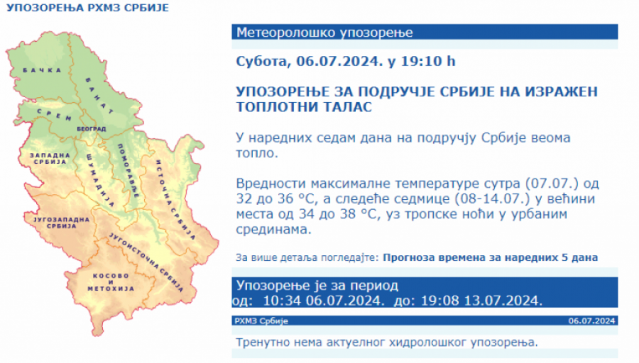 RHMZ SE OGLASIO SA NAJNOVIJIM UPOZORENJEM! Stiže novi talas, evo o čemu je reč Autor: Republika Vesti 06.07.2024 22:26 Pratite nas i putem Android ili iOS aplikacija Talas ćetrajati sedam dana. Foto: Shutterstock Vreme Na subotnje veče, Republički hidrometeorološki zavod izdao je novo upozorenje za Srbiju, najavljujući izražen toplotni talas koji će trajati narednih sedam dana. Meteorolozi su naglasili da će temperature biti veoma visoke u celoj zemlji tokom ovog perioda. Za nedelju, 7. jula, prognozirane su maksimalne temperature od 32 do 36 °C, dok se za period od 8. do 14. jula očekuju još više temperature, u većini mesta od 34 do 38 °C. Foto: RHMZ Printscreen RHMZ upozorenje Posebno je istaknuto da će noći biti tropske i u urbanim sredinama, što može dodatno otežati situaciju sa visokim temperaturama tokom noći. Ovakve prognoze upućuju na potrebu za dodatnim merama opreza i zaštitnih mera tokom perioda intenzivnog letnjeg vremena. Podsećamo, danas je počeo toplotni talas u Srbiji. Republički hidrometeorološki zavod ponovo je najavio veoma visoke temperature koje će prelaziti 37 podeok, a na teritoriji cele Srbije upaljen je crveni alarm. Institut za javno zdravlje "Milan Jovanović Batut" takođe upozorava na ekstremne vrućine, a u dva dela Srbije rizik od požara je ekstreman! Danas toplotni talas u trajanju od najmanje 5 dana počinje u: Banatu Šumadiji Pomoravlju Jugoistočnoj Srbiji A u nedelju u: Sremu Beogradu Istočnoj Srbiji Na Kosovu i Metohiji U narednih pet dana temperatura u Srbiji dostizaće čak i preko 37 stepeni. Kako najavljuje RHMZ, biće veoma toplo i sparno, te će u urbanim sredinama biti i tropskih noći. Poštovani čitaoci, možete nas pratiti i na platformama: Facebook, Instagram, YouTube, TikTok, Telegram, Vajber. Pridružite nam se i prvi saznajte najnovije i najvažnije informacije. Naše aplikacije možete skinuti sa Google Play i Apple AppStore. Pročitajte i... Vremenska prognoza 13:00 06.07.2024 RHMZ POPALIO ALARME! SVI U KUĆE! TOPLOTNI TALAS počinje danas, obaraće s nogu! Evo koji delovi Srbije će biti posebno pogođeni! Vremenska prognoza 13:01 01.07.2024 UPOZORENJE RHMZ! Ovi delovi Srbije biće na udaru nepogoda i visoke temperature Vremenska prognoza 21:47 30.06.2024 OLUJNI ŠAMAR: Nakon vrelog dana i tropske noći slede vremenske nepogode Vremenska prognoza 23:19 27.06.2024 SLEDI TOPLOTNI TALAS, ALI SAMO NA PAR DANA: Nakon sunca, ponovo kiša! BONUS VIDEO: Tagovi Upozorenje RHMZ Toplotni talas Vremenska prognoza jul 2024. Komentari (0) Vesti Politika 21:04 "GLAS SRBIJE SE ČUJE I UVAŽAVA" - ministar Starović održao više važnih sastanaka u Vašingtonu (FOTO) Politika 21:00 KAD NE MOGU NIKAKO DA GA POBEDE NA IZBORIMA...! Pet zamki za Vučića, ne zna se KOJA JE VEĆA LAŽ! 20:22 SRAMAN NAPAD NA KOSOVSKU SVETINJU NA VELIKI PRAVOSLAVNI PRAZNIK: Vandalizam sa fantomkom na glavi - kamere sve zabeležile Društvo 20:00 SKANDALOZNO! Građani i "Elektrodistribucija Srbije" trpe zbog interesno-političke grupe! N1 KONZORCIJUM ZA OČITAVANJE BROJILA! Vremenska prognoza 18:34 OPASAN VETAR I GUSTA MAGLA NA PUTEVIMA! Oglasio se RHMZ: Slede dani KADA SE GREŠKE NE PRAŠTAJU, OVI SAVETI MOGU DA VAM SPASU ŽIVOT! 18:29 ŠTA SA SLAVSKIM KOLAČEM KOJI OSTANE POSLE SLAVE: Otac Dejan o čestom pitanju vernika Politika 17:45 ŠOK UŽIVO NA N1! Vujo Ilić priznao: VUČIĆ JE U PRAVU! EXPO DIŽE BDP i sledeća godina biće NAJBOLJA! (VIDEO) Beograd 17:45 BEOGRAD U CRVENOM! Popodnevni špic paralisao prestonicu: EVO KOJE TAČKE SU NAJKRITIČNIJE! (FOTO) Politika 17:00 SLEDIMO VIZIJU DRAGANA MARKOVIĆA PALME I VLADIMIRA ŽIRINOVSKOG - visoka delegacija Saveta Ruske Federacije u Jagodini (FOTO) Politika 16:24 Ministarstvo kulture: Navodi o "upadima" u Zavod za zaštitu spomenika su netačni Politika 16:06 UDARNO! Ukinut pritvor Miši Bačulovu! Politika 15:47 SKIDANJE ZASTAVE SPC NASTAVAK ISTE KAMPANJE! Kancelarija za KiM: Prištinski političari koriste govor mržnje! Društvo 15:04 NA NOVOM GROBLJU OBELEŽEN 4. DECEMBAR - Dan vojnih veterana Društvo 14:14 Macut posetio Pirot, razgovarao sa gradonačelnikom Vasićem o pokretanju fakulteta 14:00 KAD DOĐU PATNJE I TUGE, UVEK NA UMU IMAJTE OVO! Strac Jefrem Arizonski kaže da tako nikada nećete upasti u očajanje! Politika 13:44 SADAŠNJA OPOZICIJA 2005. DONELA ZAKON KOJI DRŽAVNIM SLUŽBENICIMA ZABRANJUJE BAVLJENJE POLITIKOM! Izmislili da je opština Mionica dala otkaz njihovom kandidatu Društvo 13:11 NI USPORAVANJE PRED KAMERAMA VAS VIŠE NEĆE SPASTI! Od 2026. potpuno nova pravila na srpskim putevima - AKO NE VEŽETE POJAS, PLAĆATE ČAK 50.000 DINARA! 12:46 POSNE BOMBICE MONAHINJE ATANASIJE: Recept koji spaja tradiciju, toplinu, mir i bogat ukus u domaćoj kuhinji Politika 12:40 NI AMERIČKA NI RUSKA, OVO JE SRPSKA LOGIKA! Vučić: Puna energetska bezbednost i sigurnost! Beograd 12:18 KAKAV KOLAPS U CENTRU BEOGRADA! Dečanska ulica blokirana, vozači zauzeli tri trake! (FOTO) Društvo 11:54 DEVOJČICA PUŠILA VEJP, PA POČELA KOŽA DA JOJ SE RASPADA I OTPADA! Dobila stravičnu dijagnozu, pedijatar za Republiku otkrio: U nekim slučajevima dođe i do SMRTNOG ISHODA! Politika 11:24 BLOKADERI BI DA UNIŠTE SRBIJU! Brnabićeva iznela jasan stav: Šalju pisma protiv Srbije, ne znaju koju da izvuku! Društvo 11:10 "TELEKOM SRBIJA" UVEO NAPREDNU 5G MREŽU, KOJU KORISTI SAMO 2 ODSTO EVROPLJANA! Lučić: Revolucija u mobilnim komunikacijama Društvo 11:05 VOZAČI, VAŽNA INFORMACIJA: Objavljene nove cene goriva koje će važiti do 12. decembra! 10:39 ODLUKA DRŽAVE KOJA JE PRIVUKLA PAŽNJU VERNIKA: Zavet monahinje Jefimije izvezen nitima bola dobio pečat večnosti Politika 09:59 IZ PORTE CRKVE U LIPLJANU SKINUTA ZASTAVA SPC! Nadzorna kamera sve snimila: Zastavu je sa zvonare skinula osoba koja je na glavi imala fantomku Društvo 09:34 ZABRINJAVAJUĆI PODACI: Svaka 4. osoba u Srbiji je žrtva digitalnog nasilja i to najčešće žene! Beograd 09:29 AUTOKOMANDA ĆE BITI KRCATA! Radovi na