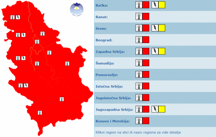 I DANAS ĆE GORETI I NEBO I ZEMLJA! Novih 40 stepeni u Srbiji, OVIM delovima zemlje preti NEVREME! Autor: Republika/J.B. Vesti 16.07.2024 08:11 Pratite nas i putem Android ili iOS aplikacija Duvaće slab do umeren vetar! Foto: RHMZ/printscreen, Shutterstock U Srbiji će danas biti pretežno sunčano i toplo vreme sa temperaturama od 16 do 40 stepeni, dok je pojava kratkotrajnih pljuskova sa grmljavinom moguća ponegde u zapadnoj polovini zemlje, saopštio je danas Republički hidrometeorološki zavod. Duvaće slab do umeren vetar, u košavskom području i jak, jugoistočni i istočni, posle podne u Vojvodini u skretanju na severozapadni pravac U Beogradu će biti pretežno sunčano i veoma toplo, sa umerenim vetrom i temperaturama od 23 do 40 stepeni. Istovremeno, RHMZ upozorava na veoma izražen toplotni talas, uz deficit padavina, koji se nastavlja i u prvoj polovini ove sedmice, kada će u većini mesta maksimalne temperature biti u intervalu od 35 do 40 stepeni uz tropske noći u urbanim sredinama. Pad temperature, navodi se, očekuje se tek od subote. Upaljen crveni meteoalarm U Srbiji je i danas na snazi crveni meteoalarm, što je najviši stepen upozorenja na opasnosti. Crveni meteoalarm upaljen je zbog veoma visokih temperatura, viših od 38 stepeni Celzijusovih, a označava veoma opasno vreme. Foto: RHMZ/printscreen U Srbiji na snazi crveni meteoalarm - Ekstremno opasni vremenski uslovi, naročito ako traje nekoliko uzastopnih dana. Ugroženi su životi životinja i ljudi ( posebno hronični bolesnici, lica pod terapijom, medicinskom kontrolom i meteoropate). Ozbiljni problemi u snabdevanju električnom energijom, problemi u saobraćaju. Ekstremno povoljni vremenski uslovi za šumske i druge požare. - Na području Bačke, Srema, Zapadne i Jugozapadne Srbije upaljen je i žuti meteoalarm, zbog grmljavinskih nepogoda, koji označava potencijalno opasno vreme. BONUS VIDEO Poštovani čitaoci, možete nas pratiti i na platformama: Facebook, Instagram, YouTube, TikTok, Telegram, Vajber. Pridružite nam se i prvi saznajte najnovije i najvažnije informacije. Naše aplikacije možete skinuti sa Google Play i Apple AppStore. Pročitajte i... Vremenska prognoza 08:11 28.06.2024 SPREMITE SE I DANAS NA PLJUSKOVE I GRMLJAVINU! Novo nevreme preti Srbiji - U BEOGRADU UPALJEN CRVENI METEOALARM, VREME JE OPASNO! Vremenska prognoza 08:01 27.06.2024 OLUJE I DANAS PRETE! ČEKA NAS SPARAN DAN SA SMENOM PLJUSKOVA I SUNČANIH INTERVALA! RHMZ izdao upozorenje ranom zorom! Poseban oprez u Beogradu! Vremenska prognoza 08:10 16.06.2024 VREMENSKA KLACKALICA! Sunčan i topao dan, a onda popodne PREOKRET - pljuskovi i grmljavina u OVIM delovima zemlje! Vremenska prognoza 08:01 15.07.2024 JOŠ JEDAN PAKLENI DAN U SRBIJI! Temperature do 40 stepeni, a EVO i kada nam stiže RASHLAĐENJE! Tagovi Vreme u Srbiji Vremenska prognoza Prognoza vremena vreme danas Pljuskovi Vrućine Grmljavina Komentari (0) Vesti Politika 15:35 OGLASIO SE MUP: Neistiniti navodi da su policijski službenici odbili da obezbeđuju Pionirski park! Politika 15:22 SVI UGLAS PROTIV NEPRAVDE: Stigla velika podrška kolega Andrijani Nešić povodom skandalozne presude - PORUKA SVIH JE ISTA! 14:43 Piletina na TURSKI NAČIN - jedan sastojak menja ukus i daje hrskavu koricu, PROBAJTE! Politika 14:37 ŠID REKAO NE BLOKADAMA: Više od 2.000 građana na skupu, blokaderi jedva okupili stotinak ljudi! Bulatović: Ovde su ljudi koji vole Srbiju! (VIDEO) 14:00 OVO JE GORE I OD LENJOSTI! Sveti Amvrosije o duhovnom stanju koje potkopava temeljnu sposobnost čoveka da stoji i pred Bogom, i pred ljudima Politika 13:47 SASTANAK SUTRA U 11.15! Vučić sa timovima za energetsku bezbednost! 13:07 SVETOGORSKI PAPRIKAŠ PO RECEPTU IGUMANA ONUFRIJA HILANDARA: Aromatično jelo koje donosi ukus monaške trpeze u vašu porodicu Društvo 12:41 "KAKVE PREVARANTKINJE, SVE U APS" Krajnje BIZARNA TUČA na Novom Beogradu - žena ustala iz invalidskih kolica i drugu počela da UDARA! (VIDEO) Politika 12:03 JOVANA JEREMIĆ KAKVU DOSAD NISTE VIDELI: Pogledajte zašto se voditeljka RAZBESNELA uživo u programu! (FOTO) Politika 11:48 VELJKOVIĆ BRANI I PRAVDA BLOKADERE! Novinar S napisao uvredljive reči za bolesnu baku koju su maltretirali u Zemunu! (FOTO) 11:25 Ovo voće ima NAJVIŠE ŠEĆERA i pazite koliko jedete! Dr Veroslava savetuje - to je MERA koju ne smete prekoračiti Politika 10:55 PROMENE U BIA: Smenjen Marko Parezanović, na njegovom mestu Nikola Vasiljević! Politika 10:52 SRAMOTA ŠTA RADE VIŠE! Blokaderka cepala TROBOJKU - njihova mržnja ide iz krajnosti u krajnost! (VIDEO) 10:37 PATRIJARH SRPSKI I ČETVORICA VLADIKA OTPUTOVALI U JORDAN NA POZIV KRALJA ABDULAHA: Put koji je važniji nego što izgleda Politika 10:20 ŠTA JE BAKA ZGREŠILA DA BI JE LEGITIMISALI?! Blokaderi napravili pakao BOLESNOJ ŽENI, u svemu učestvovala i policajka! (VIDEO) 10:08 DA LI SU NAMIRNICE KOJE SADRŽE TRAGOVE MLEKA I JAJA POSNE: Teološkinja odgovorila na najčešće postavljeno pitanje, ali i otkrila gde vernici najčešće greše Politika 10:02 POLICAJKA POZVANA NA DISCIPLINSKU ODGOVORNOST: Oglasio se MUP o legitimisanju bake u Zemunu tokom neprijavljenih blokada! Vremenska prognoza 09:53 VREMENSKI OBRT PRED NOVU GODINU: Stiglo upozorenje RHMZ i meteorologa - evo šta nas čeka! 07:30 EVO KAKO ONAJ KOJI SILAZI NAJNIŽE POSTAJE NAJVIŠI: Vladika Nikolaj otkriva šta otvara vrata nebeskih visina i unutrašnje slobode Društvo 07:00 VRŠNJAČKO NASILJE U KRALJEVU KAO POSLEDICA BLOKADERSKOG LUDILA! ČITAJTE U SRPSKOM TELEGRAFU! 06:30 VREME JE ZA DERBI: Evo gde možete pratiti meč Zvezde i Vojvodine! Vremenska prognoza 06:18 DANAS SNEG - OBUCITE SE TOPLO! Najviša dnevna temperatura 10 stepeni, u Beogradu do 8! 06:01 VERSKI KALENDAR ZA NEDELJU 7. DECEMBAR 02:01 ŠTA NAM ŠAPUĆU NEBESA I ZEMLJA: Nevidljivi glasovi koji oblikuju naš život 00:12 HILJADE LJUDI SLILO SE U SINAGOGU NA VENČANJE KOJE ĆE SE PAMTITI DECENIJAMA: Ceo grad ispunjen molitvom i muzikom 00:02 OVO JE OPASNIJE 