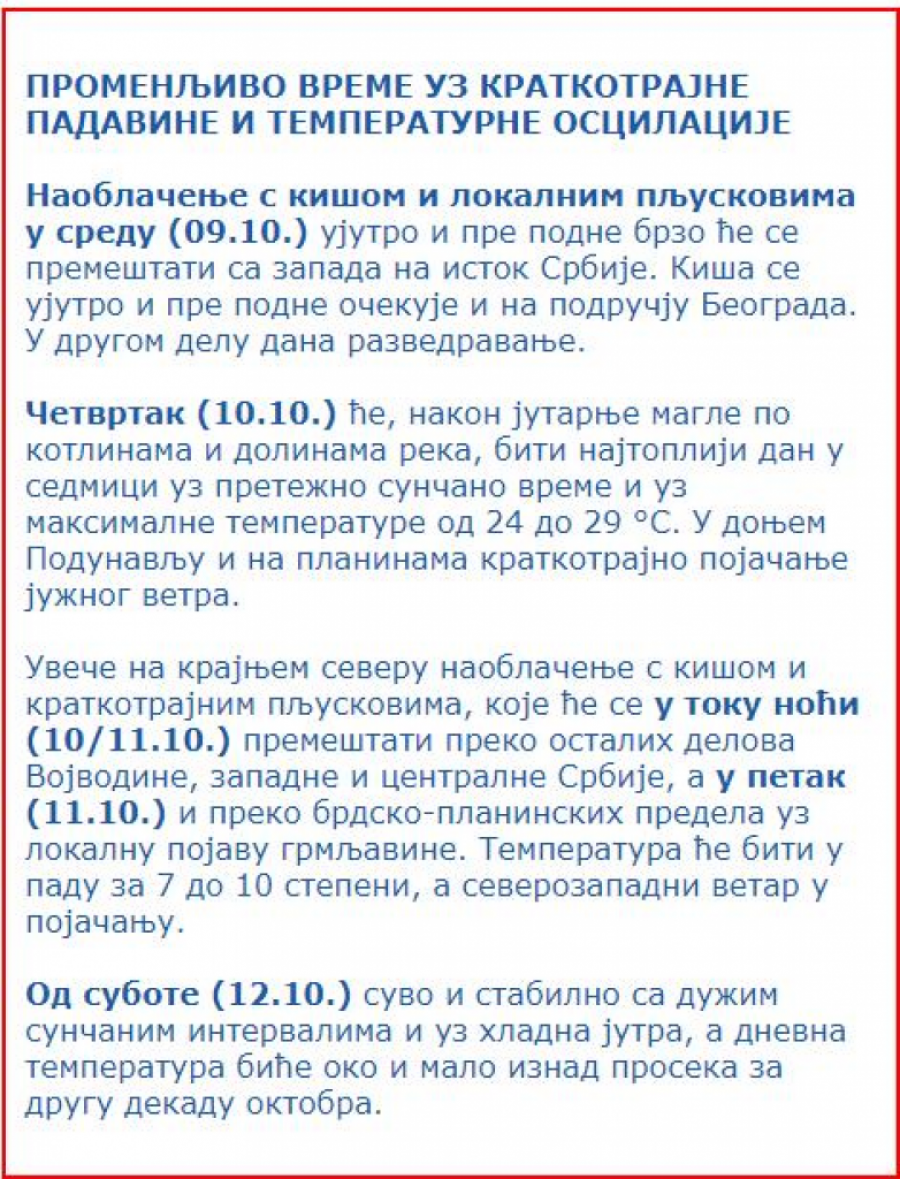 NAJNOVIJA NAJAVA RHMZ: Temperatura pada za do 10 stepeni, ovi delovi Srbije prvi na udaru pljuskova Autor: Republika/ T. J. Vesti 08.10.2024 21:33 Pratite nas i putem Android ili iOS aplikacija U donjem Podunavlju i na planinama može doći do kratkotrajnog pojačanja južnog vetra. Foto: Printscreen/SEVERE-WEATHER.EU, Shutterstock, Printscreen/Facebook/Ivan Ristić Prema najavi Republičkog hidrometeorološkog zavoda Srbije, očekuje se značajan pad temperature u narednim danima, praćen pojačanim severozapadnim vetrom. U večernjim satima i tokom noći, košavsko područje će doživeti pojačanje jugoistočnog vetra, dok se u planinskim predelima jugozapadne Srbije očekuje južni i jugozapadni vetar. Takođe, najavljeno je naoblačenje s kišom i lokalnim pljuskovima u nekim delovima Srbije, a kiša se očekuje i na području Beograda. Nakon jutarnje magle u kotlinama i dolinama reka, četvrtak će biti najtopliji dan u sedmici. Pretežno sunčano vreme će obeležiti ovaj dan, uz maksimalne temperature od 24 do 29 stepeni Celzijusa. U donjem Podunavlju i na planinama može doći do kratkotrajnog pojačanja južnog vetra. Foto: RHMZ/Printscreen U večernjim satima se očekuje naoblačenje s kišom i kratkotrajnim pljuskovima na krajnjem severu Srbije, koje će se tokom noći premeštati preko ostalih delova Vojvodine, zapadne i centralne Srbije. U petak se očekuje da će ove padavine preći i na brdsko-planinske predele, uz lokalnu pojavu grmljavine. Nakon toga, očekuje se suvo i stabilno vreme sa dužim sunčanim intervalima, uz hladna jutra. Dnevna temperatura biće oko i malo iznad proseka za drugu dekadu oktobra. Ove promene vremena mogu imati značajan uticaj na svakodnevne aktivnosti građana, posebno u saobraćaju i poljoprivredi. Građani bi trebalo da budu pažljivi prilikom kretanja na otvorenom, a poljoprivrednicima se preporučuje da preduzmu odgovarajuće mere kako bi zaštitili useve od mogućih nepovoljnih vremenskih uslova. Takođe, neophodno je prilagoditi se promenama temperature i vremenskih prilika kako bi se očuvalo zdravlje. Foto: RHMZ/Printscreen U skladu sa najavom RHMZ-a, građani Srbije trebalo bi da budu svesni promenljivih vremenskih uslova i da preduzmu odgovarajuće mere kako bi se zaštitili od mogućih nepogoda koje mogu nastupiti usled ovih promena. BONUS VIDEO Poštovani čitaoci, možete nas pratiti i na platformama: Facebook, Instagram, YouTube, TikTok, Telegram, Vajber. Pridružite nam se i prvi saznajte najnovije i najvažnije informacije. Naše aplikacije možete skinuti sa Google Play i Apple AppStore. Pročitajte i... Vremenska prognoza 07:55 02.10.2024 NOĆ DONOSI NAGLU PROMENU VREMENA! Dolaze nam crni dani, sastaviće nebo i zemlju, lošem vremenu se NE NAZIRE KRAJ Vremenska prognoza 01:11 29.09.2024 OČEKUJE SE DA ĆE PASTI DO 50 LITARA KIŠE: Srbija u vrtlogu vremenskih promena: Danas tropske temperature, a sutra drastično zahlađenje! Vremenska prognoza 07:58 05.10.2024 SRBIJO, ČUVAJ SE! Danas novi talas nepogoda: U ovom delu zemlje moguće i POPLAVE, hitno popaljeni SVI ALARMI Region 13:26 04.10.2024 POTOP U REGIONU! SNAŽNO NEVREME OPUSTOŠILO GRADOVE I JURI KA SRBIJI! IMA MRTVIH! Jezive scene iz BiH, Hrvatske i Crne Gore! (VIDEO) Tagovi RHMZ Republički hidrometeorološki zavod Srbija Zahlađenje Hladno vreme Komentari (0) Vesti Politika 08:25 SRBI OTERALI KURTIJA: Od danas ponovo odlučuju o ovim pitanjima! Društvo 07:39 POJAVILA SE ZARAZA U BEOGRADSKIM VRTIĆIMA! Ustanove roditeljima prosledile obaveštenje - CELE PORODICE OBOLELE OD INFEKCIJE! 07:30 JEDINSTVO KOJE NI ĐAVO NE MOŽE RAZBITI: Vladika Nikolaj otkriva šta nas zaista drži na okupu kad sve vuče ka podelama Beograd 06:30 MUŠKARCA (50) UBIO VOZ U ZEMUNU! Hitna pomoć zbog jedne stvari imala PUNE RUKE POSLA! Srbija 06:22 SEDAM SATI ČEKANJA NA GRANICI! Potpuni kolaps na OVIM prelazima, spremite se! Vremenska prognoza 06:05 KIŠA I OLUJNI NALETI KOŠAVE! U Srbiji danas oblačno i tmurno - EVO kada se očekuje razvedravanje! 06:01 VERSKI KALENDAR ZA PETAK 5. DECEMBAR 02:01 ZAŠTO MUSLIMANI PETKOM OSTAVLJAJU SVE I ODLAZE NA ZAJEDNIČKU MOLITVU: Tajna koja vekovima okuplja vernike 00:02 ZAŠTO SE VERNICI DANAS TOLIKO MUČE: Sveti Porfirije otkriva u čemu ljudi obično greše Društvo 00:01 DNEVNI HOROSKOP ZA 5. DECEMBAR: Rakovi ulaze u novo ljubavno poglavlje, Lavovi konačno dobijaju novac, a Strelčevi otkrivaju ko im radi iza leđa Srbija 23:00 04.12.2025 ODVEO SLOBU U HAG, PA SE SKUĆIO U HRVATSKOJ: Ovako je Karlin istražitelj Kevin Kurtis, koji je iznenada preminuo, pokušao da PONIZI Miloševića Srbija 22:46 04.12.2025 HAOS NA PUTEVIMA! Putevi Srbije izdali HITNO UPOZORENJE: Vetar nosi sve pred sobom, od magle se ništa ne vidi! NA OVIM MESTIMA JE NAJOPASNIJE! 22:23 04.12.2025 NA VRATIMA RAJA APOSTOLI RETKO PUŠTAJU, ALI LJUBAV BOGORODICE VODI MNOGE UNUTRA: Važna poruka Patrijarha na slavi manastira Vavedenje Vremenska prognoza 20:46 04.12.2025 ALARMANTNA PROGNOZA: Zima 2025. bez snega u većem delu Evrope, EVO KAKVO VREME ČEKA SRBIJU Društvo 20:30 04.12.2025 NENADIĆEV TUŽILAC STROGO POVERLJIVE PODATKE SLAO PUTEM MEJLA? Još jedan slučaj koji trese SPECIJALNO TUŽILAŠTVO Vremenska prognoza 20:04 04.12.2025 SPREMITE KIŠOBRANE! RHMZ izdao nova upozorenja! Kiša i vetar do početka nedelje, ali METEOROLOG OTKRIVA JEDNU DOBRU VEST! 19:58 04.12.2025 SA SLAVSKOM SVEĆOM NIKADA NE RADITE OVO – TO NE DONOSI BOLJITAK U KUĆI: Slobodan Vučetić otkriva kako se prave i ispravno upotrebljavaju voštanice (VIDEO) Politika 19:22 04.12.2025 NAFTE I GASA ĆE BITI, DRŽAVA MORA DA FUNKCIONIŠE NORMALNO! Vučić u Nacionalnom dnevniku saopštio dobre vesti: Lukoilu produžena licenca, evo šta nas sada čeka oko NIS Politika 19:18 04.12.2025 "TO JE OPASAN PRESEDAN, ZASTRAŠUJUĆA STVAR" Vučić o presudi Andrijani Nešić! Politika 19:13 04.12.2025 "NIJE UKRAO NI DINAR, GONE GA ZBOG POLITIKE!" Vučić o Nikoli Selakoviću! Politika 19:10 04.12.2025 VUČIĆ O ZAKONU