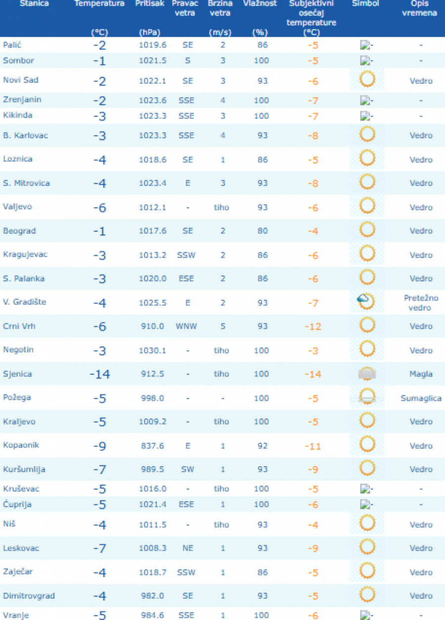 SRBIJA OSVANULA U DEBELOM MINUSU! U Sjenici čak - 14 stepeni, a EVO kakvo nas vreme očekuje tokom dana! Autor: Republika/J.B. Vesti 24.11.2024 07:06 Pratite nas i putem Android ili iOS aplikacija Upaljen i meteoalarm! Foto: ST/Vladimir Lukić Ujutru će biti hladno sa slabim i umerenim mrazem, a tokom dana pretežno sunčano i toplije, saopštio je Republički hidrometeorološki zavod. Duvaće slab do umeren južni vetar. Najniža temperatura od -9 do 0 stepeni Celzijusovih, a najviša od 4 do 11 stepeni. Vreme u Beogradu U Beogradu jutro će biti hladno sa slabim mrazem. Tokom dana biće pretežno sunčano i toplije. Duvaće slab do umeren, južni vetar. Najniža temperatura od -3 do 0 stepeni Celzijusovih, a najviša oko 11 stepeni. Srbija u žutom Zbog niskih temperatura, ali i poledice i zaleđivanja mokrih površina, u Srbiji je upaljen žuti meteoalarm i to na teritoriji cele zemlje. Temperature od - 5 °C i niže prognozirane su tokom jutra za veći deo Srbije. Foto: RHMZ/printscreen Žuti meteoalarm u Srbiji - Prognozirana minimalna temperatura vazduha nije neuobičajena ali preduzmite neophodne mere zaštite za aktivnosti na otvorenom prostoru. Posebno su opasna jezera hladnog vazduha i duža zadržavanja u njima.Problemi u snabdevanju toplotne i električne energije. Rizik od zaleđivanja česmi i instalacija za vodu. Nepovoljni vremenski uslovi za hronične bolesnike, ljude pod terapijom, medicinskom kontrolom ili meteoropate - objašnjava RHMZ. Srbija osvanula u debelom minusu U 5 sati jutros cela Srbija je bila u minusu. Najhladnije je u Sjenici, gde je izmereno - 14 °C, dok su Beograd i Sombor najtopliji sa - 1 ° C. Foto: RHMZ/printscreen Minus u celoj zemlji Vreme narednih dana Početkom sledeće sedmice ujutru se očekuje mestimično slab i umeren mraz. Tokom dana biće pretežno sunčano. U utorak posle podne i uveče uslediće umereno naoblačenje. Zatim će do kraja perioda biti umereno do potpuno oblačno sa čestom pojavom kiše, a od petka hladnije, pa se u brdsko-planinskim predelima očekuje sneg. BONUS VIDEO Poštovani čitaoci, možete nas pratiti i na platformama: Facebook, Instagram, YouTube, TikTok, Telegram, Vajber. Pridružite nam se i prvi saznajte najnovije i najvažnije informacije. Naše aplikacije možete skinuti sa Google Play i Apple AppStore. Pročitajte i... Vremenska prognoza 07:10 09.11.2024 SRBIJA OSVANULA U MINUSU! Popodne će nas ogrejati zubato sunce! Srbija 08:33 21.11.2024 SNEG DO KOLENA, A ONI SEDE U MAJICAMA! Slika iz Sjenice napravila pometnju na društvenim mrežama! (FOTO) Vremenska prognoza 07:13 17.11.2024 UJUTRU MRAZ I MAGLA, TEMPERATURA U MINUSU! Od sutra prava vremenska klackalica! Vremenska prognoza 07:03 16.11.2024 MAGLA I OBLACI UJUTRU, POPODNE RAZVEDRAVANJE! Evo kakvo nas vreme očekuje od ponedeljka! Tagovi Vreme vreme danas vreme danas u srbiji Vremenska prognoza Prognoza vremena Mraz Minus Prethodna vest Sledeća vest Komentari (0) Vesti 00:06 AKO OVO UČINITE SVAKOG JUTRA, NE BRINITE ZA OSTATAK DANA: Sveti Nektarije otkriva kako da prizovemo blagodat koja će da nas prati do večeri Društvo 00:05 HOROSKOP ZA 21. DECEMBAR: Ribe - izlazite uspešno na kraj sa svim izazovima, Blizanci - kontrolišite impulsivnost! Politika 23:54 20.12.2025 NEZAPAMĆENI SKANDAL NA KOSOVU I METOHIJI! SRBIN UHAPŠEN U SOPSTVENOM DOMU: Kurtijevi satrapi mu pretresala kuću, porodicu izložili brutalnom stresu! 23:21 20.12.2025 DETINJCI, MATERICE I OCI - PRAZNICI KOJE MNOGI SLAVE, A RETKO KO ZAISTA RAZUME: Otac Dušan objašnjava zašto se pred Božić vezuju deca, majke i očevi 22:10 20.12.2025 Kako je proslavljen Nikoljdan u Istočnom Sarajevu Društvo 22:00 20.12.2025 HRABROG PILOTA SLOMILA KOŠAVA! Kako je na polju ispod Kalemegdana tragično nastradao beogradski Ikar Politika 21:54 20.12.2025 "SRBIJA NIJE I NEĆE BITI NIČIJA MARIONETA"! Oglasio se Vučić jakom porukom: "NAŠA SLOBODARSKA POLITIKA SE NE SVIĐA NIKOME"! (FOTO) Društvo 20:58 20.12.2025 HAOS NA AUTO-PUTU KA NIŠU! Stotine vozila zaglavljeno satima u koloni! 20:47 20.12.2025 KRSNA SLAVA NE POČINJE ZA TRPEZOM: Patrijarh Porfirije istakao da proslavljanje zaštitnika porodice nije običaj, već put kojim se hoda 20:36 20.12.2025 TAMARA VUČIĆ dokazala da je mala crna haljina idealna za svaku priliku - čipka i crveni karmin i praznici mogu da počnu! 20:11 20.12.2025 Iznenada ste ostali BEZ DAHA: Ovaj simptom mnogi pripisuju umoru, ali zapravo zahteva hitnu reakciju! Politika 20:00 20.12.2025 ŠOKANTNO! Poznati nemački novinar otkrio gorku istinu: "EU NEĆE PRIMITI NIKOG"! 19:40 20.12.2025 NJEGA SU PROSLAVILE ISCELITELJSKE MOĆI: SPC sutra slavi Prepodobnog Patapija Vremenska prognoza 18:55 20.12.2025 HITNO UPOZORENJE KOJE SE NE SME IGNORISATI! Pogledajte šta nas čeka ove večeri i sutra, skoro cela zemlja pod žutim alarmom! RHMZ izdao uputstvo za postupanje u RIZIČNIM USLOVIMA! 18:51 20.12.2025 KO OVO URADI U CRKVI, S VEĆIM GREHOM IZ NJE IZLAZI NEGO ŠTO JE U NJU UŠAO: Otac Vasilije otkriva šta Bog ne oprašta Politika 18:43 20.12.2025 STIŽE ZIMA, A ON NESREĆNI BEZ PARA ZA NOVI! Đilas opet glumi žrtvu i kuka da mu se vrati džemper! Društvo 18:19 20.12.2025 "VAKAT TI SE ŽENITI, ALENE" : Bilbord u Blažuju kod Sarajeva iznenadio ceo region, društvo traži saputnicu za ortaka 17:32 20.12.2025 Ovu hranu jedemo svakog dana, a ona nam RAZARA MOZAK: Razmislite dva puta da li ćete nastaviti! Društvo 16:51 20.12.2025 ŠTA JE TRIHINELOZA, KOJI SU SIMPTOMI I KAKO SE LEČI: Čak 17 ljudi u Pančevu otrovano u jednom danu! 15:14 20.12.2025 “OSTAVITE ČOVEKA NA MIRU!”: Otac Stefan poručuje da je Vujadin Savić sve što je trebao, rešio sa ženom, decom i svojim duhovnikom Vremenska prognoza 14:12 20.12.2025 STIŽU CRNI OBLACI U SRBIJU! Jedna pojava parališe celu zemlju, a temperatura ide i u minus! Društvo 14:01 20.12.2025 SPEKULACIJE O MASOVNOM POMORU ŽIVOTINJA UZDRMALE JAVNOST, INSPEKCIJA NA TERENU: Evo šta su zatekli u zoo-vrtu na Paliću 14:00 20.12.202
