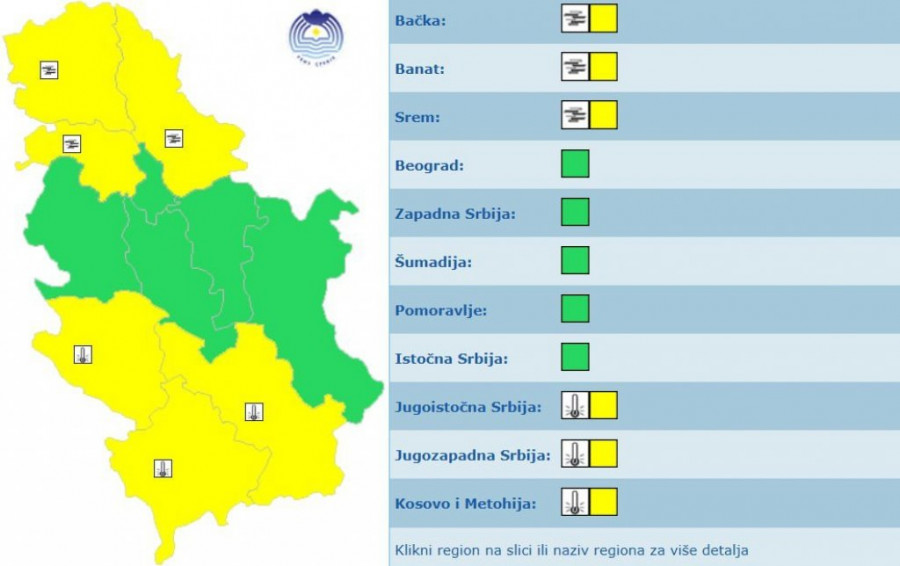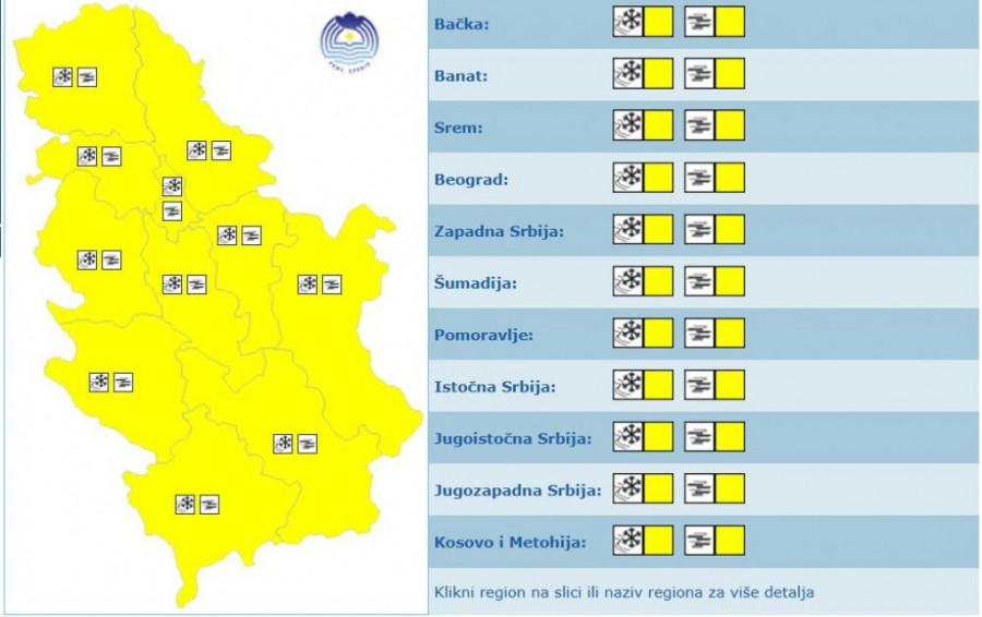 ZA NOVU GODINU SE PALI METEOALARM NA TERITORIJI CELE SRBIJE! Dve pojave će napraviti TOTALNI HAOS, a temperatura odlazi u MINUS! (FOTO) Autor: Republika/J.B. Vesti 30.12.2024 11:59 Pratite nas i putem Android ili iOS aplikacija Evo kakvo nas vreme očekuje za sutrašnji praznik! Foto: shutterstock Jutros je u Srbiji bio mraz i poledica. Na području Bačke, severnog i srednjeg Banata, kao i po pojedinim kotlinama, dolinama reka i visoravnima magla je smanjivala vidlјivost na 100 do 300 m, lokalno i manje. Danas tokom dana pretežno sunčano, osim na severu Vojvodine gde će se magla zadržati i duže tokom dana. Vreme za Novu godinu Slično vreme zadržaće se i sutra, poslednjeg dana ove godine - po kotlinama, dolinama reka i u nižim predelima maglovito i tmurno uz slab do umeren mraz i poledicu usled zaleđivanja mokrih površina. U brdsko-planinskim predelima pretežno sunčano. Minimalna temperatura u većini mesta od -5 do 0 °C, lokalno i niža, a najviša od 3 do 8 °C, u maglovitim oblastima oko 0 °C, a u Negotinskoj Krajini do 12 °C. Srbija u žutom Zbog poledice i mraza, kao i zbog magle, u celoj Srbiji će sutra biti upaljen žuti meteoalarm. - Problemi u saobraćaju i transportu (poledica na putevima). Nepovoljan uticaj zaleđivanja na dalekovode (vodovi za prenos električne energije), električnu železnicu, žičare, TV tornjeve i druge antenske stubove - navodi se kao uticaj poledice. Foto: RHMZ Žuti meteoalarm za Novu godinu Magla će smanjivati vidljivost na manje od 200 metara. Vreme u januaru 1. i 2. januara 2025. pretežno sunčano uz porast temperature. I prvog dana nove 2025. godine biće upaljen žuti meteoalarm, u celoj zemlji, osim u Istočnoj, Zapadnoj Srbiji, Pomoravlju, Beogradu i Šumadiji. Foto: RHMZ Žuti meteoalarm prvog dana nove godine U petak 3. januara na severu, a od subote 4. januara i u ostalim predelima umereno do potpuno oblačno, mestimično s kišom i snegom. BONUS VIDEO Poštovani čitaoci, možete nas pratiti i na platformama: Facebook, Instagram, YouTube, TikTok, Telegram, Vajber. Pridružite nam se i prvi saznajte najnovije i najvažnije informacije. Naše aplikacije možete skinuti sa Google Play i Apple AppStore. Pročitajte i... Beograd 09:40 30.12.2024 U NOVOGODIŠNJOJ NOĆI POTPUNA OBUSTAVA SAOBRAĆAJA NA MOSTU "GAZELA": Ovo je razlog! Društvo 09:37 30.12.2024 VOZAČI, OPREZ! Tokom praznika pojačana saobraćajna kontrola, OVE dve stvari će se najviše proveravati! Beograd 10:26 30.12.2024 TRADICIONALNO! I ovog 1. januara manifestacija "ULICA OTVORENOG SRCA" u Beogradu i ostalim gradovima! Beograd 10:11 30.12.2024 EVO KAKO RADE BEOGRADSKE PIJACE ZA PRAZNIKE: Neke rade, čak i 1. januara od 6 ujutru! Tagovi Nova godina nova godina doček nova godina 2025. Nova godina 2025 vreme za novu godinu vremenska prognoza za novu godinu prognoza za novu godinu Mraz Poledica prognoza vremena za novu godinu Komentari (0) Vesti Društvo 08:48 PONEDELJAK - SINONIM ZA SAOBRAĆAJNI KOLAPS! Gde god da su krenuli ovog jutra su svi kasnili! (FOTO) Vremenska prognoza 08:18 STABILNO JOŠ PARA DANA, A ONDA SLEDI POTPUNA PROMENA! Ledeni talas stiže u Srbiju, posle Svetog Nikole ciča zima! Politika 07:50 JOŠ JEDAN SASTANAK SA TIMOVIMA ZA ENERGETIKU! Tačno u 11:15! Glavna tema na stolu - bezbednost i stabilnost zemlje! 07:30 KOJU MOĆ NOSI SVAKI DAR DUHA SVETOGA U CRKVI: Vladika Nikolaj otkriva Kako službe i zvanja oblikuju život svakog vernog pojedinca Politika 07:00 SAZNAJEMO! PROMENE U BIA, ROTACIJA NA ČELU OPERATIVE! ČITAJTE U SRPSKOM TELEGRAFU! Društvo 06:42 VELIKA OBNOVA PANČEVAČKOG MOSTA! Zna se kada kreću radovi, i šta će sve da se menja! Društvo 06:22 ČEKANJE NA OVOM GRANIČNOM PRELAZU I DO 4 SATA! Vozači, ukoliko krećete na put ovo morate da znate! Društvo 06:11 BEZ STRUJE U OVIH 6 BEOGRADSKIH OPŠTINA: Proverite gde je neće biti čak 18 sati, prva isključenja već u 8 časova! 06:01 VERSKI KALENDAR ZA PONEDELJAK 8. DECEMBAR 02:01 TAJNE PREVAZILAŽENJA STRESA I NESIGURNOSTI KOJE PRIMENJUJU USPEŠNI: Evo kako pretvoriti teškoće u lekcije i unutrašnju otpornost 00:36 OVO JE PET NAJVEĆIH STRAHOVA KOJI MLADE SPREČAVAJU DA OSNUJU PORODICU: Protinica Olga otkriva kako prevazići ove prepreke 00:02 ŠTA KADA NE RAZUMEMO REČI IZ CRKVENIH KNJIGA: Ovo jednostavno objašnjenje Prepodobnog Amvrosija Optinskog može promeniti sve Društvo 00:01 HOROSKOP ZA 8. DECEMBAR: Ovnovi - uspeh uprkos svim poteškoćama, Škorpije - neke tajne će biti otkrivene! Društvo 23:00 07.12.2025 JEDNOM ĆU UKROTITI TU SNAGU! Tesla predstavljen u čuvenom SMITSONIJANU! NAŽALOST, I OVDE U SENCI EDISONA I VESTINGHAUSA! Društvo 22:40 07.12.2025 ČETIRI DANA ZA NJOM SE TRAGALO, A EVO I GDE JE BILA! Pronađena nestala devojčica iz Smedereva! Politika 22:08 07.12.2025 "VUČIĆ JE KRIV ZA SVE NA OVOM SVETU!" Blokadersko ludilo bez granica: Od kiše do superćelijske oluje, sve je predsednikova greška! (VIDEO) Društvo 21:44 07.12.2025 HRISTINA U NOVOM SADU PROŠLA KROZ PODSTANARSKI PAKAO! Stan pun buđi i štroke, a gazda joj nije dozvolio da izađe iz njega! MORALA DA ANGAŽUJE ADVOKATA! 20:55 07.12.2025 DA LI JE GREH NOSITI TUĐI KRST: Otac Vladimir jasno odgovara na nedoumicu mnogih vernika koji ovaj simbol hrišćanstva nose oko vrata 20:06 07.12.2025 PROVEO 28 GODINA PO TAMNICAMA I NA MUKAMA, A POTOM I UBIJEN U CRKVI DOK JE BOGOSLUŽIO: Sutra je Sveti Sveštenomučenik Kliment Politika 20:00 07.12.2025 HRVATSKE ZVERI PRE 34 GODINE MUČKI POGUBILE PORODICU ZEC! Godišnjica zločina koji jasno pokazuje prirodu zla na kojem je nastala Tuđmanova država! 19:20 07.12.2025 BEZ STRUJE, SA SUZAMA U OČIMA: Liturgija uz agregat u kosovskom selu Koš u koje se vratilo dvadesetak prognanih Srba Srbija 19:02 07.12.2025 ČEKA SE DO TRI SATA NA OVOM GRANIČNOM PRELAZU! Ovde su malo manje gužve od "SAMO" DVA SATA Politika 18:24 07.12.2025 "IZDAJA NARODA I DRŽAVE JE NEOPROSTIV GREH!" Vučević: Kao pravoslavni hrišćanin, nisam sudija, ali kod izdaje nema kom