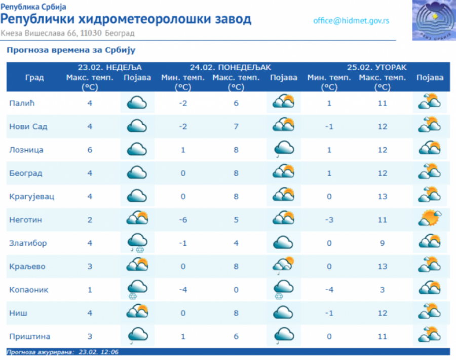 SNEG ĆE ZATRPATI OVE DELOVE SRBIJE! Hitno se oglasio RHMZ! USKORO PREOKRET, TEMPERATURA NAGLO SKAČE ZA 15 STEPENI! Autor: Republika Vesti 23.02.2025 17:29 Pratite nas i putem Android ili iOS aplikacija Narednih dana očekuje se promenljivo vreme, sa izmeničnim sunčanim i oblačnim intervalima Foto: Tanjug/AP Photo/Martin Meissner, Shutterstock/marchevcabogdan, freesvg.org Vreme Republički hidrometeorološki zavod Srbije (RHMZ) upozorio je da se danas očekuje umereno do potpuno oblačno vreme, s suvim vremenom u većem delu zemlje. Ipak, jugozapadni, centralni i jugoistočni delovi Srbije mogu očekivati povremenu pojavu slabe kiše. U toku noći, u južnijim krajevima zemlje moguće su mešovite padavine, uključujući kišu, susnežicu i sneg, uz mogućnost pojave poledice. Prognoza za narednu sedmicu Narednih dana očekuje se promenljivo vreme, sa izmeničnim sunčanim i oblačnim intervalima, uz lokalne kratkotrajne padavine. Temperature će biti u porastu, a za ponedeljak se prognozira umereno do potpuno oblačno i malo toplije vreme. Slaba kiša moguća je na zapadu, jugozapadu i jugu Srbije, dok će u brdsko-planinskim predelima biti susnežice i snega, uz pojavu poledice u jutarnjim satima. Foto: Printscreen/RHMZ Detaljna prognoza za naredne dane Utorak i sreda biće uglavnom suvi, dok se u sredu popodne i uveče očekuje kiša na zapadu i jugozapadu Srbije, kao i na zapadu Vojvodine. Od četvrtka padavine će se proširiti na pojedine delove zemlje, a na visokim planinama moguć je i slab sneg. Maksimalne dnevne temperature kretaće se između 10 i 17 °C. S obzirom na najnoviju prognozu RHMZ-a, građani Srbije mogu očekivati promenljivo vreme u narednim danima, sa mogućim padavinama i porastom temperatura. Važno je obratiti pažnju na upozorenja i preporuke nadležnih institucija kako bi se adekvatno pripremili za sve vremenske prilike. Poštovani čitaoci, možete nas pratiti i na platformama: Facebook, Instagram, YouTube, TikTok, Telegram, Vajber. Pridružite nam se i prvi saznajte najnovije i najvažnije informacije. Naše aplikacije možete skinuti sa Google Play i Apple AppStore. Tagovi Vremenska prognoza Sneg u Beogradu sneg u Srbiji Sneg Srbija Vreme Komentari (0) Vesti Društvo 09:10 Naslov: Pomozimo Luki slanjem 306 na 2407 Društvo 09:04 VAŽNA VEST ZA SVE RODITELJE: Prijave za besplatne novogodišnje paketiće i u ponedeljak! Politika 09:01 PIPER RASKRINKAO PAKLENI PLAN MILOŠA JOVANOVIĆA: Učestvovaće na izborima, potpisaće zapisnik, a onda će reći da ih NE PRIZNAJE! Društvo 08:57 GUŽVE NA GRANICAMA SVE VEĆE: Novi EU sistem produžava čekanja, vozači u problemu! Društvo 08:37 SNEG NEĆEMO VIDETI OVOG DECEMBRA? Iznenađujuća izjava meteorologa! Društvo 08:36 ZA DOČEK DERU KOŽU S LEĐA! Nova godina i do 500 evra po osobi u Beogradu, evo kakve su cene u Srbiji! Politika 08:25 SRBI OTERALI KURTIJA: Od danas ponovo odlučuju o ovim pitanjima! Društvo 07:39 POJAVILA SE ZARAZA U BEOGRADSKIM VRTIĆIMA! Ustanove roditeljima prosledile obaveštenje - CELE PORODICE OBOLELE OD INFEKCIJE! 07:30 JEDINSTVO KOJE NI ĐAVO NE MOŽE RAZBITI: Vladika Nikolaj otkriva šta nas zaista drži na okupu kad sve vuče ka podelama Beograd 06:30 MUŠKARCA (50) UBIO VOZ U ZEMUNU! Hitna pomoć zbog jedne stvari imala PUNE RUKE POSLA! Srbija 06:22 SEDAM SATI ČEKANJA NA GRANICI! Potpuni kolaps na OVIM prelazima, spremite se! Vremenska prognoza 06:05 KIŠA I OLUJNI NALETI KOŠAVE! U Srbiji danas oblačno i tmurno - EVO kada se očekuje razvedravanje! 06:01 VERSKI KALENDAR ZA PETAK 5. DECEMBAR 02:01 ZAŠTO MUSLIMANI PETKOM OSTAVLJAJU SVE I ODLAZE NA ZAJEDNIČKU MOLITVU: Tajna koja vekovima okuplja vernike 00:02 ZAŠTO SE VERNICI DANAS TOLIKO MUČE: Sveti Porfirije otkriva u čemu ljudi obično greše Društvo 00:01 DNEVNI HOROSKOP ZA 5. DECEMBAR: Rakovi ulaze u novo ljubavno poglavlje, Lavovi konačno dobijaju novac, a Strelčevi otkrivaju ko im radi iza leđa Srbija 23:00 04.12.2025 ODVEO SLOBU U HAG, PA SE SKUĆIO U HRVATSKOJ: Ovako je Karlin istražitelj Kevin Kurtis, koji je iznenada preminuo, pokušao da PONIZI Miloševića Srbija 22:46 04.12.2025 HAOS NA PUTEVIMA! Putevi Srbije izdali HITNO UPOZORENJE: Vetar nosi sve pred sobom, od magle se ništa ne vidi! NA OVIM MESTIMA JE NAJOPASNIJE! 22:23 04.12.2025 NA VRATIMA RAJA APOSTOLI RETKO PUŠTAJU, ALI LJUBAV BOGORODICE VODI MNOGE UNUTRA: Važna poruka Patrijarha na slavi manastira Vavedenje Vremenska prognoza 20:46 04.12.2025 ALARMANTNA PROGNOZA: Zima 2025. bez snega u većem delu Evrope, EVO KAKVO VREME ČEKA SRBIJU Vremenska prognoza 20:04 04.12.2025 SPREMITE KIŠOBRANE! RHMZ izdao nova upozorenja! Kiša i vetar do početka nedelje, ali METEOROLOG OTKRIVA JEDNU DOBRU VEST! 19:58 04.12.2025 SA SLAVSKOM SVEĆOM NIKADA NE RADITE OVO – TO NE DONOSI BOLJITAK U KUĆI: Slobodan Vučetić otkriva kako se prave i ispravno upotrebljavaju voštanice (VIDEO) Politika 19:22 04.12.2025 NAFTE I GASA ĆE BITI, DRŽAVA MORA DA FUNKCIONIŠE NORMALNO! Vučić u Nacionalnom dnevniku saopštio dobre vesti: Lukoilu produžena licenca, evo šta nas sada čeka oko NIS Politika 19:18 04.12.2025 "TO JE OPASAN PRESEDAN, ZASTRAŠUJUĆA STVAR" Vučić o presudi Andrijani Nešić! Politika 19:13 04.12.2025 "NIJE UKRAO NI DINAR, GONE GA ZBOG POLITIKE!" Vučić o Nikoli Selakoviću! Politika 19:10 04.12.2025 VUČIĆ O ZAKONU O "LEGALIZACIJI": Važno je da imate ličnu kartu i bilo kakav ugovor čime dokazujete svoje vlasništvo, sve je elektronski! Politika 19:06 04.12.2025 "NISAM MOGAO DA VERUJEM" Vučić pokazao kako sada izgleda EKSPO: Završavamo celu trasu pruge, niče čitav novi grad! Politika 18:54 04.12.2025 VUČIĆ PONOSAN NA DRŽAVU: Spustili smo inflaciju, penzije podigli dramatično! Politika 18:44 04.12.2025 OGLASILA SE ASOCIJACIJA NOVINARA SRBIJE: Nedopustive pretnje novinarima Kurira - Traži se hitna istraga! Politika 18:31 04.12.2025 UZURPIRALI SU DEO DRŽAVNOG SISTEMA! Ministar Selaković posle saslušanju u JTOK: "Oni su ne samo kr