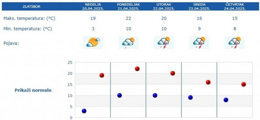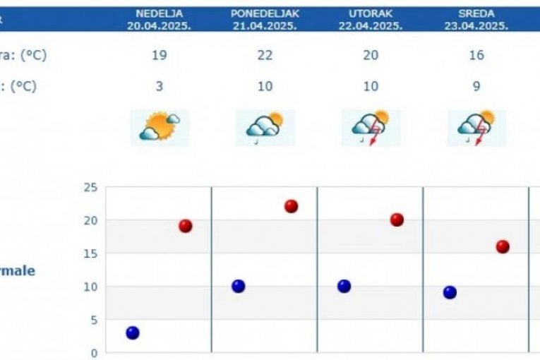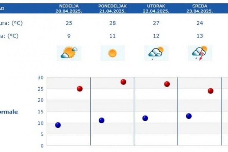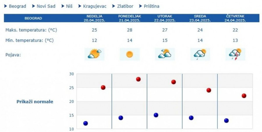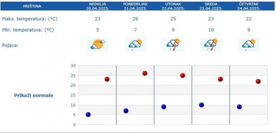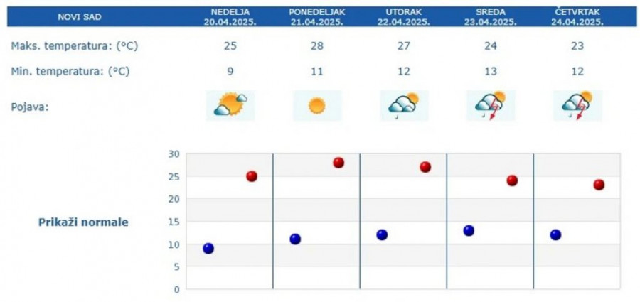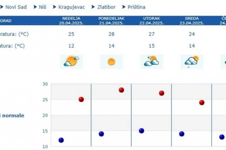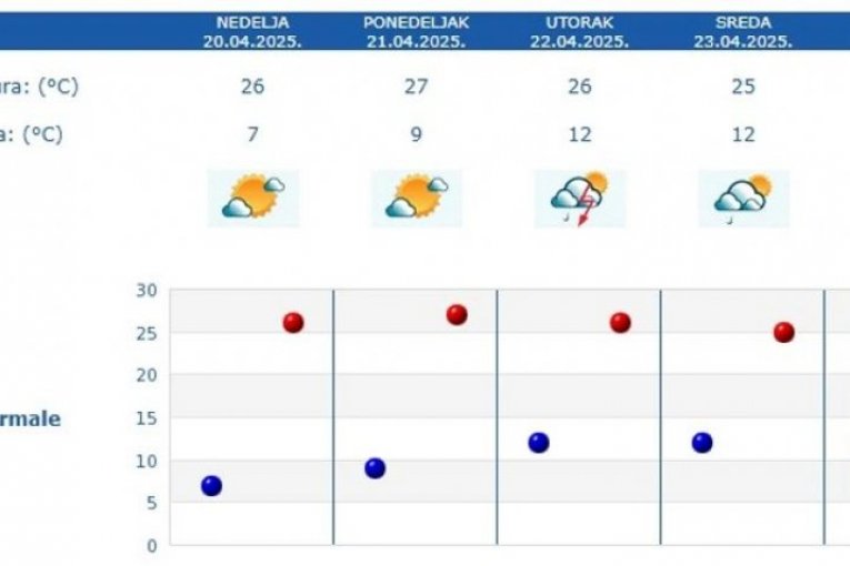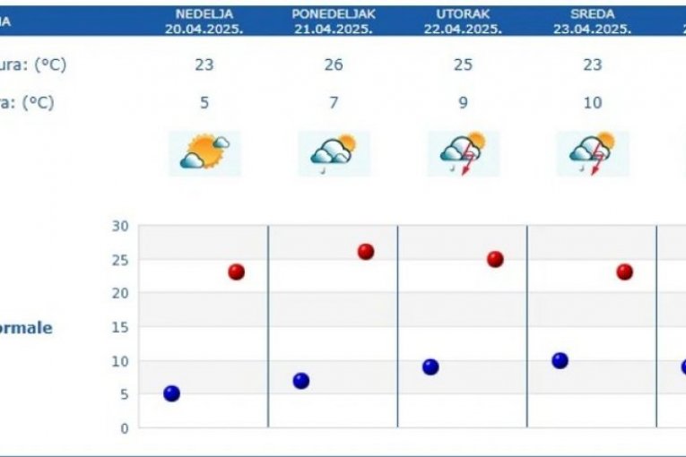 EVO KAD STIŽE NEVREME U SRBIJU: Tačno ovog datuma zahlađenje i padavine dolaze u našu zemlju! (FOTO) Autor: Republika/ T. J. Vesti 19.04.2025 14:01 Pratite nas i putem Android ili iOS aplikacija RHMZ upozorava na čestu pojavu kratkotrajne kiše i pljuskova sa grmljavinom. Foto: Shutterstock U nedelju, kada se proslavlja Uskrs, i u ponedeljak, očekuje se pretežno sunčano i toplo vreme. Maksimalna temperatura će se kretati između 24 i 28 stepeni Celzijusa. Na jugozapadu i jugu naše zemlje, međutim, tokom ponedeljka posle podne i uveče, moguća je pojava lokalnog razvoja oblačnosti uz kratkotrajne kiše ili pljuskove, koji bi mogli biti praćeni i grmljavinom. Ova vremenska pojava donosi osveženje, ali i nagoveštava promenljivost koja nas očekuje u danima koji dolaze. Od utorka se najavljuje promenljivo i nestabilno vreme. RHMZ upozorava na čestu pojavu kratkotrajne kiše i pljuskova sa grmljavinom. U prvoj polovini sledeće sedmice, pljuskovi sa grmljavinom očekuju se najpre u južnim i jugozapadnim delovima Srbije. Ova dramatična promena vremenskih prilika donosi novi izazov za građane, koji će morati da budu spremni na nepredvidivo vreme. Pogledajte prognozu za 5 dana po gradovima: RHMZ/printscreen RHMZ/printscreen RHMZ/printscreen RHMZ/printscreen RHMZ/printscreen RHMZ/printscreen Meteorolog Ivan Ristić je naglasio da nas prema njegovim proračunima krajem aprila i početkom maja očekuje zahlađenje. Iako do kraja aprila temperature neće previše pasti, u drugoj polovini nedelje, pred prvomajske praznike, može doći do naglog pada temperature, koja bi mogla opasti na 14 do 18 stepeni. Ova informacija je posebno važna za sve one koji planiraju aktivnosti na otvorenom tokom praznika, jer nestabilno vreme može doneti kišu i pljuskove. -U nedelju, za Uskrs, ponedeljak i utorak maksimalna temperatura će biti do 27 stepeni, u drugoj polovini sledeće nedelje očekuje se nestabilno povremeno sa kišom, pljuskovima kiše i grmljavinom i postepenim padom temperatura koje će krajem aprila i početkom maja biti ispod normale za ovo doba godine i kretaće se od 14 do 18 stepeni – kaže Ivan Ristić za „Blic“. Foto: Republika Ivan Ristić Ristić upozorava na mogućnost prodora hladnijeg vazduha preko "bečkih vrata", što dodatno naglašava neizvesnost vremenskih prilika za predstojeće dane. S obzirom na to da su maj i juni meseci poznati po kišovitosti, očekuje se da će se i u narednim nedeljama nastaviti sa smenama sunca i oblaka, uz povremene padavine. Poštovani čitaoci, možete nas pratiti i na platformama: Facebook, Instagram, YouTube, TikTok, Telegram, Vajber. Pridružite nam se i prvi saznajte najnovije i najvažnije informacije. Naše aplikacije možete skinuti sa Google Play i Apple AppStore. Pročitajte i... Vremenska prognoza 20:45 26.03.2025 "IMAM DOBRU I LOŠU VEST": Zabrinjavajuće upozorenje meteorologa, zbog ogromnih padavina narednih dana SRBIJI PRETI KATASTROFA Vremenska prognoza 21:13 24.03.2025 "TRI DANA SKORO NEĆEMO VIDETI SUNCE": Alarmantno upozorenje meteorologa na PRLJAVE KIŠE I SNEG Vremenska prognoza 22:18 17.04.2025 OVDE VEĆ PLJUŠTI: Evo kojim sve delovima Srbije NOĆAS PRETI NEVREME Vremenska prognoza 11:56 13.04.2025 STIŽE NAM PESAK IZ SAHARE KOJI MOŽE DA STVORI VELIKE PROBLEME PO ZDRAVLJE! Ivan Ristić za Republiku upozorava na ovu pojavu, ali i otkriva da li nam stiže i prolepšanje vremena! (MAPA) Tagovi Nevreme Srbija Kiša Zahlađenje Ivan Ristić Meteorolog bečka vrata Komentari (0) Vesti Društvo 16:52 NESTALA MAGDALENA (16) IZ SMEDEREVA! Očajni otac Nikola već ČETIRI DANA I NOĆI TRAGA ZA ĆERKOM Vremenska prognoza 16:32 ARKTIČKI HLADNI TALAS PRETI EVROPI: Stručnjaci upozoravaju na moguću „zimu veka“? Srbija 16:26 SNIMLJENA DIVLJA ŽIVOTINJA NA ULICAMA NOVOG SADA! Prenose mnoge viruse, a stručnjaci tvrde da ne napadaju "POD USLOVOM DA SU ZDRAVE" (VIDEO) Društvo 16:15 SEKTE PREKO INTERNETA VRBUJU SRPSKU DECU! Traže porodične tajne i fotografije, pa ucenjuju mališane! Zloglasna "MREŽA 764" prisutna u regionu! 16:14 OVO MALO LJUDI RADI, A NIŠTA BOLJE OD TOGA NE JAČA DUH: Otac Benedikt o najboljem načinu za prevazilaženje problema koje retko ko primenjuje Politika 15:35 OGLASIO SE MUP: Neistiniti navodi da su policijski službenici odbili da obezbeđuju Pionirski park! Politika 15:22 SVI UGLAS PROTIV NEPRAVDE: Stigla velika podrška kolega Andrijani Nešić povodom skandalozne presude - PORUKA SVIH JE ISTA! 14:43 Piletina na TURSKI NAČIN - jedan sastojak menja ukus i daje hrskavu koricu, PROBAJTE! Politika 14:37 ŠID REKAO NE BLOKADAMA: Više od 2.000 građana na skupu, blokaderi jedva okupili stotinak ljudi! Bulatović: Ovde su ljudi koji vole Srbiju! (VIDEO) 14:00 OVO JE GORE I OD LENJOSTI! Sveti Amvrosije o duhovnom stanju koje potkopava temeljnu sposobnost čoveka da stoji i pred Bogom, i pred ljudima Politika 13:47 SASTANAK SUTRA U 11.15! Vučić sa timovima za energetsku bezbednost! 13:07 SVETOGORSKI PAPRIKAŠ PO RECEPTU IGUMANA ONUFRIJA HILANDARA: Aromatično jelo koje donosi ukus monaške trpeze u vašu porodicu Društvo 12:41 "KAKVE PREVARANTKINJE, SVE U APS" Krajnje BIZARNA TUČA na Novom Beogradu - žena ustala iz invalidskih kolica i drugu počela da UDARA! (VIDEO) Politika 12:03 JOVANA JEREMIĆ KAKVU DOSAD NISTE VIDELI: Pogledajte zašto se voditeljka RAZBESNELA uživo u programu! (FOTO) Politika 11:48 VELJKOVIĆ BRANI I PRAVDA BLOKADERE! Novinar S napisao uvredljive reči za bolesnu baku koju su maltretirali u Zemunu! (FOTO) 11:25 Ovo voće ima NAJVIŠE ŠEĆERA i pazite koliko jedete! Dr Veroslava savetuje - to je MERA koju ne smete prekoračiti Politika 10:55 PROMENE U BIA: Smenjen Marko Parezanović, na njegovom mestu Nikola Vasiljević! Politika 10:52 SRAMOTA ŠTA RADE VIŠE! Blokaderka cepala TROBOJKU - njihova mržnja ide iz krajnosti u krajnost! (VIDEO) 10:37 PATRIJARH SRPSKI I ČETVORICA VLADIKA OTPUTOVALI U JORDAN NA POZIV KRALJA ABDULAHA: Put koji je važniji nego što iz