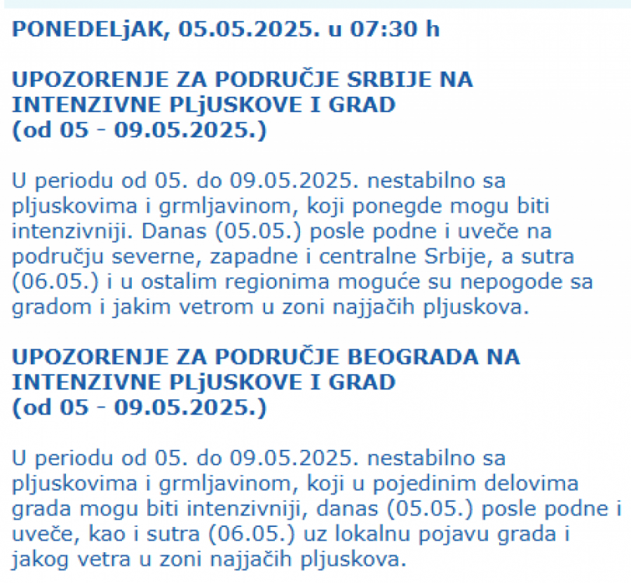 RHMZ IZDAO HITNO UPOZORENJE! Pašće velika količina kiše, a U OVIM DELOVIMA ZEMLJE JE MOGUĆ I GRAD! Autor: Republika/J.B. Vesti 05.05.2025 07:47 Pratite nas i putem Android ili iOS aplikacija Ovo pogoršanje vremena označava početak novog nestabilnog perioda. Foto: shutterstock, RHZ/printscreen Republički hidrometeorološki zavod (RHMZ) upozorio je da se danas, u ponedeljak 5. maja, očekuju izražene vremenske nepogode u pojedinim delovima Srbije. Iako je jutro počelo uz promenljivo oblačno vreme i kratkotrajnu kišu mestimično u Vojvodini, tokom dana će se zadržati toplo sa sunčanim intervalima i maksimalnim temperaturama koje će se kretati od 23 stepena na zapadu do čak 30 stepeni na istoku i jugoistoku zemlje. Međutim, kako ističu meteorolozi, poslepodne i uveče očekuje se jače naoblačenje sa severozapada, koje će doneti pljuskove i grmljavinu, pre svega na području Vojvodine i zapadne Srbije. Upozorava se da ovi pljuskovi lokalno mogu biti veoma izraženi, uz pojavu grada i jak vetar u zoni najjačih padavina. RHMZ će za konkretne lokacije izdavati hitna upozorenja jedan do dva sata unapred, kako bi građani imali vremena da preduzmu mere predostrožnosti. Foto: RHMZ/printscreen Upozorenje RHMZ Nestabilno vreme od danas Ovo pogoršanje vremena označava početak novog nestabilnog perioda. Već sutra, u utorak 6. maja, nestabilnosti će se proširiti na celu teritoriju Srbije. Najizraženije nepogode sa grmljavinom, gradom i olujnim vetrom očekuju se u centralnim delovima zemlje, dok će se od srede 7. maja vremenske prilike nešto smiriti, ali se zadržava trend čestih padavina i nižih dnevnih temperatura koje će se kretati između 17 i 24 stepena. Za period od 5. do 9. maja RHMZ je izdao opšte upozorenje za teritoriju cele Srbije, navodeći da su lokalno mogući intenzivni pljuskovi praćeni grmljavinom, gradom i olujnim vetrom. Posebno upozorenje odnosi se i na područje Beograda, gde se već danas poslepodne i uveče, kao i sutra, očekuju intenzivne nepogode. U pojedinim delovima grada moguća je lokalna pojava grada, uz kratkotrajno jak vetar i obilnije padavine u veoma kratkom vremenskom periodu. Upaljen meteoalarm U Srbiji je na snazi žuti i narandžasti meteoalarm, koji označava opasno vreme, u celoj zemlji osim u Jugozapadnoj Srbiji i na Kosovu i Metohiji. Foto: RHMZ/printscreen Kiša i grmljavina u Srbiji BONUS VIDEO Poštovani čitaoci, možete nas pratiti i na platformama: Facebook, Instagram, YouTube, TikTok, Telegram, Vajber. Pridružite nam se i prvi saznajte najnovije i najvažnije informacije. Naše aplikacije možete skinuti sa Google Play i Apple AppStore. Pročitajte i... Vremenska prognoza 17:13 26.04.2025 RHMZ IZDAO HITNO UPOZORENJE! U naredna dva sata ovde stiže jako nevreme! U Prijepolju AUTOMOBILI VEĆ "PLIVAJU" (VIDEO) Vremenska prognoza 10:13 24.04.2025 SMRAČILO SE USRED DANA! Crni oblaci se nadvili nad Beogradom, slede JAKI PLJUSKOVI, GRAD I GRMLJAVINA! Vremenska prognoza 06:02 05.05.2025 DANAS POTPUNA PROMENA VREMENA! Stižu pljuskovi i grmljavina, lokalno će pasti i VELIKA KOLIČINA PADAVINA, spremite se! Vremenska prognoza 06:12 04.05.2025 TEMPERATURA KAO USRED LETA! Danas ćemo se kuvati, ali uskoro stiže potpuna promena vremena, EVO i kada! Tagovi RHMZ RHMZ upozorenje Kiša Pljuskovi Grmljavina Grad Vremenska prognoza Prognoza vremena Komentari (0) Vesti Politika 21:38 "MI U SRBIJI SE NE SPREMAMO ZA RATOVE!" Predsednik Vučić poslao jaku poruku naciji: NAŠA DECA NE GINU, NEČIJA GINU, A NEČIJA SE ZA TO SPREMAJU (VIDEO) Politika 21:04 "GLAS SRBIJE SE ČUJE I UVAŽAVA" - ministar Starović održao više važnih sastanaka u Vašingtonu (FOTO) Politika 21:00 KAD NE MOGU NIKAKO DA GA POBEDE NA IZBORIMA...! Pet zamki za Vučića, ne zna se KOJA JE VEĆA LAŽ! 20:22 SRAMAN NAPAD NA KOSOVSKU SVETINJU NA VELIKI PRAVOSLAVNI PRAZNIK: Vandalizam sa fantomkom na glavi - kamere sve zabeležile Društvo 20:00 SKANDALOZNO! Građani i "Elektrodistribucija Srbije" trpe zbog interesno-političke grupe! N1 KONZORCIJUM ZA OČITAVANJE BROJILA! Vremenska prognoza 18:34 OPASAN VETAR I GUSTA MAGLA NA PUTEVIMA! Oglasio se RHMZ: Slede dani KADA SE GREŠKE NE PRAŠTAJU, OVI SAVETI MOGU DA VAM SPASU ŽIVOT! 18:29 ŠTA SA SLAVSKIM KOLAČEM KOJI OSTANE POSLE SLAVE: Otac Dejan o čestom pitanju vernika Politika 17:45 ŠOK UŽIVO NA N1! Vujo Ilić priznao: VUČIĆ JE U PRAVU! EXPO DIŽE BDP i sledeća godina biće NAJBOLJA! (VIDEO) Beograd 17:45 BEOGRAD U CRVENOM! Popodnevni špic paralisao prestonicu: EVO KOJE TAČKE SU NAJKRITIČNIJE! (FOTO) Politika 17:00 SLEDIMO VIZIJU DRAGANA MARKOVIĆA PALME I VLADIMIRA ŽIRINOVSKOG - visoka delegacija Saveta Ruske Federacije u Jagodini (FOTO) Politika 16:24 Ministarstvo kulture: Navodi o "upadima" u Zavod za zaštitu spomenika su netačni Politika 16:06 UDARNO! Ukinut pritvor Miši Bačulovu! Politika 15:47 SKIDANJE ZASTAVE SPC NASTAVAK ISTE KAMPANJE! Kancelarija za KiM: Prištinski političari koriste govor mržnje! Društvo 15:04 NA NOVOM GROBLJU OBELEŽEN 4. DECEMBAR - Dan vojnih veterana Društvo 14:14 Macut posetio Pirot, razgovarao sa gradonačelnikom Vasićem o pokretanju fakulteta 14:00 KAD DOĐU PATNJE I TUGE, UVEK NA UMU IMAJTE OVO! Strac Jefrem Arizonski kaže da tako nikada nećete upasti u očajanje! Politika 13:44 SADAŠNJA OPOZICIJA 2005. DONELA ZAKON KOJI DRŽAVNIM SLUŽBENICIMA ZABRANJUJE BAVLJENJE POLITIKOM! Izmislili da je opština Mionica dala otkaz njihovom kandidatu Društvo 13:11 NI USPORAVANJE PRED KAMERAMA VAS VIŠE NEĆE SPASTI! Od 2026. potpuno nova pravila na srpskim putevima - AKO NE VEŽETE POJAS, PLAĆATE ČAK 50.000 DINARA! 12:46 POSNE BOMBICE MONAHINJE ATANASIJE: Recept koji spaja tradiciju, toplinu, mir i bogat ukus u domaćoj kuhinji Politika 12:40 NI AMERIČKA NI RUSKA, OVO JE SRPSKA LOGIKA! Vučić: Puna energetska bezbednost i sigurnost! Beograd 12:18 KAKAV KOLAPS U CENTRU BEOGRADA! Dečanska ulica blokirana, vozači zauzeli tri trake! (FOTO) Društvo 11:54 DEVOJČICA