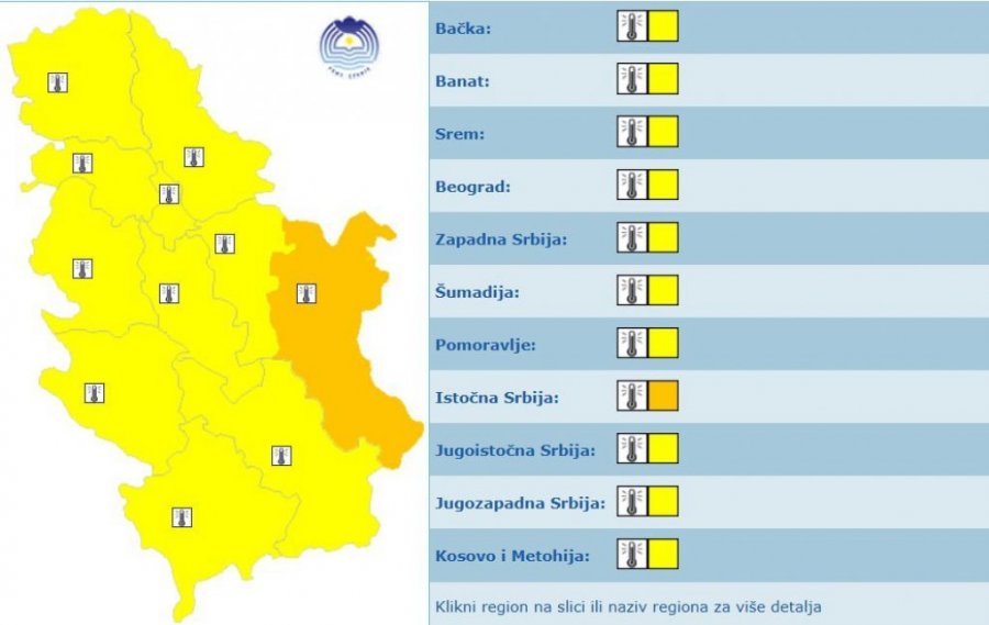 GORE METEOALARMI U SRBIJI! Paklena vrućina OPASNA, posebno upozorenje za OVAJ deo zemlje - Ugroženi hronični bolesnici, životinje, rizik od POŽARA! (FOTO) Autor: Republika/J.B. Vesti 04.06.2025 09:58 Pratite nas i putem Android ili iOS aplikacija Opasna vremenska situacija! Foto: shutterstock/BongkarnGraphic/Lamyai, RHMZ/printscreen U Srbiji je danas sunčano i veoma toplo, a visoke temperature koje dostižu i do 35 stepeni dovele su do toga da Republički hidrometeorološki zavod izda upozorenje na potencijalno opasno vreme. Žuti meteoalarm upaljen je za celu teritoriju Srbije, dok je u istočnoj Srbiji posebno naglašena opasnost – tamo je takođe aktiviran narandžasti alarm, koji označava opasno vreme usled vrućine. Zbog prognozirane maksimalne temperature od 35°C i više, RHMZ je upozorio na moguće posledice: - Veoma opasna vremenska situacija, naročito kada traje nekoliko uzastopnih dana. Ugroženi su hronični bolesniki, lica pod terapijom, medicinskom kontrolom i meteoropate. Ugrožene su i životinje. Veoma povoljni vremenski uslovi za pojavu šumskih ili drugih požara. Nepovoljni uslovi za snabdevanje električnom energijom. Problemi u saobraćaju - navodi RHMZ. Foto: RHMZ/printscreen Žuti meteoalarm u celoj Srbiji, narandžasti na snazi u istočnoj Srbiji Šta označava narandžasti meteoalarm? Vreme je opasno. Prognozirane su opasne vremenske pojave, a takvog su inteziteta da mogu prouzrokovati materijalnu štetu i biti opasne po ljude i životinje. Treba biti vrlo obazriv, svestan rizika i redovno informisan o detaljima očekivanih meteoroloških uslova. Pratiti savete koje daju nadležne državne službe.. Tokom dana se očekuje pretežno vedro vreme, uz slab do umeren jugozapadni i južni vetar. U pojedinim delovima Vojvodine, naročito u Bačkoj i na severu Banata, vetar će u najtoplijem delu dana povremeno biti jak. Na jugoistoku zemlje popodne može doći do prolaznog naoblačenja, ali se zadržava suvo i toplo vreme. U Beogradu će temperatura dostići do 34 stepena, uz slab vetar južnog pravca. Prema prognozama, u narednih sedam dana očekuje nas period stabilnog i vrlo toplog vremena, sa maksimalnim dnevnim temperaturama koje će se penjati i do 36 stepeni. U centralnim delovima prestonice, kao i u pojedinim delovima Vojvodine, prognoziraju se i tropske noći – kada se temperatura ne spušta ispod 20 stepeni ni tokom noći. Građanima se preporučuje da se zaštite od sunca u najtoplijem delu dana, da piju dovoljno tečnosti i izbegavaju teže fizičke aktivnosti na otvorenom. Visoke temperature mogu uticati na zdravlje, posebno kod starijih osoba, hroničnih bolesnika i dece. BONUS VIDEO Poštovani čitaoci, možete nas pratiti i na platformama: Facebook, Instagram, YouTube, TikTok, Telegram, Vajber. Pridružite nam se i prvi saznajte najnovije i najvažnije informacije. Naše aplikacije možete skinuti sa Google Play i Apple AppStore. Pročitajte i... Vremenska prognoza 06:11 02.06.2025 STIGAO PRVI LETNJI TOPLOTNI TALAS! Od danas se kuvamo, RHMZ popalio alarme na celoj teritoriji! Vremenska prognoza 06:09 04.06.2025 JOš JEDAN TROPSKI DAN U SRBIJI! Izrazito visoka temperatura u svim delovima zemlje! Vremenska prognoza 08:49 27.05.2025 AFRIČKI TALAS STIŽE U SRBIJU U PONEDELJAK! Očekuju nas vreli dani i tropske noći, HITNO SPREMITE LETNJU GARDEROBU! Vremenska prognoza 09:49 03.06.2025 OD RANOG JUTRA VRELO U SRBIJI! Meteorolog upozorava: Stižu nam i TROPSKE NOĆI, a posebno se pazite OVOGA! Tagovi Vremenska prognoza Prognoza vremena RHMZ Žuti meteoalarm Narandžasti meteoalarm Vrućina vruće vreme Visoka temperatura Komentari (0) Vesti Društvo 07:00 VRŠNJAČKO NASILJE U KRALJEVU KAO POSLEDICA BLOKADERSKOG LUDILA! ČITAJTE U SRPSKOM TELEGRAFU! 06:30 VREME JE ZA DERBI: Evo gde možete pratiti meč Zvezde i Vojvodine! Vremenska prognoza 06:18 DANAS SNEG - OBUCITE SE TOPLO! Najviša dnevna temperatura 10 stepeni, u Beogradu do 8! 06:01 VERSKI KALENDAR ZA NEDELJU 7. DECEMBAR 02:01 ŠTA NAM ŠAPUĆU NEBESA I ZEMLJA: Nevidljivi glasovi koji oblikuju naš život 00:12 HILJADE LJUDI SLILO SE U SINAGOGU NA VENČANJE KOJE ĆE SE PAMTITI DECENIJAMA: Ceo grad ispunjen molitvom i muzikom 00:02 OVO JE OPASNIJE I OD ORUŽJA JER UNIŠTAVA OBE STRANE: Sveti Nektarije se pita kojoj zmiji, kojoj aspidi dušu da predaju oni koji to rade Društvo 00:01 HOROSKOP ZA 7. DECEMBAR: Ribe - očekujte iznenadni trošak, Ovnovi - smirite strasti! Politika 23:51 06.12.2025 "NIJE SLEDILA PROFESIONALNE SMERNICE, RADI SE NA UTVRĐIVANJU ODGOVORNOSTI"! Policija o koleginici blokaderki koja je maltretirala bolesnu baku! 21:37 06.12.2025 SABLASNE SCENE U ZVEČANU - NOVI PRITISAK NA KOSOVSKE SRBE: Ikone po podu, oči svetaca izgrebane Politika 20:51 06.12.2025 GODINA BLOKADERSKOG IŽIVLJAVANJA PRETOČENA U NASILJE NAD DETETOM! Ovo je znak da su NASILNICI PRETERALI Politika 20:00 06.12.2025 PITANJE ZA POLICIJU KOJA SLUŽI BLOKADERIMA - Brnabić besna zbog legitimisanja bolesne bake tokom blokade: Čime je zaslužila takav tretman? Vremenska prognoza 18:51 06.12.2025 TOKOM VEČERI KIŠA I SNEG: Objavljena nova prognoza, evo kakvo nas vreme čeka već sutra (MAPA) 18:30 06.12.2025 IZ NJENOG TELA JE, KAD JE POSEČENA, UMESTO KRVI POTEKLO MLEKO: Sutra slavimo Svetu velikomučenicu Ekaterinu Politika 17:02 06.12.2025 "NAŠE ŽRTVE SE NE SMEJU ISMEVATI!" Dačić najoštrije osuđuje karikaturu Hrvatskog tjednika! 16:38 06.12.2025 "DA LI STE NORMALNI, IMATE LI RODITELJE"? Igumanija Amfilohija apeluje da se ne zakazuju veridbe u manastiru! SVAŠTA MORA DA GLEDA I ĆUTI, DA NE POKVARI SLAVLJE! Politika 16:23 06.12.2025 BLOKADERI VREĐALI ŽENU S KANCEROM: Šokantan snimak iz Zemuna zgrozio javnost! BLOKADERKA-POLICAJKA MALTRETIRALA BOLESNU BAKU! (VIDEO) Društvo 15:57 06.12.2025 HITNO OBAVEŠTENJE: Oglasili se iz direktorata Srbije nakon havarije u Černobilju! Društvo 15:20 06.12.2025 SRBIJA I KINA JAČAJU SARADNJU: Beograd domaćin prvog evropskog treninga tradicionalne kineske medicin