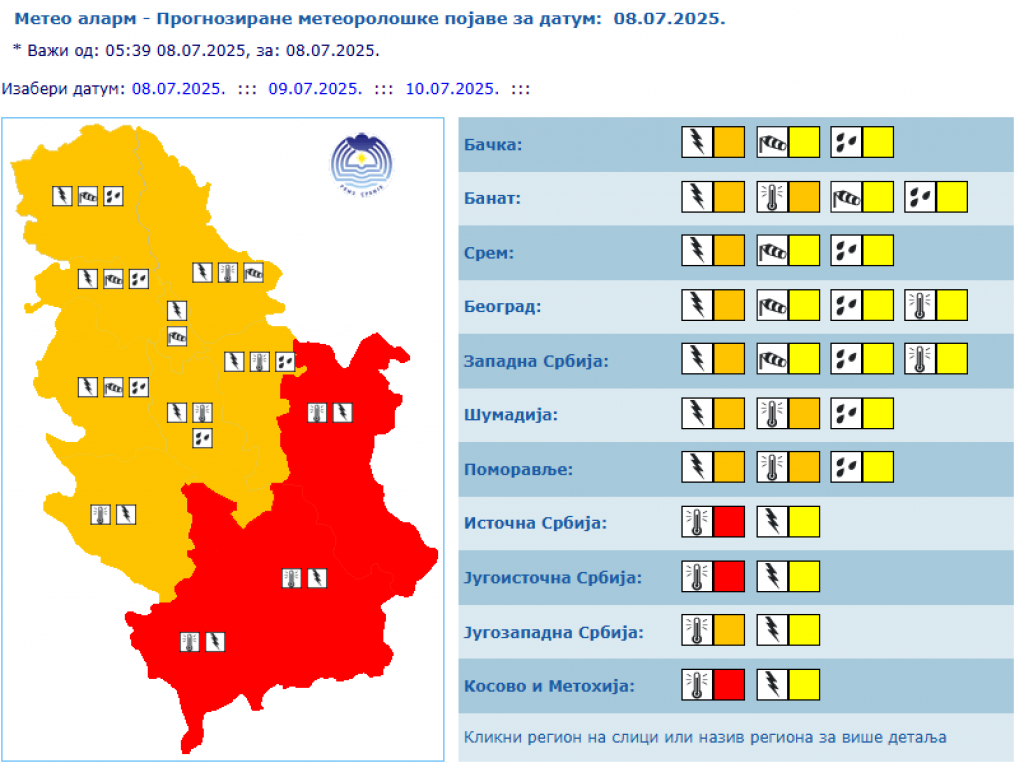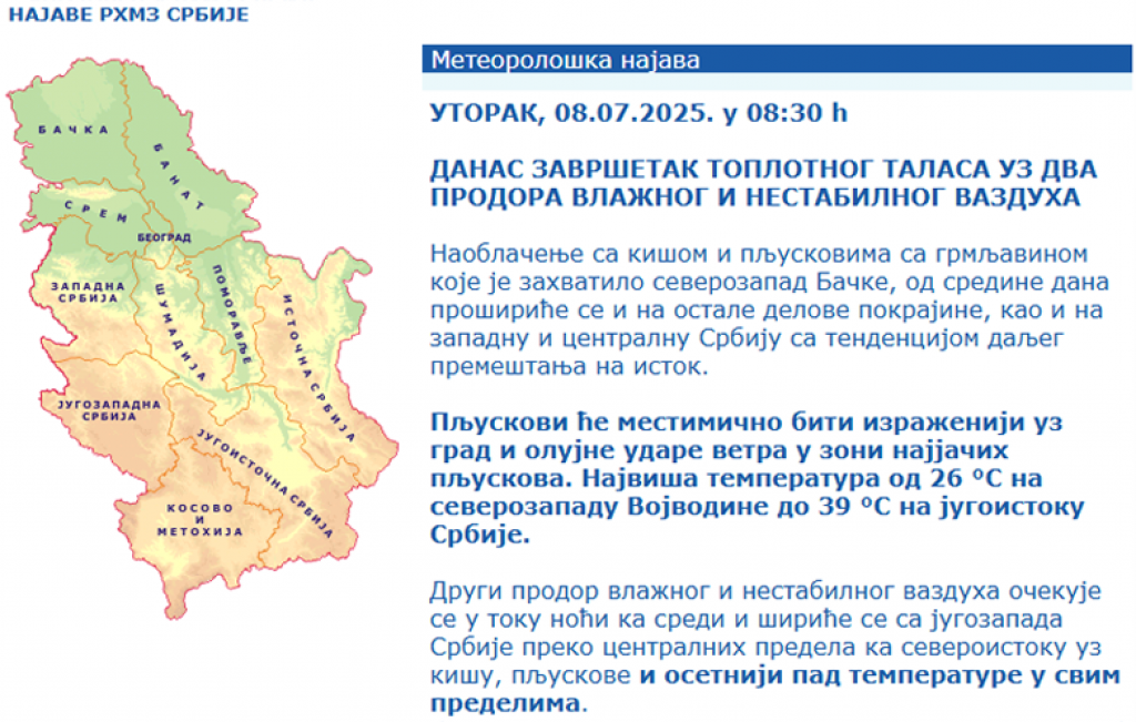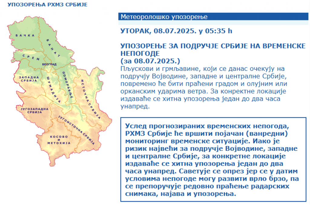 OPREZ, UPOZORENJE RHMZ! Vrućina i vremenske nepogode: Stižu pljuskovi, grmljavina, grad i olujni vetar (FOTO) Autor: Republika Vesti 08.07.2025 09:08 Pratite nas i putem Android ili iOS aplikacija Visoka temperatura zadržaće se još danas na području južnog Banata. Foto: RHMZ/Shutterstock/Bartolomiej Pietrzyk/Vojtech_706 Republički hidrometeorološki zavod (RHMZ) izdao je upozorenje za područje Srbije na vremenske nepogode koje se danas očekuju na području Vojvodine, zapadne i centralne Srbije kada će biti pljuskova i grmljavine koja će biti povremeno praćena gradom i olujnim ili orkanskim udarima vetra. RHMZ saopštava da će tokom dana izdavati hitna upozorenja za konkretne lokacije i usled prognoziranih vremenskih nepogodina vršiće pojačani, odnosno vanredni, monitoring vremenske situacije, piše Tanjug. Foto: RHMZ Upozorenje Iz ovog zavoda savetuju oprez, jer se u datim uslovima nepogode mogu razvijati vrlo brzo, pa se preporučuje redovno praćenje radarskih snimaka, najava i upozorenja. Takođe, RHMZ upozorava da su meteorološki uslovi izrazito pogodni po iniciranje i širenje požara na otvorenom usled isušenog tla u domenu jake i ekstremne suše i povremeno jakog vetra u kombinaciji sa visokim dnevnim temperaturama. Visoka temperatura zadržaće se još danas na području južnog Banata, centralne, istočne i južne Srbije, a najviša dnevna temperatura kretaće se od 35 do 39 stepeni na Celzijusovoj skali. Foto: RHMZ Najava Najviša prognozirana temperatura na severozapadu Vojvodine biće 26 stepeni, a na jugoistoku Srbije 39 stepeni. Prema saopštenju RHMZ-a, danas se očekuju dva prodora vlažnog i nestabilnog vazduha. Prvi prodor, koji će ujutro i pre podne zahvatiti severozapad Vojvodine, od sredine dana pljuskove i grmljavinu usloviće širom pokrajine, kao i u zapadnoj i centralnoj Srbiji sa tendencijom premeštanja na istok. Pljuskovi će mestimično biti izraženiji uz grad, a umeren i jak južni i jugozapadni vetar tokom dana će biti u skretanju na severozapadni, dok se u oblasti jakih pljuskova očekuju i udari olujne jačine. Drugi prodor vlažnog i nestabilnog vazduha očekuje se u toku noći ka sredi i širiće se sa jugozapada Srbije preko centralnih predela ka severoistoku uz kišu, pljuskove i osetniji pad temperature. Foto: RHMZ Meteoalarm RHMZ navodi da se od sutra očekuje osetno svežije vreme u svim krajevima. U sredu i četvrtak biće promenljivo oblačno i osetno svežije uz umeren i jak severozapadni vetar i sa maksimalnim temperaturama od 20 do 25 stepeni, u sredu ujutro i pre podne kiša i pljuskovi očekuju se u većini regiona, a zatim će postati retka, odnosno izolovana, pojava. U petak i tokom prvog dana vikenda očekuje se porast temperature pa će biti od 25 do 30 stepeni uz sve više sunčanih perioda tokom dana. Sunčano i veoma toplo vreme uz temperaturu od 30 do 35 stepeni očekuje se u nedelju, a početkom naredne sedmice vreme će biti promenljivo, ali sparno i nestabilnije sa lokalnom pojavom pljuskova i grmljavine. Poštovani čitaoci, možete nas pratiti i na platformama: Facebook, Instagram, YouTube, TikTok, Telegram, Vajber. Pridružite nam se i prvi saznajte najnovije i najvažnije informacije. Naše aplikacije možete skinuti sa Google Play i Apple AppStore. Pročitajte i... Vremenska prognoza 06:10 08.07.2025 DVA HLADNA FRONTA UDARAJU SRBIJU! Pik vremenskih nepogoda biće DANAS u ovom delu zemlje, očekuju se GRAD i OLUJNI VETAR Društvo 17:31 07.07.2025 UŽAS U NOVOM SADU! Drvo palo na ženu (41) i devojčicu (8) tokom nevremena! OBE SA TEŠKOM POVREDAMA PREBAČENE NA HIRURGIJU! Vremenska prognoza 17:26 07.07.2025 OLUJA PROTUTNJALA SRBIJOM, U OVOM DELU TEMPERATURA PALA ZA ČAK 22 STEPENA! Stiže zahlađenje i u ostale krajeve! Vremenska prognoza 12:04 07.07.2025 ZA SAT I PO STIŽU PLJUSKOVI SA GRMLJAVINOM: RHMZ popalio alarme za ovaj deo Srbije - OD UTORKA STIŽU DVA HLADNA PRODORA BONUS VIDEO Tagovi Vremenska prognoza Vreme Prognoza Nevreme Pljusak Oluja Grad Prethodna vest Sledeća vest Komentari (0) Vesti Politika 17:36 ISTORIJSKI DAN ZA SRBIJU! Predsednik Gruzije prvi put u zvaničnoj poseti! Vučić oduševljen: "Neizmerno sam srećan i počastvovan!" (VIDEO) 17:30 VERUJE SE DA SLEPIMA VRAĆA VID, GLUVIMA SLUH I DA JE NAROČITO OSETLJIV NA BOLESNE, SIROMAŠNE I UGNJETAVANE! Ovo su tri najmoćnije molitve Svetom Nikoli! Politika 17:27 ANS zgrožen odlukom suda o vraćanju Plavšića na posao: Odgovornost za izgovorenu reč mora postojati, pogotovo za urednika informativnog programa RTS Politika 17:26 NIKADA NEĆEMO ZABORAVITI! Nemanja Starović u Jerusalimu poručio: Čuvamo sećanje na milione stradalih, to je TEMELJ NAŠE DRŽAVE! 16:51 ZAŠTO NAJVEĆI BROJ PORODICA U SRBIJI SLAVI BAŠ SVETOG NIKOLU: Za to postoje tri razloga, a jedan je baš tužan Politika 16:29 BRUKA KAKVU SRBIJA NE PAMTI! Dobio OTKAZ jer je psovao decu, a sada se vraća u javni servis! Da li je moguće da će ovaj čovek ponovo uređivati program RTS?! Društvo 16:06 DRUŠTVENO ODGOVORNE INICIJATIVE ZA DECU U SRBIJI: Ulaganje u najmlađe kao dugoročna investicija Politika 16:02 POZIVAM VLADU SRBIJE DA PO UGLEDU NA VLADU SEVERNE MAKEDONIJE, KOJA JE SMENILA NJIHOVOG DRŽAVNOG TUŽIOCA, RAZREŠI ODMAH ZAGORKU DOLOVAC! Politika 15:30 UTVRĐENA MASNA LAŽ! Veštačenje dokazalo da je montiran objavljeni audio-snimak razgovora Lučića i Milera Politika 14:37 PANIKA NA UNIVERZITETU U BEOGRADU! Rektor Đokić se hitno obratio premijeru Macutu - traži odlaganje kontrole trošenja državnog novca 14:21 ČUDO SVETOG NIKOLE KOJE JE ODJEKNULO SVETOM! Zoja je uzela ikonu, uradila užasnu stvar i rekla: "AKO IMA BOGA, KAZNIĆE ME!" USLEDILA JE KATASTROFA! (VIDEO) Politika 14:10 Predsednik Vučić: 16 njih je položilo živote na oltar otadžbine, to su naši junaci i naše svetlo 14:00 ŠTA SE DEŠAVA U SRCIMA LJUDI KOJI TUKU I ZLOSTAVLAJU SVOJE VOLJENE: Sveti Luka Krimski kaže da moraju pod hitno da urade jednu stvar 13:50 SUTRA JE SVETI NIKOLA,