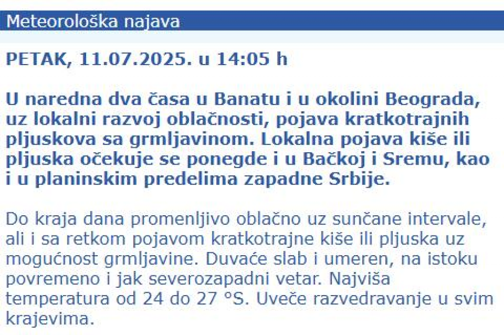 SPREMA SE OPASNO NEVREME! RHMZ upalio meteoalarm - U OVIM MESTIMA ĆE GRMETI ZA DVA SATA! Autor: Republika Vesti 11.07.2025 14:52 Pratite nas i putem Android ili iOS aplikacija Do kraja dana promenlјivo oblačno uz sunčane intervale, ali i sa retkom pojavom kratkotrajne kiše ili plјuska uz mogućnost grmlјavine Foto: Tanjug/Sava Radovanović, Shutterstock/Netfalls Remy Musser/ Filip Bjorkman/S6Wigj/Julia Sudnitskaya, freesvg.org U naredna dva sata u Banatu i u okolini Beograda, uz lokalni razvoj oblačnosti, pojava kratkotrajnih plјuskova sa grmlјavinom. Lokalna pojava kiše ili plјuska očekuje se ponegde i u Bačkoj i Sremu, kao i u planinskim predelima zapadne Srbije, najavio je RHMZ. Foto: RHMZ Do kraja dana promenlјivo oblačno uz sunčane intervale, ali i sa retkom pojavom kratkotrajne kiše ili plјuska uz mogućnost grmlјavine. Duvaće slab i umeren, na istoku povremeno i jak severozapadni vetar. Najviša temperatura od 24 do 27 stepeni. Uveče razvedravanje u svim krajevima. U Bačkoj, Banatu, Sremu i Beogradu na snazi je žuti meteo alarm zbog grmljavine. Ovo upozorenje znači da vreme može biti potencijalno opasno. Foto: RHMZ U subotu pretežno sunčano i toplije. Uz lokalni razvoj oblačnosti, posle podne i uveče veoma retka (izolovana) pojava kratkotrajne kiše ili plјuska sa grmlјavinom, uglavnom na zapadu. Vetar slab, promenlјiv. Najniža temperatura od 8 do 16, a najviša od 28 do 33 stepena. U nedelјu i ponedelјak pretežno sunčano i toplo sa maksimalnim temperaturama od 32 na severu i zapadu do 37 stepeni na jugu i jugoistoku Srbije. U utorak i sredu promenlјivo, sparno i nestabilnije uz smenu sunčanih perioda i lokalne pojave kiše i plјuskova sa grmlјavinom uz manji pad dnevnih temperatura. Od četvrtka u većini mesta pretežno sunčano, a kratkotrajne padavine biće veoma retka (izolovana) pojava, uglavnom u brdsko-planinskim predelima. Poštovani čitaoci, možete nas pratiti i na platformama: Facebook, Instagram, YouTube, TikTok, Telegram, Vajber. Pridružite nam se i prvi saznajte najnovije i najvažnije informacije. Naše aplikacije možete skinuti sa Google Play i Apple AppStore. Pročitajte i... Vremenska prognoza 07:50 27.06.2025 MRAČI SE NEBO NAD SRBIJOM! Počeo da pada grad u ovom delu zemlje, vetar olujne jačine gura nevreme ka BEOGRADU Vremenska prognoza 06:10 08.07.2025 DVA HLADNA FRONTA UDARAJU SRBIJU! Pik vremenskih nepogoda biće DANAS u ovom delu zemlje, očekuju se GRAD i OLUJNI VETAR Vremenska prognoza 12:04 07.07.2025 ZA SAT I PO STIŽU PLJUSKOVI SA GRMLJAVINOM: RHMZ popalio alarme za ovaj deo Srbije - OD UTORKA STIŽU DVA HLADNA PRODORA Vremenska prognoza 21:13 28.06.2025 STIŽU PLJUSKOVI SA GRMLJAVINOM! RHMZ UPRAVO OBJAVIO PROGNOZU! Nakon prženja stiže nam POTPUNI VREMENSKI ŠOK! Tagovi Nevreme Srbija Beograd Vremenska prognoza Kiša RHMZ Grmljavina Upozorenje Banat Srem Žuti meteoalarm Bačka Meteoalarm vreme srbija Prethodna vest Sledeća vest Komentari (0) Vesti 21:49 11 BRITANACA U JEDNOM DANU PREŠLO U PRAVOSLAVLJE U SRPSKOJ CRKVI U BIRMINGEMU: Promena koja menja versku mapu Zapada Vremenska prognoza 21:37 SPREMITE SE ZA 28. DECEMBAR! Meteorolog Todorović otkrio šta se tada dešava! STIŽE NAM ONO OD ČEGA SVI STREPE! Politika 20:29 VUČIĆ NA SVEČANOJ VEČERI SA KAVELAŠVILIJEM: "Prilika da otvorimo teme koje prevazilaze politiku - od najboljih vina do strasti prema fudbalu!" Politika 19:51 PREMIJER MACUT ODGOVORIO REKTORU ĐOKIĆU: O pitanjima visokog obrazovanja – ne preko medija, već kroz direktan i kolegijalan dijalog 18:30 SUTRA JE CRVENO SLOVO I NAJČEŠĆA SLAVA U SRBIJI: Slavimo Svetog Nikolu - NIKOLJDAN! 18:10 Posle srebrne haljine TAMARA VUČIĆ u izdanju poput članova kraljevske porodice, a tašna je pravi modni hit! (GALERIJA) Politika 18:00 PAO GLAVNI FINANSIJER BLOKADERA U NOVOM PAZARU! Gazda hotela napao policiju nasred ulice, udarao ih PESNICAMA - SAD ZAVRŠIO IZA REŠETAKA! Politika 17:36 ISTORIJSKI DAN ZA SRBIJU! Predsednik Gruzije prvi put u zvaničnoj poseti! Vučić oduševljen: "Neizmerno sam srećan i počastvovan!" (VIDEO) 17:30 VERUJE SE DA SLEPIMA VRAĆA VID, GLUVIMA SLUH I DA JE NAROČITO OSETLJIV NA BOLESNE, SIROMAŠNE I UGNJETAVANE! Ovo su tri najmoćnije molitve Svetom Nikoli! Politika 17:27 ANS zgrožen odlukom suda o vraćanju Plavšića na posao: Odgovornost za izgovorenu reč mora postojati, pogotovo za urednika informativnog programa RTS Politika 17:26 NIKADA NEĆEMO ZABORAVITI! Nemanja Starović u Jerusalimu poručio: Čuvamo sećanje na milione stradalih, to je TEMELJ NAŠE DRŽAVE! 16:51 ZAŠTO NAJVEĆI BROJ PORODICA U SRBIJI SLAVI BAŠ SVETOG NIKOLU: Za to postoje tri razloga, a jedan je baš tužan Politika 16:29 BRUKA KAKVU SRBIJA NE PAMTI! Dobio OTKAZ jer je psovao decu, a sada se vraća u javni servis! Da li je moguće da će ovaj čovek ponovo uređivati program RTS?! Društvo 16:06 DRUŠTVENO ODGOVORNE INICIJATIVE ZA DECU U SRBIJI: Ulaganje u najmlađe kao dugoročna investicija Politika 16:02 POZIVAM VLADU SRBIJE DA PO UGLEDU NA VLADU SEVERNE MAKEDONIJE, KOJA JE SMENILA NJIHOVOG DRŽAVNOG TUŽIOCA, RAZREŠI ODMAH ZAGORKU DOLOVAC! Politika 15:30 UTVRĐENA MASNA LAŽ! Veštačenje dokazalo da je montiran objavljeni audio-snimak razgovora Lučića i Milera Politika 14:37 PANIKA NA UNIVERZITETU U BEOGRADU! Rektor Đokić se hitno obratio premijeru Macutu - traži odlaganje kontrole trošenja državnog novca 14:21 ČUDO SVETOG NIKOLE KOJE JE ODJEKNULO SVETOM! Zoja je uzela ikonu, uradila užasnu stvar i rekla: "AKO IMA BOGA, KAZNIĆE ME!" USLEDILA JE KATASTROFA! (VIDEO) Politika 14:10 Predsednik Vučić: 16 njih je položilo živote na oltar otadžbine, to su naši junaci i naše svetlo 14:00 ŠTA SE DEŠAVA U SRCIMA LJUDI KOJI TUKU I ZLOSTAVLAJU SVOJE VOLJENE: Sveti Luka Krimski kaže da moraju pod hitno da urade jednu stvar 13:50 SUTRA JE SVETI NIKOLA, NAJVEĆA SLAVA PO BROJU SVEČARA U SRBIJI: Ovu grešku nijedan domaćin ne sme da napravi Beograd 13:43 ZEMUN ZAB