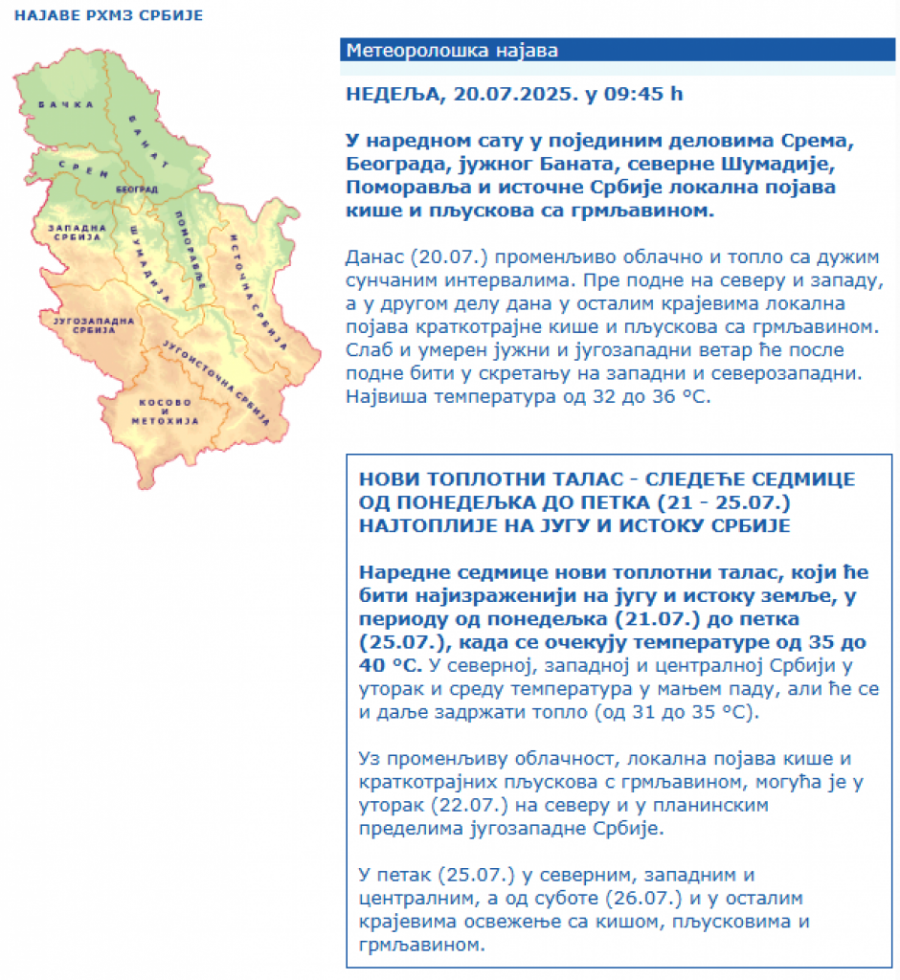 HITNO SE OGLASIO RHMZ! Nevreme se premešta u ove delove Srbije: Otvoriće se nebo, stižu pljuskovi sa grmljavinom Autor: Republika Vesti 20.07.2025 10:03 Pratite nas i putem Android ili iOS aplikacija Danas se očekuje promenljivo oblačno i toplo vreme sa dužim sunčanim intervalima. Foto: Tanjug/Vladimir Šporčić/MARKO DjOKOVIC, FB/Ivan Ristić vreme Republički hidrometeorološki zavod (RHMZ) objavio je najavu koja se odnosi na lokalnu pojavu kiše i pljuskova sa grmljavinom. Najava je objavljena u 9 časova i 45 minuta. - U narednom satu u pojedinim delovima Srema, Beograda, južnog Banata, severne Šumadije, Pomoravlja i istočne Srbije lokalna pojava kiše i pljuskova sa grmljavinom - najavljeno je. Takođe se navodi da se danas očekuje promenljivo oblačno i toplo vreme sa dužim sunčanim intervalima. - Pre podne na severu i zapadu, a u drugom delu dana u ostalim krajevima lokalna pojava kratkotrajne kiše i pljuskova sa grmljavinom. Slab i umeren južni i jugozapadni vetar će posle podne biti u skretanju na zapadni i severozapadni. Najviša temperatura od 32 do 36 °C. Foto: RHZM/printscreen Najava Novi toplotni talas Objavljeno je da nas naredne sedmice očekuje novi toplotni talas koji će biti najizraženiji na jugu i istoku zemlje, u periodu od ponedeljka (21. jula) do petka (25. jula), kada se očekuju temperature od 35 do 40 °C. U severnoj, zapadnoj i centralnoj Srbiji u utorak i sredu temperatura u manjem padu, ali će se i dalje zadržati toplo (od 31 do 35 °C). Uz promenljivu oblačnost, lokalna pojava kiše i kratkotrajnih pljuskova s grmljavinom, moguća je u utorak (22. jula) na severu i u planinskim predelima jugozapadne Srbije. U petak (25. jula) u severnim, zapadnim i centralnim, a od subote (26. jula) i u ostalim krajevima osveženje sa kišom, pljuskovima i grmljavinom. Poštovani čitaoci, možete nas pratiti i na platformama: Facebook, Instagram, YouTube, TikTok, Telegram, Vajber. Pridružite nam se i prvi saznajte najnovije i najvažnije informacije. Naše aplikacije možete skinuti sa Google Play i Apple AppStore. Pročitajte i... Vremenska prognoza 08:18 20.07.2025 SRBIJA NA UDARU TOPLOTNOG TALASA! Pripremite se, stiže pakao: RHMZ izdao posebno upozorenje za Beograd (FOTO) Vremenska prognoza 06:05 20.07.2025 STIŽE NOVI TOPLOTNI TALAS U SRBIJU! Danas do 36 stepeni, a u OVOM delu Srbije očekuje se NEVREME Vremenska prognoza 13:55 19.07.2025 PAKAO SE VRAĆA! RHMZ izdao hitno upozorenje: Novi toplotni talas nosi 40 stepeni, evo kad stiže spas! Vremenska prognoza 06:05 19.07.2025 OD DANAS SVE TOPLIJE! Ulazimo u novi toplotni talas, temperature će stizati do 40 stepeni! BONUS VIDEO Tagovi RHMZ Vremenska prognoza Vreme Prognoza Upozorenje Pljuskovi Grmljavina Prethodna vest Sledeća vest Komentari (0) Vesti 15:14 “OSTAVITE ČOVEKA NA MIRU!”: Otac Stefan poručuje da je Vujadin Savić sve što je trebao, rešio sa ženom, decom i svojim duhovnikom Vremenska prognoza 14:12 STIŽU CRNI OBLACI U SRBIJU! Jedna pojava parališe celu zemlju, a temperatura ide i u minus! Društvo 14:01 SPEKULACIJE O MASOVNOM POMORU ŽIVOTINJA UZDRMALE JAVNOST, INSPEKCIJA NA TERENU: Evo šta su zatekli u zoo-vrtu na Paliću 14:00 U OVOJ SITUACIJI NE SMETE DAVATI SAVETE BLIŽNJIMA! Starac Gavrilo kaže da ih tako možete upropastiti! Srbija 13:49 OGROMNE GUŽVE NA SVIM PUTNIM PRAVCIMA! Najgora situacija ka Nišu - SRBI SE VRAĆAJU U RODNE KRAJEVE! Društvo 13:43 DETALJNA KALKULACIJA! Evo kako da spojite dane i dobijete odmor od 7 dana za praznike! 13:20 ZAŠTO SE TREBA UZDRŽAVATI OD INTIMNIH ODNOSA TOKOM POSTA: Otac Pavle o posledicama odluke zbog koje kasnije mnogi zaplaču Politika 13:13 KRVNIČKI TUKAO SRBE I BACAO IH U ŠAHT! Čuvar ozloglašenog logora Čelebići lociran u Bostonu - SAD mu oduzimaju državljanstvo! Politika 12:50 "PALJENJE NOVOGODIŠNJE DEKORACIJE U NOVOM SADU NIJE SLUČAJAN INCIDENT!" Oglasio se gradonačelnik Mićin: Ne pristajemo na nasilje, vandalizam i politiku straha! (FOTO) Politika 12:34 PELEGRINI STIŽE U SRBIJU! Ugostiće ga predsednik Vučić! Politika 12:30 BOGOLJUB BI HTEO DA BUDE KRALJ! Nova Karićeva izjava izazvala lavinu komentara! (VIDEO) 12:20 EVO ZBOG ČEGA SE OSVEŠTAVA SLAVSKI KOLAČ, SVEĆA I ŽITO: Na Nikoljdan, sveštenik Nikola Pejović podsetio na istinski značaj slavskih darova Beograd 12:15 NOVOGODIŠNJI DUH U SAMOM SRCU BEOGRADA! Od lepote na Trgu republike zastaje dah - pogledajte kako je ove godine okićen sam centar prestonice! (FOTO, VIDEO) Društvo 12:00 ZAVOD U PANČEVU DOBIO ZNAČAJNU DONACIJU: Meridian Fondacija jača kapacitete za zaštitu zdravlja i životne sredine Vremenska prognoza 11:49 ZABELEĆE SE SRBIJA OKO NOVE GODINE! Meteorolog otkrio tačne datume kada će padati sneg - A ONDA SLEDI PREOKRET! Društvo 11:28 "TATA, ŽIVEĆEŠ U VEČNOSTI!" Preminuo najpoznatiji srpski onkolog dr Slobodan Čikarić, osvanule potresne čitulje porodice! (FOTO) 11:16 EVO ZAŠTO JE RIBA PO MANASTIRSKOM RECEPTU DRUGAČIJA: Sočan posni ručak koji se pamti i narednog dana Politika 11:00 "SRBIJA JE NA SVOJOJ STRANI!" Zagrmela poruka predsednika Vučića: HOĆU DA SE LJUDI OSEĆAJU MIRNO! (VIDEO) Politika 10:54 MINISTARKA MESAROVIĆ SA KINESKIM STJUARDESAMA NA PUTU ZA BEOGRAD! Njihova avio-kompanija će služiti srpske proizvode na svojim letovima! (FOTO) Društvo 10:08 UMRO DUŠAN PETRIČIĆ! Kolege se emotivnom porukom oprostile od njega! Društvo 10:00 DRUŠTVENO ODGOVORNE INICIJATIVE ZA DECU U SRBIJI: Ulaganje u najmlađe kao dugoročna investicija Društvo 09:48 MAJKE DOBIJAJU NOVU POMOĆ DRŽAVE! Ovo su svi detalji, čeka vas 20.000 evra! Društvo 09:09 KAKAV SNIMAK IZ BORČE! Deda Mraz prošetao ulicama, ali njegov "irvas" je pokupio sve simpatije! (VIDEO) Politika 09:07 PREDSEDNIK SRBIJE JUČE SLAVIO SLAVU! Najveći zvaničnici u domu porodice Vučić - PODELIO TRENUTKE SA NAJMILIJIMA! (FOTO, VIDEO) Društvo 08:06 SUTRA JE NAJKRAĆI DAN U GODINI - POČINJE ZIMA! Noć će trajati više od 15 sati! 07:30 AKO IMAŠ OSE