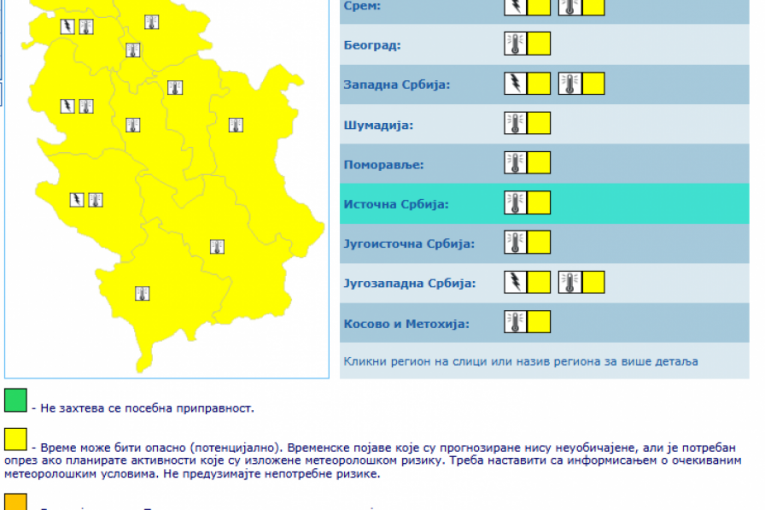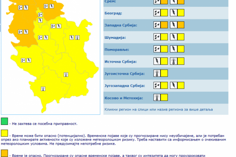 HITNO SE OGLASIO RHMZ! Objavljeno upozorenje: Oluja stiže u Srbiju, padaće i grad, upaljen meteo-alarm (FOTO) Autor: Republika Vesti 02.08.2025 11:55 Pratite nas i putem Android ili iOS aplikacija Danas je u celoj Srbiji na snazi žuti meteo-alarm. Foto: Carlos Chiossone / Zuma Press / Profimedia/Tanjug Vladimir Šporčić/Shutterstock/Baloncici/trendobjects/freepik Republički hidrometeorološki zavod (RHMZ) upozorio je da se u Srbiji sutra i u ponedeljak očekuju vremenske nepogode, lokalno sa gradom i velikom količinom padavina. Pljuskovi i grmljavine koji se na području Srbije očekuju u nedelju posle podne i uveče, uglavnom u severnim i zapadnim, a tokom noći i u ponedeljak, 04. avgusta, u ostalim krajevima, lokalno će biti praćeni gradom, jakim ili olujnim vetrom i velikom količinom padavina za kratko vreme, objavljeno je na sajtu RHMZ, piše Tanjug. Za konkretne lokacije izdavaće se hitna upozorenja jedan do dva sata unapred. Narandžasti meteo-alarm, koji označava opasno vreme, sutra će biti na snazi u Bačkoj, Banatu, Sremu i zapadnoj Srbiji. - Vreme je opasno. Prognozirane su opasne vremenske pojave, a takvog su inteziteta da mogu prouzrokovati materijalnu štetu i biti opasne po ljude i životinje. Treba biti vrlo obazriv, svestan rizika i redovno informisan o detaljima očekivanih meteoroloških uslova. Pratiti savete koje daju nadležne državne službe - objašnjeno je. RHMZ je objavio i najavu koja se odnosi na to kakvo se vreme danas očekuje u Srbiji. RHMZ/printscreen RHMZ/printscreen RHMZ/printscreen RHMZ/printscreen - Pretežno sunčano i toplo. Posle podne i uveče na zapadu i severozapadu, uz promenljivu oblačnost, tek ponegde kratkotrajna kiša ili pljusak s grmljavinom. Vetar slab i umeren istočni i jugoistočni. Najviša temperatura od 30 do 34 °C. U toku noći ka nedelji u Vojvodini retka pojava pljuskova s grmljavinom - najavljeno je. Danas je u celoj Srbiji na snazi žuti meteo-alarm. - Vreme može biti opasno (potencijalno). Vremenske pojave koje su prognozirane nisu neuobičajene, ali je potreban oprez ako planirate aktivnosti koje su izložene meteorološkom riziku. Treba nastaviti sa informisanjem o očekivanim meteorološkim uslovima. Ne preduzimajte nepotrebne rizike - navodi se na sajtu RHMZ. Poštovani čitaoci, možete nas pratiti i na platformama: Facebook, Instagram, YouTube, TikTok, Telegram, Vajber. Pridružite nam se i prvi saznajte najnovije i najvažnije informacije. Naše aplikacije možete skinuti sa Google Play i Apple AppStore. Pročitajte i... Vremenska prognoza 06:13 02.08.2025 CEO DAN SUNČANO I TOPLO, ALI TU JE PROMENA! Najavljeni su pljuskovi i grmljavine za večeras - evo gde će biti udarno! Vremenska prognoza 22:28 01.08.2025 RHMZ IZDAO DVA STEPENA UPOZORENJA ZBOG EKSTREMNIH PROMENA U VAZDUHU POTENCIJALNO OPASNIH PO ŽIVOT! Novi obrt u atmosferi u ponedeljak Vremenska prognoza 09:55 01.08.2025 U SRBIJU STIŽE OLUJA! Ove delove zemlje će prvo pogoditi jak vetar, pljuskovi i grad: Nakon toga sledi potpuni ŠOK! Vremenska prognoza 06:10 01.08.2025 KIŠA JOŠ NIJE REKLA SVOJE! Još danas u Srbiji suvo, onda stiže novi talas padavina - OVAJ deo zemlje prvi na udaru BONUS VIDEO Tagovi RHMZ Upozorenje Nevreme Vremenska prognoza Prognoza Oluja Grad Komentari (0) Vesti 07:30 EVO KAKO ONAJ KOJI SILAZI NAJNIŽE POSTAJE NAJVIŠI: Vladika Nikolaj otkriva šta otvara vrata nebeskih visina i unutrašnje slobode Društvo 07:00 VRŠNJAČKO NASILJE U KRALJEVU KAO POSLEDICA BLOKADERSKOG LUDILA! ČITAJTE U SRPSKOM TELEGRAFU! 06:30 VREME JE ZA DERBI: Evo gde možete pratiti meč Zvezde i Vojvodine! Vremenska prognoza 06:18 DANAS SNEG - OBUCITE SE TOPLO! Najviša dnevna temperatura 10 stepeni, u Beogradu do 8! 06:01 VERSKI KALENDAR ZA NEDELJU 7. DECEMBAR 02:01 ŠTA NAM ŠAPUĆU NEBESA I ZEMLJA: Nevidljivi glasovi koji oblikuju naš život 00:12 HILJADE LJUDI SLILO SE U SINAGOGU NA VENČANJE KOJE ĆE SE PAMTITI DECENIJAMA: Ceo grad ispunjen molitvom i muzikom 00:02 OVO JE OPASNIJE I OD ORUŽJA JER UNIŠTAVA OBE STRANE: Sveti Nektarije se pita kojoj zmiji, kojoj aspidi dušu da predaju oni koji to rade Društvo 00:01 HOROSKOP ZA 7. DECEMBAR: Ribe - očekujte iznenadni trošak, Ovnovi - smirite strasti! Politika 23:51 06.12.2025 "NIJE SLEDILA PROFESIONALNE SMERNICE, RADI SE NA UTVRĐIVANJU ODGOVORNOSTI"! Policija o koleginici blokaderki koja je maltretirala bolesnu baku! 21:37 06.12.2025 SABLASNE SCENE U ZVEČANU - NOVI PRITISAK NA KOSOVSKE SRBE: Ikone po podu, oči svetaca izgrebane Politika 20:51 06.12.2025 GODINA BLOKADERSKOG IŽIVLJAVANJA PRETOČENA U NASILJE NAD DETETOM! Ovo je znak da su NASILNICI PRETERALI Politika 20:00 06.12.2025 PITANJE ZA POLICIJU KOJA SLUŽI BLOKADERIMA - Brnabić besna zbog legitimisanja bolesne bake tokom blokade: Čime je zaslužila takav tretman? Vremenska prognoza 18:51 06.12.2025 TOKOM VEČERI KIŠA I SNEG: Objavljena nova prognoza, evo kakvo nas vreme čeka već sutra (MAPA) 18:30 06.12.2025 IZ NJENOG TELA JE, KAD JE POSEČENA, UMESTO KRVI POTEKLO MLEKO: Sutra slavimo Svetu velikomučenicu Ekaterinu Politika 17:02 06.12.2025 "NAŠE ŽRTVE SE NE SMEJU ISMEVATI!" Dačić najoštrije osuđuje karikaturu Hrvatskog tjednika! 16:38 06.12.2025 "DA LI STE NORMALNI, IMATE LI RODITELJE"? Igumanija Amfilohija apeluje da se ne zakazuju veridbe u manastiru! SVAŠTA MORA DA GLEDA I ĆUTI, DA NE POKVARI SLAVLJE! Politika 16:23 06.12.2025 BLOKADERI VREĐALI ŽENU S KANCEROM: Šokantan snimak iz Zemuna zgrozio javnost! BLOKADERKA-POLICAJKA MALTRETIRALA BOLESNU BAKU! (VIDEO) Društvo 15:57 06.12.2025 HITNO OBAVEŠTENJE: Oglasili se iz direktorata Srbije nakon havarije u Černobilju! Društvo 15:20 06.12.2025 SRBIJA I KINA JAČAJU SARADNJU: Beograd domaćin prvog evropskog treninga tradicionalne kineske medicine 14:54 06.12.2025 TAJNE KOJE VERNICI NA ISPOVESTI RETKO PRIZNAJU: Sveštenik otkriva zašto se neki koprcaju u blatu, a žele nebeski život Politika 14:22 06.12.2025 MONSTRUOZNI KOMENTARI BLOKADERA: Nakon jezivog zlo