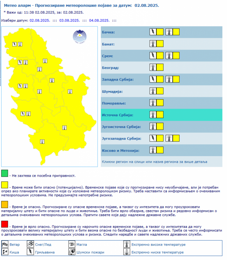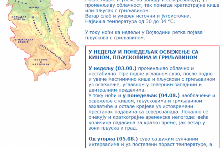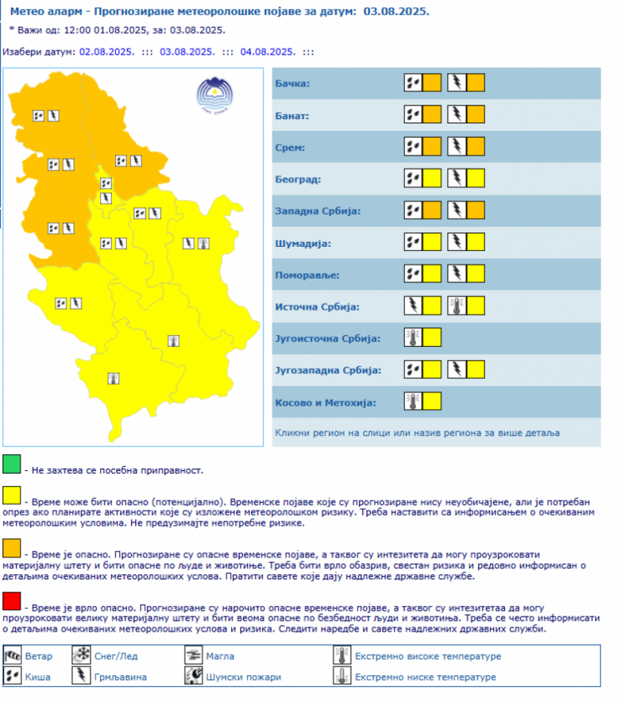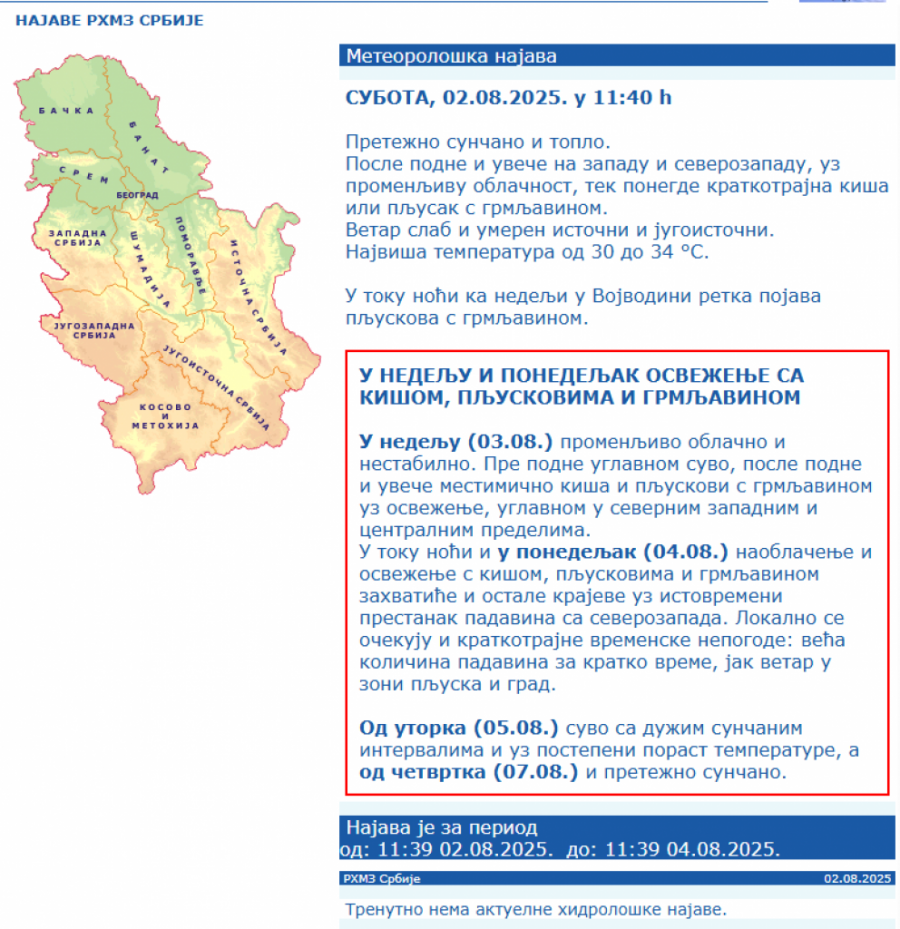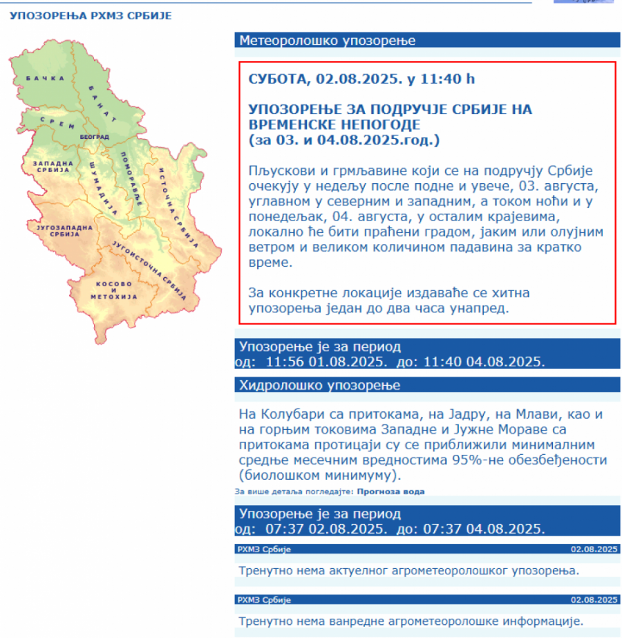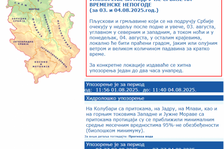 Vremenska prognoza 22:28 01.08.2025 RHMZ IZDAO DVA STEPENA UPOZORENJA ZBOG EKSTREMNIH PROMENA U VAZDUHU POTENCIJALNO OPASNIH PO ŽIVOT! Novi obrt u atmosferi u ponedeljak