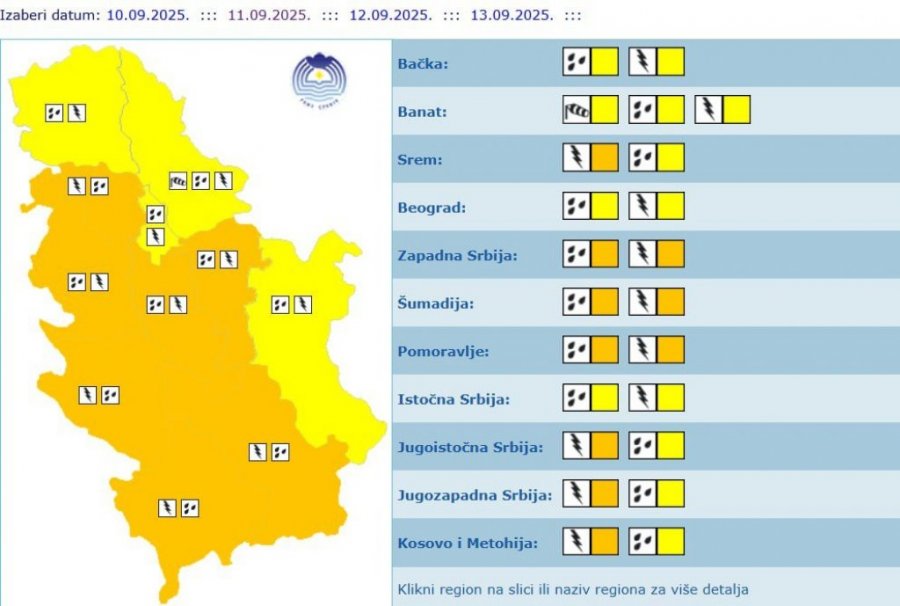 POPALJENI METEOALARMI, RHMZ HITNO IZDAO UPOZORENJE! Sutra potop u celoj zemlji, grad I oluja - OVI delovi Srbije će biti posebno na udaru! Autor: Republika/J.B. Vesti 10.09.2025 20:47 Pratite nas i putem Android ili iOS aplikacija Upozorenja će se izdavati na sat ili dva! Foto: Shutterstock/Shutterstock AI Genera/David W. Leindeckertor/Bardocz Peter/Christian Mueller/gnepphoto/Nebojsa Markovic, freesvg.org Republički hidrometeorološki zavod izdao je upozorenje za četvrtak, 11. septembar, kada se u većem delu Srbije očekuje nestabilno vreme sa pljuskovima i grmljavinom, a izolovano i sa pojavom grada i olujnog vetra. Veća verovatnoća za jače nepogode postoji u zapadnim, centralnim i južnim predelima zemlje, dok će za konkretne lokacije biti izdavana hitna upozorenja sat do dva unapred. Popaljeni meteoalarmi Sutra će na teritoriji cele zemlje biti upaljeni meteoalarmi. Foto: RHMZ/printscreen Opasno vreme u celoj zemlji U toku noći pred nama vreme će biti pretežno oblačno, mestimično sa kišom slabog do umerenog intenziteta, češće u Vojvodini, zapadnoj, jugozapadnoj i centralnoj Srbiji. Lokalni pljuskovi sa grmljavinom mogu se očekivati ponegde, a u donjem Podunavlju, Banatu i Braničevu predviđa se dalje pojačanje južnog i jugoistočnog vetra (košave), koja će povremeno dostići i udare olujne jačine od 17 do 24 metra u sekundi. U četvrtak će biti umereno do potpuno oblačno, povremeno sa kišom i lokalnim pljuskovima. Na planinama će duvati umeren i jak južni i jugozapadni vetar, dok će u košavskom području dominirati jugoistočni vetar, u Banatu i donjem Podunavlju sa udarima olujne jačine, ali će posle podne i uveče oslabiti. Najniža temperatura biće od 16 do 24 stepena, a najviša dnevna od 25 do 30 stepeni. U petak i subotu sledi delimično razvedravanje, uz suvo vreme i duže sunčane intervale, dok će u brdsko-planinskim predelima u petak i na istoku Srbije u subotu biti moguća kratkotrajna kiša. U nedelju se ponovo očekuje prolazno naoblačenje sa severozapada uz kišu i pljuskove sa grmljavinom, ali će padavine prestati već u ponedeljak pre podne. Tokom naredne sedmice vreme će biti stabilno i sunčano, a temperature će ostati u letnjem rasponu, oko 30 stepeni. BONUS VIDEO Poštovani čitaoci, možete nas pratiti i na platformama: Facebook, Instagram, YouTube, TikTok, Telegram, Vajber. Pridružite nam se i prvi saznajte najnovije i najvažnije informacije. Naše aplikacije možete skinuti sa Google Play i Apple AppStore. Pročitajte i... Vremenska prognoza 14:47 25.08.2025 U PETAK 40 I VIŠE STEPENI U HLADU! Vraća nam se leto na velika vrata, ponovo stižu PAKLENE VRUĆINE! Vremenska prognoza 12:07 23.08.2025 LETO SE NE PREDAJE, STIŽE NOVI VREO TALAS! Od ovog datuma se ponovo kuvamo, spremite se! Vremenska prognoza 13:38 20.08.2025 SUTRA NAJTOPLIJI DAN U NEDELJI, PA NAGLI PREOKRET! RHMZ hitno izdao upozorenje - postoji opasnost od OVOGA! Vremenska prognoza 06:08 20.08.2025 DANAS TOPLO I SUNČANO U CELOJ ZEMLJI! Stiže nam veliki preokret, još malo ćemo uživati u LEPOM VREMENU, spremite se! Tagovi vreme sutra Vreme u Srbiji RHMZ upozorenje Vremenska prognoza Prognoza vremena vreme u srbiji danas vreme narednih dana Komentari (0) Vesti 02:01 ZAŠTO MUSLIMANI PETKOM OSTAVLJAJU SVE I ODLAZE NA ZAJEDNIČKU MOLITVU: Tajna koja vekovima okuplja vernike 00:02 ZAŠTO SE VERNICI DANAS TOLIKO MUČE: Sveti Porfirije otkriva u čemu ljudi obično greše Društvo 00:01 DNEVNI HOROSKOP ZA 5. DECEMBAR: Rakovi ulaze u novo ljubavno poglavlje, Lavovi konačno dobijaju novac, a Strelčevi otkrivaju ko im radi iza leđa Srbija 23:00 04.12.2025 ODVEO SLOBU U HAG, PA SE SKUĆIO U HRVATSKOJ: Ovako je Karlin istražitelj Kevin Kurtis, koji je iznenada preminuo, pokušao da PONIZI Miloševića Srbija 22:46 04.12.2025 HAOS NA PUTEVIMA! Putevi Srbije izdali HITNO UPOZORENJE: Vetar nosi sve pred sobom, od magle se ništa ne vidi! NA OVIM MESTIMA JE NAJOPASNIJE! 22:23 04.12.2025 NA VRATIMA RAJA APOSTOLI RETKO PUŠTAJU, ALI LJUBAV BOGORODICE VODI MNOGE UNUTRA: Važna poruka Patrijarha na slavi manastira Vavedenje Vremenska prognoza 20:46 04.12.2025 ALARMANTNA PROGNOZA: Zima 2025. bez snega u većem delu Evrope, EVO KAKVO VREME ČEKA SRBIJU Društvo 20:30 04.12.2025 NENADIĆEV TUŽILAC STROGO POVERLJIVE PODATKE SLAO PUTEM MEJLA? Još jedan slučaj koji trese SPECIJALNO TUŽILAŠTVO Vremenska prognoza 20:04 04.12.2025 SPREMITE KIŠOBRANE! RHMZ izdao nova upozorenja! Kiša i vetar do početka nedelje, ali METEOROLOG OTKRIVA JEDNU DOBRU VEST! 19:58 04.12.2025 SA SLAVSKOM SVEĆOM NIKADA NE RADITE OVO – TO NE DONOSI BOLJITAK U KUĆI: Slobodan Vučetić otkriva kako se prave i ispravno upotrebljavaju voštanice (VIDEO) Politika 19:22 04.12.2025 NAFTE I GASA ĆE BITI, DRŽAVA MORA DA FUNKCIONIŠE NORMALNO! Vučić u Nacionalnom dnevniku saopštio dobre vesti: Lukoilu produžena licenca, evo šta nas sada čeka oko NIS Politika 19:18 04.12.2025 "TO JE OPASAN PRESEDAN, ZASTRAŠUJUĆA STVAR" Vučić o presudi Andrijani Nešić! Politika 19:13 04.12.2025 "NIJE UKRAO NI DINAR, GONE GA ZBOG POLITIKE!" Vučić o Nikoli Selakoviću! Politika 19:10 04.12.2025 VUČIĆ O ZAKONU O "LEGALIZACIJI": Važno je da imate ličnu kartu i bilo kakav ugovor čime dokazujete svoje vlasništvo, sve je elektronski! Politika 19:06 04.12.2025 "NISAM MOGAO DA VERUJEM" Vučić pokazao kako sada izgleda EKSPO: Završavamo celu trasu pruge, niče čitav novi grad! Politika 18:54 04.12.2025 VUČIĆ PONOSAN NA DRŽAVU: Spustili smo inflaciju, penzije podigli dramatično! Politika 18:44 04.12.2025 OGLASILA SE ASOCIJACIJA NOVINARA SRBIJE: Nedopustive pretnje novinarima Kurira - Traži se hitna istraga! Politika 18:31 04.12.2025 UZURPIRALI SU DEO DRŽAVNOG SISTEMA! Ministar Selaković posle saslušanju u JTOK: "Oni su ne samo kriminalna grupa, nego autoimuno oboljenje Srbije!" 18:30 04.12.2025 ONI SU ŽIVI ZAKOPANI DO POJASA, KAMENOVANI, A JEDNOG SU DALI DECI DA GA IZBODU NOŽEVIMA: Sutra su Sveti a