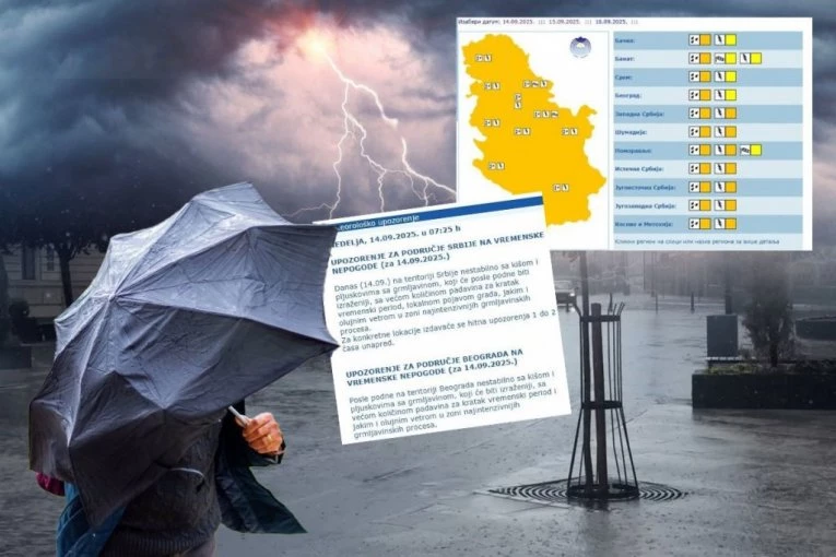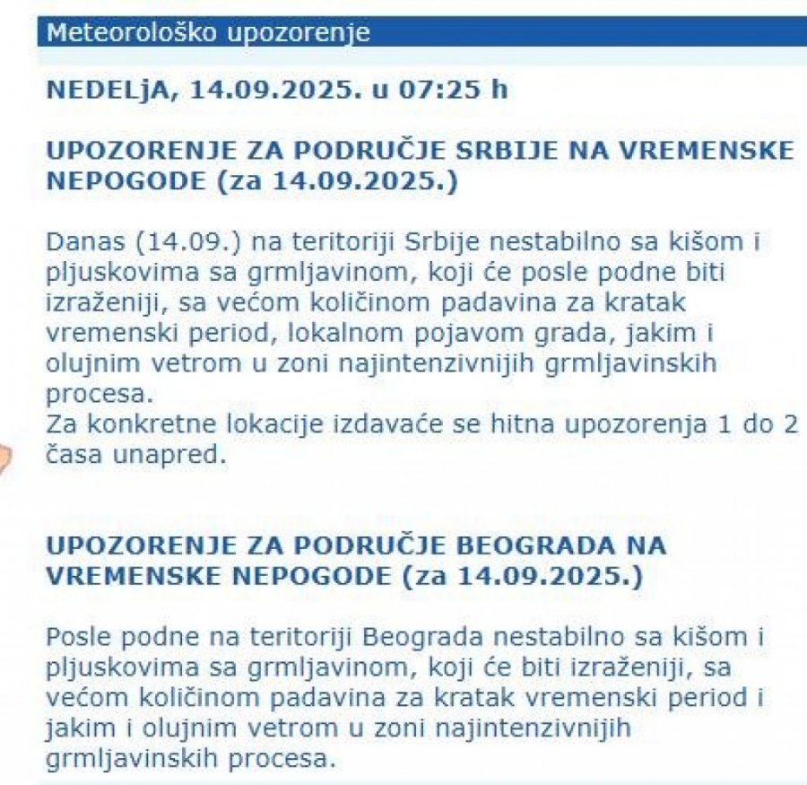 RHMZ NIŽE UPOZORENJA! DANAS NA UDARU I BEOGRAD! Pljuskovi, grmljavina, grad i olujni vetar! Autor: Republika/ T. J. Vesti 14.09.2025 10:50 Pratite nas i putem Android ili iOS aplikacija Za konkretne lokacije izdavaće se hitna upozorenja jedan do dva časa unapred. Foto: Shutterstock/Roman Mikhailiuk/Marta Fernandez Jimenez, RHMZ Printscreen Danas na teritoriji Srbije nestabilno sa kišom i plјuskovima sa grmlјavinom, koji će posle podne biti izraženiji, sa većom količinom padavina za kratak vremenski period, lokalnom pojavom grada, jakim i olujnim vetrom u zoni najintenzivnijih grmlјavinskih procesa. Za konkretne lokacije izdavaće se hitna upozorenja jedan do dva časa unapred. Upozorenje za Beograd Posle podne na teritoriji Beograda nestabilno sa kišom i plјuskovima sa grmlјavinom, koji će biti izraženiji, sa većom količinom padavina za kratak vremenski period i jakim i olujnim vetrom u zoni najintenzivnijih grmlјavinskih procesa. Foto: RHMZ Printscreen Vreme danas Danas prolazno naoblačenje sa severozapada sa kišom i plјuskovima sa grmlјavinom koje će pre podne zahvatiti severne, zapadne i jugozapadne krajeve do kraja dana će se proširiti i na ostale. Izraženiji plјuskovi se očekuju posle podne i uveče kada je moguća i veća količina padavina za kratak vremenski period, kao i lokalna pojava grada. U košavskom području u prvom delu dana duvaće umeren i jak jugoistočni vetar, na jugu Banata i u donjem Podunavlјu i sa udarima olujne jačine. Foto: RHMZ Printscreen Vetar će posle podne biti u slablјenju i u skretanju na severozapadni, osim u oblasti najintenzivnijih grmlјavinskih procesa gde može biti jak i olujni. Najviša temperatura od 23 °C na severozapadu do 30 °S na jugoistoku Srbije. Foto: RHMZ Printscreen Vreme narednih dana Sledeće sedmice pretežno sunčano uz promenlјivu oblačnost, a kratkotrajne padavine očekuju se još samo u ponedelјak ujutru i pre podne na istoku i jugu, u utorak i sredu na severu Srbije. Biometeorološka prognoza Osobama sa srčanim i disajnim tegobama se savetuje opreznost usled očekivanog uticaja biometeorološke situacije. Bolovi u mišićima, pospanost i glavobolјa su mogući kod meteoropata. Svim učesnicima u saobraćaju se preporučuje pojačana koncentracija. Poštovani čitaoci, možete nas pratiti i na platformama: Facebook, Instagram, YouTube, TikTok, Telegram, Vajber. Pridružite nam se i prvi saznajte najnovije i najvažnije informacije. Naše aplikacije možete skinuti sa Google Play i Apple AppStore. Pročitajte i... Vremenska prognoza 12:11 13.09.2025 ZAHLAĐENJE JURI PREMA SRBIJI! OVI gradovi prvi na udaru - SPREMA SE OLUJA I GRAD! Vremenska prognoza 22:06 29.08.2025 ODMAH ZGRABITE KIŠOBRANE! VEĆ NOĆAS STIŽE JAKO NEVREME! Trajaće danima! RHMZ izdao upozorenje, postoji opasnost od VELIKE KOLIČINE PADAVINA Vremenska prognoza 20:05 25.08.2025 EKSTREMNO NEVREME STIŽE U SRBIJU! Oluja već hara ovim delovima zemlje - LOVAC NA SUPERĆELIJE NAJAVLJUJE HAOS! Vremenska prognoza 06:20 10.09.2025 JESEN POLAKO POČINJE? Kraj vrelih dana je došao, ušli smo u period izrazitih vremenskih oscilacija - STIŽE TALAS PADAVINA Tagovi RHMZ Vremenska prognoza Vreme Vreme u Srbiji Srbija Kiša Nevreme Grmljavina Grad Oluja Komentari (0) Vesti Politika 11:24 BLOKADERI BI DA UNIŠTE SRBIJU! Brnabićeva iznela jasan stav: Šalju pisma protiv Srbije, ne znaju koju da izvuku! Društvo 11:10 TELEKOM SRBIJA UVEO NAPREDNU 5G MREŽU KOJU KORISTI SAMO 2 ODSTO EVROPLJANA! Lučić: Revolucija u mobilnim komunikacijama Društvo 11:05 VOZAČI, VAŽNA INFORMACIJA: Objavljene nove cene goriva koje će važiti do 12. decembra! 10:39 ODLUKA DRŽAVE KOJA JE PRIVUKLA PAŽNJU VERNIKA: Zavet monahinje Jefimije izvezen nitima bola dobio pečat večnosti Politika 09:59 IZ PORTE CRKVE U LIPLJANU SKINUTA ZASTAVA SPC! Nadzorna kamera sve snimila: Zastavu je sa zvonare skinula osoba koja je na glavi imala fantomku Društvo 09:34 ZABRINJAVAJUĆI PODACI: Svaka 4. osoba u Srbiji je žrtva digitalnog nasilja i to najčešće žene! Beograd 09:29 AUTOKOMANDA ĆE BITI KRCATA! Radovi na jednoj od najprometnijih soabraćajnica u Beogradu, menjaju se i trase prevoza! Društvo 09:10 Naslov: Pomozimo Luki slanjem 306 na 2407 Društvo 09:04 VAŽNA VEST ZA SVE RODITELJE: Prijave za besplatne novogodišnje paketiće i u ponedeljak! Politika 09:01 PIPER RASKRINKAO PAKLENI PLAN MILOŠA JOVANOVIĆA: Učestvovaće na izborima, potpisaće zapisnik, a onda će reći da ih NE PRIZNAJE! Društvo 08:57 GUŽVE NA GRANICAMA SVE VEĆE: Novi EU sistem produžava čekanja, vozači u problemu! Društvo 08:37 SNEG NEĆEMO VIDETI OVOG DECEMBRA? Iznenađujuća izjava meteorologa! Društvo 08:36 ZA DOČEK DERU KOŽU S LEĐA! Nova godina i do 500 evra po osobi u Beogradu, evo kakve su cene u Srbiji! Politika 08:25 SRBI OTERALI KURTIJA: Od danas ponovo odlučuju o ovim pitanjima! Društvo 07:39 POJAVILA SE ZARAZA U BEOGRADSKIM VRTIĆIMA! Ustanove roditeljima prosledile obaveštenje - CELE PORODICE OBOLELE OD INFEKCIJE! 07:30 JEDINSTVO KOJE NI ĐAVO NE MOŽE RAZBITI: Vladika Nikolaj otkriva šta nas zaista drži na okupu kad sve vuče ka podelama Beograd 06:30 MUŠKARCA (50) UBIO VOZ U ZEMUNU! Hitna pomoć zbog jedne stvari imala PUNE RUKE POSLA! Srbija 06:22 SEDAM SATI ČEKANJA NA GRANICI! Potpuni kolaps na OVIM prelazima, spremite se! Vremenska prognoza 06:05 KIŠA I OLUJNI NALETI KOŠAVE! U Srbiji danas oblačno i tmurno - EVO kada se očekuje razvedravanje! 06:01 VERSKI KALENDAR ZA PETAK 5. DECEMBAR 02:01 ZAŠTO MUSLIMANI PETKOM OSTAVLJAJU SVE I ODLAZE NA ZAJEDNIČKU MOLITVU: Tajna koja vekovima okuplja vernike 00:02 ZAŠTO SE VERNICI DANAS TOLIKO MUČE: Sveti Porfirije otkriva u čemu ljudi obično greše Društvo 00:01 DNEVNI HOROSKOP ZA 5. DECEMBAR: Rakovi ulaze u novo ljubavno poglavlje, Lavovi konačno dobijaju novac, a Strelčevi otkrivaju ko im radi iza leđa Srbija 23:00 04.12.2025 ODVEO SLOBU U HAG, PA SE SKUĆIO U HRVATSKOJ: Ovako je Karlin istražitelj Ke