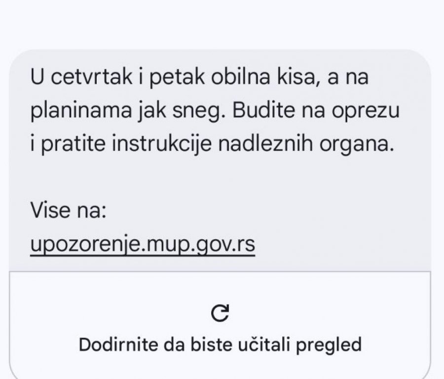 HITNO SE OGLASIO SEKTOR ZA VANREDNE SITUACIJE: U četvrtak i petak strahovite padavine i sneg! Autor: Republika/J.B. Vesti 01.10.2025 13:56 Pratite nas i putem Android ili iOS aplikacija U periodu od 48 sati može napadati između 50 i 90 litara kiše. Foto: Tanjug/RADE PRELIĆ, Freepik Sektor za vanredne situacije MUP Srbije upozorio je građane na nevreme koje će pogoditi zemlju u četvrtak i petak. - U četvrtak i petak obilna kiša, a na planinama jak sneg. Budite na oprezu i pratite instrukcije nadležnih organa - tekst je koji je prosleđen građanima putem SMS poruke. Foto: Printskrin SMS poruka koja građanima stiže Podsetimo, i RHMZ je najavio obilne padavine u četvrtak i u petak, i to u delovima južne, centralne i istočne Srbije. Kako su rekli, u periodu od 48 sati može napadati između 50 i 90 litara kiše. Istovremeno, u planinskim predelima se očekuje obilan sneg i formiranje snežnog pokrivača od preko 30cm. Podsećamo, RHMZ je izdao hitno upozorenje građanima. - Usled obilnih padavina koje se na području centralne i južne Srbije očekuju u četvrtak i petak (02. i 03.10.2025.), RHMZ Srbije je pokrenuo sistem za prenos SMS hitnih informacija građanima. Padavine mogu prouzrokovati značajne probleme u saobraćaju, lokalne bujice, odrone i klizišta i izazvati materijalnu štetu. U višim predelima kiša će preći u sneg, koji će se intenzivirati u četvrtak posle podne i uveče. U južnim delovima Raškog, Moravičkog i Zlatiborskog okruga, na području Kosova i Metohije, kao i u planinskim predelima Rasinskog i Topličkog okruga do petka posle podne očekuje se da padne i više od 50 cm vlažnog snega. Osim problema u saobraćaju, transportu i drugim vidovima komunikacije, sneg može izazvati probleme u snabdevanju električnom energijom, izazvati oštećenja na dalekovodima, ali i materijalnu štetu na dotrajalim krovovima. Rizik od grana koje se lome sa drveća, ledenica i blokada puteva, koje mogu u potpunosti da onemoguće akcije spašavanja. Preporuka je da se u četvrtak i petak ne kreće na put u planinske predele, naročito u navedenim regionima - najavio je RHMZ i dodao da treba biti na oprezu. BONUS VIDEO Poštovani čitaoci, možete nas pratiti i na platformama: Facebook, Instagram, YouTube, TikTok, Telegram, Vajber. Pridružite nam se i prvi saznajte najnovije i najvažnije informacije. Naše aplikacije možete skinuti sa Google Play i Apple AppStore. Pročitajte i... Vremenska prognoza 13:40 01.10.2025 GRAĐANIMA ĆE STIZATI HITNE PORUKE UPOZORENJA! Sutra i prekosutra prava kataklizma u Srbiji - sručiće se ogromna količina kiše, a OVE krajeve OKOVAĆE SNEG! Vremenska prognoza 08:26 01.10.2025 HITNO UPOZORENJE RHMZ! Pašće do 120 mm kiše za 2 dana, a OVI krajevi biće okovani snegom! Vremenska prognoza 06:20 10.09.2025 JESEN POLAKO POČINJE? Kraj vrelih dana je došao, ušli smo u period izrazitih vremenskih oscilacija - STIŽE TALAS PADAVINA Vremenska prognoza 11:00 09.09.2025 NEVREME PRETI DA PROGUTA BALKAN! Srbija "između dve vatre", komšiluk pred POTOPOM (FOTO) Tagovi RHMZ Vremenska prognoza vreme danas Srbija Beograd Vreme u Srbiji Vreme u Beogradu beograd vreme Beograd vremenska prognoza Temperatura Temperatura u Beogradu trenutna temperatura trenutna temperatura beograd Sektor za vanredne situacije Nevreme Padavine Kiša Pljusak Komentari (0) Vesti Politika 11:48 VELJKOVIĆ BRANI I PRAVDA BLOKADERE! Novinar S napisao uvredljive reči za bolesnu baku koju su maltretirali u Zemunu! (FOTO) 11:25 Ovo voće ima NAJVIŠE ŠEĆERA i pazite koliko jedete! Dr Veroslava savetuje - to je MERA koju ne smete prekoračiti Politika 10:55 PROMENE U BIA: Smenjen Marko Parezanović, na njegovom mestu Nikola Vasiljević! Politika 10:52 SRAMOTA ŠTA RADE VIŠE! Blokaderka cepala TROBOJKU - njihova mržnja ide iz krajnosti u krajnost! (VIDEO) 10:37 PATRIJARH SRPSKI I ČETVORICA VLADIKA OTPUTOVALI U JORDAN NA POZIV KRALJA ABDULAHA: Put koji je važniji nego što izgleda Politika 10:20 ŠTA JE BAKA ZGREŠILA DA BI JE LEGITIMISALI?! Blokaderi napravili pakao BOLESNOJ ŽENI, u svemu učestvovala i policajka! (VIDEO) 10:08 DA LI SU NAMIRNICE, KOJE U SEBI SADRŽE TRAGOVE MLEKA I JAJA", POSNE: Teološkinja odgovorila na najčešće postavljeno pitanje, ali i otkrila gde vernici najčešće greše Politika 10:02 POLICAJKA POZVANA NA DISPCIPLINSKU ODGOVORNOST: Oglasio se MUP o legitimisanju bake u Zemunu tokom neprijavljenih blokada! Vremenska prognoza 09:53 VREMENSKI OBRT PRED NOVU GODINU: Stiglo upozorenje RHMZ i meterologa - evo šta nas čeka! 07:30 EVO KAKO ONAJ KOJI SILAZI NAJNIŽE POSTAJE NAJVIŠI: Vladika Nikolaj otkriva šta otvara vrata nebeskih visina i unutrašnje slobode Društvo 07:00 VRŠNJAČKO NASILJE U KRALJEVU KAO POSLEDICA BLOKADERSKOG LUDILA! ČITAJTE U SRPSKOM TELEGRAFU! 06:30 VREME JE ZA DERBI: Evo gde možete pratiti meč Zvezde i Vojvodine! Vremenska prognoza 06:18 DANAS SNEG - OBUCITE SE TOPLO! Najviša dnevna temperatura 10 stepeni, u Beogradu do 8! 06:01 VERSKI KALENDAR ZA NEDELJU 7. DECEMBAR 02:01 ŠTA NAM ŠAPUĆU NEBESA I ZEMLJA: Nevidljivi glasovi koji oblikuju naš život 00:12 HILJADE LJUDI SLILO SE U SINAGOGU NA VENČANJE KOJE ĆE SE PAMTITI DECENIJAMA: Ceo grad ispunjen molitvom i muzikom 00:02 OVO JE OPASNIJE I OD ORUŽJA JER UNIŠTAVA OBE STRANE: Sveti Nektarije se pita kojoj zmiji, kojoj aspidi dušu da predaju oni koji to rade Društvo 00:01 HOROSKOP ZA 7. DECEMBAR: Ribe - očekujte iznenadni trošak, Ovnovi - smirite strasti! Politika 23:51 06.12.2025 "NIJE SLEDILA PROFESIONALNE SMERNICE, RADI SE NA UTVRĐIVANJU ODGOVORNOSTI"! Policija o koleginici blokaderki koja je maltretirala bolesnu baku! 21:37 06.12.2025 SABLASNE SCENE U ZVEČANU - NOVI PRITISAK NA KOSOVSKE SRBE: Ikone po podu, oči svetaca izgrebane Politika 20:51 06.12.2025 GODINA BLOKADERSKOG IŽIVLJAVANJA PRETOČENA U NASILJE NAD DETETOM! Ovo je znak da su NASILNICI PRETERALI Politika 20:00 06.12.2025 PITANJE ZA POLICIJU KOJA SLUŽI BLOKADERIMA - Brnabić besna z