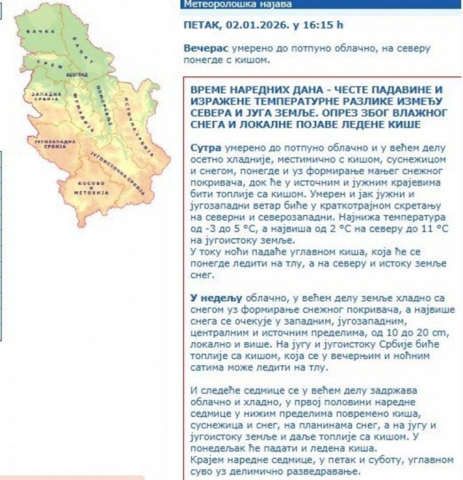 SPREMITE SE ZA NAOBLAČENJE SA KIŠOM! Hitno se oglasio RHMZ: OVI DELOVI SRBIJE PRVI NA UDARU! (FOTO) Autor: Republika/ T. J. Vesti 02.01.2026 18:29 Pratite nas i putem Android ili iOS aplikacija - Večeras umereno do potpuno oblačno, na severu ponegde s kišom. Foto: Republika Republički hidrometeorološki zavod oglasio se na svom zvaničnom sajtu najnovijim saopštenjem. - Večeras umereno do potpuno oblačno, na severu ponegde s kišom. Sutra umereno do potpuno oblačno i u većem delu osetno hladnije, mestimično s kišom, susnežicom i snegom, ponegde i uz formiranje manjeg snežnog pokrivača, dok će u istočnim i južnim krajevima biti toplije sa kišom. Umeren i jak južni i jugozapadni vetar biće u kratkotrajnom skretanju na severni i severozapadni. Najniža temperatura od -3 do 5 °S, a najviša od 2 °S na severu do 11 °S na jugoistoku zemlje. U toku noći padaće uglavnom kiša, koja će se ponegde lediti na tlu, a na severu i istoku zemlje sneg. U nedelju oblačno, u većem delu zemlje hladno sa snegom uz formiranje snežnog pokrivača, a najviše snega se očekuje u zapadnim, jugozapadnim, centralnim i istočnim predelima, od 10 do 20 cm, lokalno i više. Na jugu i jugoistoku Srbije biće toplije sa kišom, koja se u večernjim i noćnim satima može lediti na tlu. Foto: RHMZ I sledeće sedmice se u većem delu zadržava oblačno i hladno, u prvoj polovini naredne sedmice u nižim predelima povremeno kiša, susnežica i sneg, na planinama sneg, a na jugu i jugoistoku zemlje i dalje toplije sa kišom. U ponedeljak će padati i ledena kiša. Krajem naredne sedmice, u petak i subotu, uglavnom suvo uz delimično razvedravanje. - stoji na sajtu RHMZ. Poštovani čitaoci, možete nas pratiti i na platformama: Facebook, Instagram, YouTube, TikTok, Telegram, Vajber. Pridružite nam se i prvi saznajte najnovije i najvažnije informacije. Naše aplikacije možete skinuti sa Google Play i Apple AppStore. Pročitajte i... Vremenska prognoza 17:31 31.12.2025 U NOVOGODIŠNJOJ NOĆI TEMPERATURA PADA I DO - 7! Dobro se obucite, OVI delovi zemlje će se ZALEDITI! Vremenska prognoza 13:34 21.12.2025 SA SNEGOM U NOVU GODINU! Tačno ovog datuma kreće smrzavanje (MAPE) Vremenska prognoza 06:12 24.12.2025 POSLE LEPOG DANA STIŽU PADAVINE! Sneg se vraća u niže predele, košava nosi sve pred sobom, a temperatura pada! Vremenska prognoza 23:26 01.01.2026 JAKO ZAHLAĐENJE, A OD OVOG DATUMA SNEG! Srbija će biti zavejana -sve se menja, spremite se! Tagovi Nevreme u Srbiji nevreme danas Beograd nevreme Oluja vremenska prognoza Beograd Vremenska prognoza Sneg RHMZ Prethodna vest Sledeća vest Komentari (0) Vesti Politika 20:00 EKOLOŠKI TERORIZAM: RADIOAKTIVNIM OTPADOM PROTIV SRBA! Hrvati bi preko Save da zatruju pola Srbije! 19:59 ODBILA JE BRAK, MOĆ I SIGURNOST I PLATILA NAJVIŠU CENU: Crkva sutra slavi praznik posvećen Svetoj mučenici Julijani Društvo 19:56 VELIKI UDAR NA NOVČANIKE VOZAČA! Uskoro na snagu stupa novi Zakon o bezbednosti saobraćaja - KAZNE DRASTIČNO SKAČU! 19:38 Kardiohirurg otkriva 4 namirnice koje nikada ne jede: NAJGORE su za SRCE i skraćuju život Srbija 19:04 KILOMETARSKE KOLONE NA GRANICAMA! Čeka se satima - OVO SU NAJKRITIČNIJE TAČKE! Politika 18:59 Vučić sutra obilazi završne radove na novom objektu za obuku "Kobri" Srbija 18:51 SNEG VEJE U OVOM DELU SRBIJE! Vozači, oprez, na snazi su i zabrane! Vremenska prognoza 18:29 SPREMITE SE ZA NAOBLAČENJE SA KIŠOM! Hitno se oglasio RHMZ: OVI DELOVI SRBIJE PRVI NA UDARU! (FOTO) Politika 18:00 DVE BEBE VIŠE NEGO LANE: Simbolična brojka koja na najbolji način govori o našoj borbi za opstanak na Kosovu! Politika 17:59 "ZAHVALAN SVIMA KOJI PODRŽAVAJU IZGRADNJU, A NE RUŠENJE SRBIJE!" Oglasio se predsednik Vučić! (VIDEO) Društvo 17:46 AMBASADOR POTVRDIO - ČETIRI SRPSKA DRŽAVLJANINA SU BILA U BARU SMRTI! Ovo su najnovije informacije o žrtvama požara u novogodišnjoj noći! 17:07 POMOLIMO SE ZA POKOJ DUŠA 40 NASTRADALIH U NOVOGODIŠNOJ TRAGEDIJI: Patrijarh Danilo uputio dirljivu poruku saučešća porodicama žrtava 16:54 Gorušica u sekundi nestaje: Ovaj starinski trik iz kuhinje je pravo čudo za želudac Politika 16:11 "PROPALI POLITIČAR I DOKAZANI LOPOV!" Oglasila se Adrijana Mesarović o Draganu Đilasu! (FOTO) 15:26 OVA GRUPA LJUDI ĆE SE UGUŠITI U BRIGAMA: Starac Jefrem upozorava na pogubnu naviku prisutnu kod mnogih 14:59 PRIZOR KOJI SE VEOMA RETKO VIĐA: Snimci Sabornog hrama u Podgorici danas obišli region (VIDEO) Beograd 14:10 HRONOLOGIJA NAPADA NA NOVINARE! ANS predstavlja dokument o bezbednosti novinara i rastućim pretnjama, s kojima se suočavaju Vremenska prognoza 13:59 HITNO UPOZORENJE! Hladni talas stiže u Srbiju – sneg, led i minusi već od večeras! 13:46 BORBA ZA ŽIVOT SRPSKOG SVEŠTENIKA U JERUSALIMU: Protojereju Saši Krstiću prestaje rad pluća – potrebna hitna novčana pomoć Društvo 13:10 POST U TRUDNOĆI - DA ILI NE? Otac Predrag upozorio trudnice da se ne prejedaju, pa otkrio šta treba da rade sredom i petkom (VIDEO) Srbija 13:07 Gradonačelnik Niša Dragoslav Pavlović osudio ponovni napad na prostorije Pokreta za narod i državu u Nišu 12:39 NAJTRAŽENIJI MANASTIRSKI KOLAČ NA VODI: Priprema se jednostavno, a sa tanjira nestaje za tren (VIDEO) 12:05 PEDIJATAR odgovara šta ga sve "novopečeni roditelji" pitaju: "Mene PLAČ BEBE nikad ne uplaši, zapravo me raduje!" (VIDEO) 11:49 EVROPA OSTAJE BEZ DECE? Sveštenici upozoravaju da se Stari kontinent pretvara u demografsko groblje Društvo 10:12 PAZITE KO VAM DANAS DOLAZI U KUĆU! Od prvog gosta zavisi kakva će biti CELA GODINA! Društvo 09:58 Pomozimo Mihailu slanjem 302 na 2407 09:34 DA SE NIKADA NE ZABORAVI: Vladika Pajsije služio godišnji pomen žrtvama velike tragedije koja je novogodišnju noć na Cetinju pretvorila u noć bola Vremenska prognoza 08:36 DO 15 STEPENI U SRBIJI! Sneg u Beogradu i Novom Sadu četiri dana zaredom – prognoza RHMZ! Društvo 07:38 Zemljotres kod Leskovca: Građani osetili podrht
