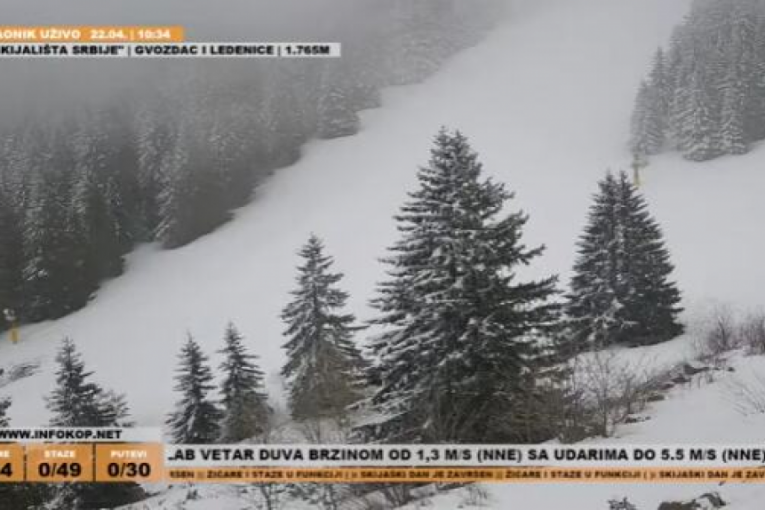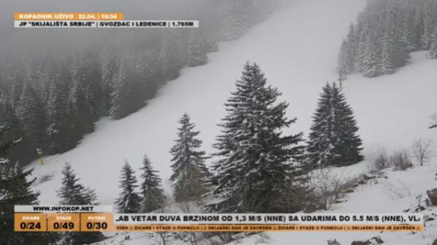 POTPUNO NESTVARAN PRIZOR! Kao da je januar - sve se beli, sve je spremno za skijanje na Kopaoniku! (FOTO) Autor: Republika/T.Đ Vesti 22.04.2026 12:08 Pratite nas i putem Android ili iOS aplikacija Trenutno je 0 stepeni, dok je prethodnih dana išlo i u miunus. Foto: Infokop.net kamere Prizori sa Kopaonika, jedne od najlepših srpskih planina i velikog skijaškog centra u regionu, ne prestaju da zadivljuju s obzirom da smo skoro pred sam kraj aprila. Za razliku od ostatka Srbije gde je odavno već sve ozelenelo, u tom kraju i dalje se sve beli kao da smo usred januara. Čak i u ovom trenutku veje sneg. A i tamošnje temperature bitno se razlikuju u odnosu na ostale delove zemlje u kojima je živa već na 14. podeoku, poput Zrenjanina. Kad je reč o snegu, koji je i juče vejao na Kopaoniku - ima ga između 5 i 7 centimetara. Na toj planini trenutno je nula stepeni. Infokop.net kamere Pogledaj galeriju Infokop.net kamere Pogledaj galeriju Infokop.net kamere Pogledaj galeriju Infokop.net kamere Pogledaj galeriju Prema podacima RHMZ, danas u 10 časova najhladnije je bilo na Kopaoniku, gde je temperatura nula stepeni, a najtoplije je u Zrenjaninu, gde je temperatura 14. ZABELELO SE KAO USRED JANUARA: Potpuno neverovatan prizor na Kopaoniku - i temperatura otišla u minus! (VIDEO) Prognoza za naredne dane Danas promenlјivo oblačno sa sunčanim intervalima - kratkotrajna kiša ili lokalni plјusak pre podne se očekuju ponegde u Sremu i na zapadu Srbije, a tokom dana u brdsko-planinskim predelima. Na visokim planinama povremeno provejavanje slabog snega. Vetar slab i umeren, u Banatu, Podunavlјu i Pomoravlјu, kao i na istoku Srbije kratkotrajno i jak, severnih pravaca. Najviša temperatura od 13 do 17. Uveče prestanak padavina i razvedravanje. Od četvrtka toplije sa više sunca Sutra ujutru ponegde slab prizemni mraz. Tokom dana pretežno sunčano uz malu i umerenu oblačnost i toplije. Vetar slab i umeren severozapadni, sredinom dana i posle podne i jak. Jutarnja temperatura od 0 do 6, a najviša dnevna od 16 do 20. Do kraja sedmice pretežno sunčano uz promenlјivu oblačnost i dnevne temperature u okviru prosečnih vrednosti za treću dekadu aprila, prognozira RHMZ. Poštovani čitaoci, možete nas pratiti i na platformama: Facebook, Instagram, YouTube, TikTok, Telegram, Vajber. Pridružite nam se i prvi saznajte najnovije i najvažnije informacije. Naše aplikacije možete skinuti sa Google Play i Apple AppStore. Tagovi Kopaonik Zima Sneg Nevreme sneg na kopaoniku Prethodna vest Sledeća vest Komentari (0) Vesti Politika 13:28 DA FABRIKA STAKLA BUDE NA PONOS SVIMA! Vučić u Paraćinu: Verujem da Vaider kompanija može da postigne velike rezultate, imaće podršku države! (FOTO, VIDEO) Društvo 13:15 ZABELELA SE IVANJICA USRED PROLEĆA! Sneg prekrio ivanjička sela, meštani strepe zbog štete na malinama Društvo 13:11 ŽENA UKLANJA IME POKOJNOG MUŽA S NADGROBNE PLOČE?! Šok-snimak sa srpskog groblja - komentari ne prestaju da se nižu! (VIDEO) Srbija 13:05 IZDALI STAN PARU S DETETOM, PA DOŽIVELI ŠOK! Kad su otvorili vrata, sačekao ih prizor iz pakla! (FOTO) 13:02 PATRIJARH PORFIRIJE OKUPIO CRKVENI VRH: Važne odluke o upravljanju i budućim koracima 12:20 PROBAJTE MANASTIRSKI KOLAČ OD GRIZA I VINA – ODUŠEVIĆETE SE: Jednostavan recept koji spaja neočekivane arome Vremenska prognoza 12:15 TEMPERATURA PADA NA MINUS 5 STEPENI! Sledi ledeno jutro u Srbiji: Mraz u ovim krajevima, evo gde će biti najhladnije 12:09 Prof. dr Ana Mitrović Jovanović: Za RAK JAJNIKA ne postoji skrining - zato obratite pažnju na ove simptome na vreme! (VIDEO) Vremenska prognoza 12:08 POTPUNO NESTVARAN PRIZOR! Kao da je januar - sve se beli, sve je spremno za skijanje na Kopaoniku! (FOTO) Politika 10:53 OČIGLEDNO JE NAMERA TZV. POLICIJE BILA DA TO UČINI NA PREVARU: Opština Severna Mitrovica iznela jasan stav u vezi sa rušenjem garaža! Politika 10:34 "NIKADA NEĆEMO ZABORAVITI STRADANJE NAŠEG NARODA!" Oglasili se Čotrić i Jugović o genocidu u NDH! Politika 10:27 STIŽE NAM NOVA FABRIKA NAMEŠTAJA! Ministarka Mesarović podelila divne vesti iz Kine! 10:17 7 RAZLOGA ZBOG KOJIH BI SVAKI PRAVOSLAVNI DOM TREBALO DA IMA CRKVENI KALENDAR: Otac Srećko otkriva šta se gubi kada ga nema na zidu Politika 10:07 RUSI SU SE HITNO OGLASILI I OVO PORUČILI O ALARMANTNOM STANJU RATKA MLADIĆA! Imaju plan! Politika 09:37 OPOZICIJU OBAVILA STREPNJA, SVE LAĐE TONU - SVE JAVNO PRIZNAJU! On im je perfidno zabio NOŽ u leđa? Društvo 09:34 "MEDIJSKA MREŽA NE SME DA STANE, IDEMO DALJE!" Obeležili smo prvu deceniju rada - ovo je tek početak! Spektakularan jubilej uz visoke zvanice! (FOTO, VIDEO) Politika 09:17 OVO JE RAZLOG! Otkriveno zbog čega EU nije zamrzla 1,6 milijardi evra Srbiji! Politika 08:24 UDARNO! LEKARI ODBIJAJU RATKU MLADIĆU DA PRIKLJUČE INFUZIJU! Sin Darko otkriva potresne detalje: Potvrdili su da je na samrti! 08:01 ONO ŠTO IZGLEDA KAO GUBITAK, MOŽDA JE TEK POČETAK: Vladika Nikolaj kroz jednostavnu biblijsku sliku otvara pitanje koje se tiče svakog čoveka Politika 07:58 STIGLO JE NAREĐENJE DA SE POBIJU SVI, A ONDA JE KRENUO PROBOJ! Danas je Dan sećanja na žrtve Holokausta: Obeležava se 81. godina proboja logora Jasenovac Društvo 07:27 Ogromne gužve na granicama: Batrovci, Šid i Horgoš u crvenom – najnovije stanje Politika 07:13 ODLUKA PADA ZA ĐURĐEVDAN! Vučić rešio sve dileme - Izbori mogu već na leto, ovo su svi datumi koji su u igri! Politika 06:23 STAKLARSKI GIGANT PONOVO ĆE ZABLISTATI: Vučić prisustvuje otvaranju najmodernijeg pogona u Paraćinu Vremenska prognoza 06:13 Stiže zahlađenje: Pljuskovi, vetar i sneg na planinama – detaljna prognoza za danas 06:01 VERSKI KALENDAR ZA UTORAK 21. APRIL 00:02 "LJUDI KOJI PATE OD DEPRESIJE NISU BOLESNI, NEGO IM JE ODUZETO OVO": Starac Tadej otkrio kako se rešava jedan od najvećih problema savremenog čoveka Društvo 00:01 HOROSKOP ZA 22. APRIL: Rakovi - problematičan dan na poslu, Jarčevi - slobodno načinite pr