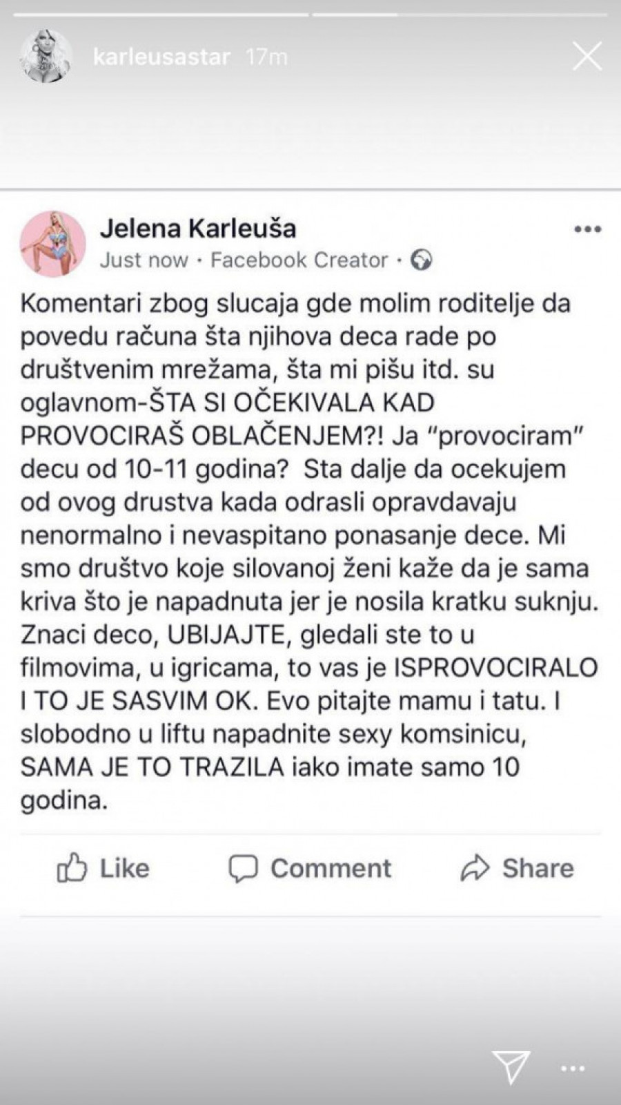 - Komentari zbog slučaja gde molim roditelje da povedu računa šta njihova deca rade po društvenim mrežama, šta mi pišu itd. su uglavnom- Šta si očekivala kad provociraš oblačenjem?! Ja provociram decu od 10-11 godina? Šta dalje da očekujem od ovog društva kad odrasli opravdavaju nenormalno i nevaspitano ponašanje dece. Mi smo društvo koje silovanoj ženi kaže da je sama kriva što je napadnuta jer je nosila kratku suknju. Znači deco, ubijajte, gledli ste to u filmovima, igricama, to vas je isprovociralo i to je sasvim ok. Evo pitajte mamu i tatu. I slobodno u liftu napadnite se*si komšinicu, sama je to tražila iako imate 10 godina - napisala je Jelena vidno iznervirana.