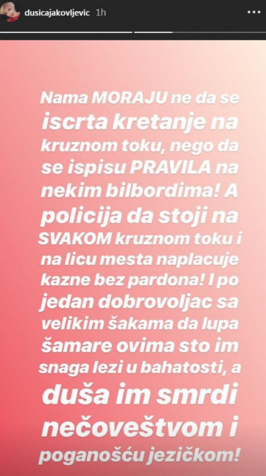 - Nama moraju, ne da iscrtaju kretanje na kružnom toku, nego da se ispišu pravila na nekim bilbordima! A policija da stoji na svakom kružnom toku i na licu mesta naplaćuje kazne bez pardona! I po jedan dobrovoljac sa velikim šakama da lupa šamare ovima što im snaga leži u bahatosti, a duša im smrdi nečoveštvom i poganošću jezika - napisala je Dušica.