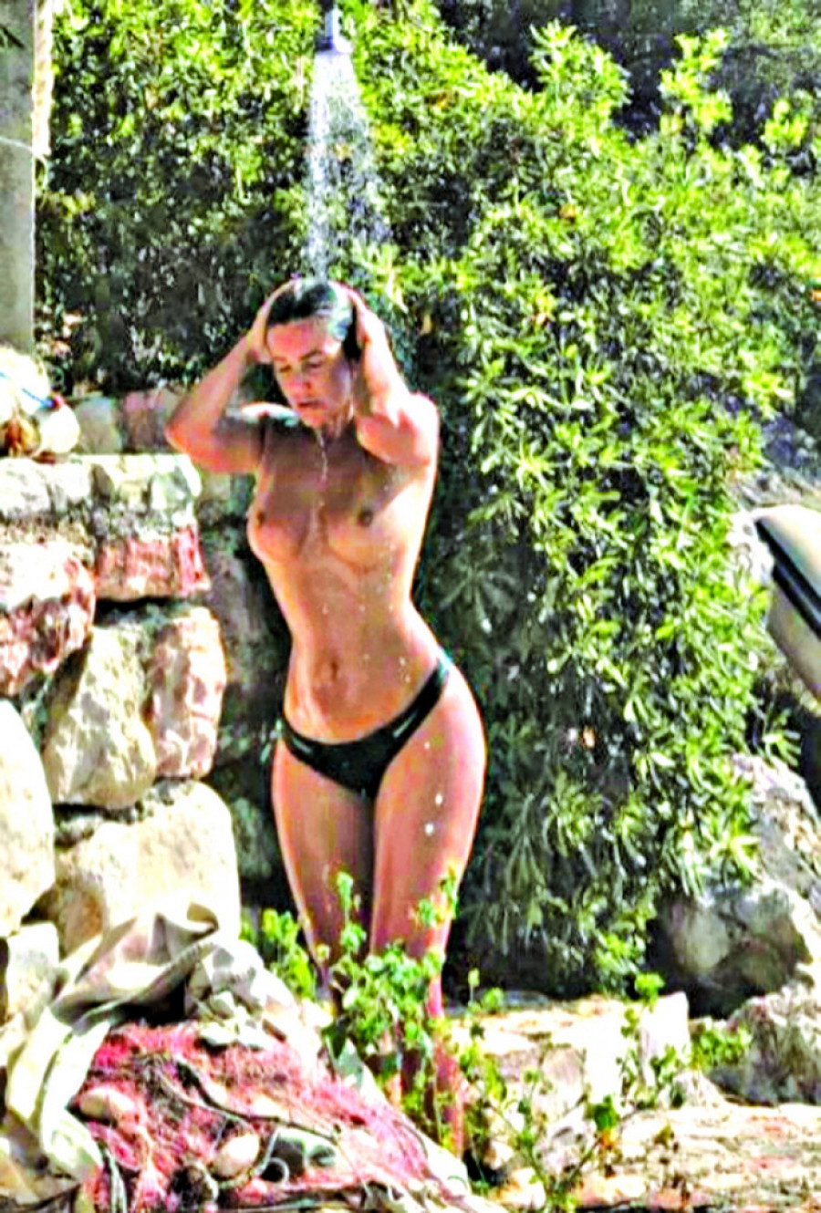 Kad joj je postalo previše vruće, otišla je pod tuš, te pokvasila bujno poprsje, spirajući slanu vodu. Međutim, pevačica je, sigurna da je niko ne posmatra, spustila i donji deo kupaćeg i ostala potpuno gola.