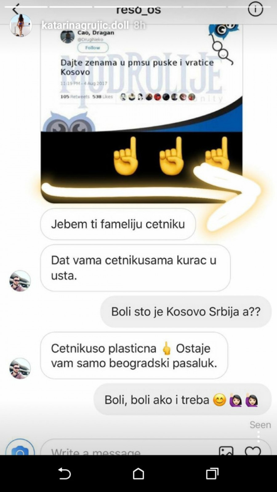 - Dajte ženama u pms-u puške i vratiće Kosovo - napisala je Grujićeva, a onda su usledile preteće poruke.