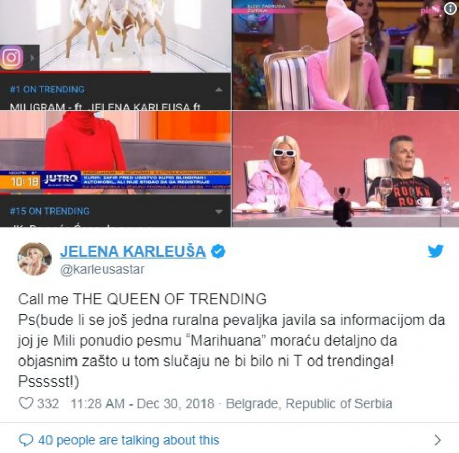 - Zovite me kraljicom trendinga! P. S. (bude li se još jedna ruralna pevaljka javila sa informacijom da joj je Mili ponudio pesmu “Marihuana” moraću detaljno da objasnim zašto u tom slučaju ne bi bilo ni T od trendinga! Pssssst!) - prokomentarisala je kratko Jelena.