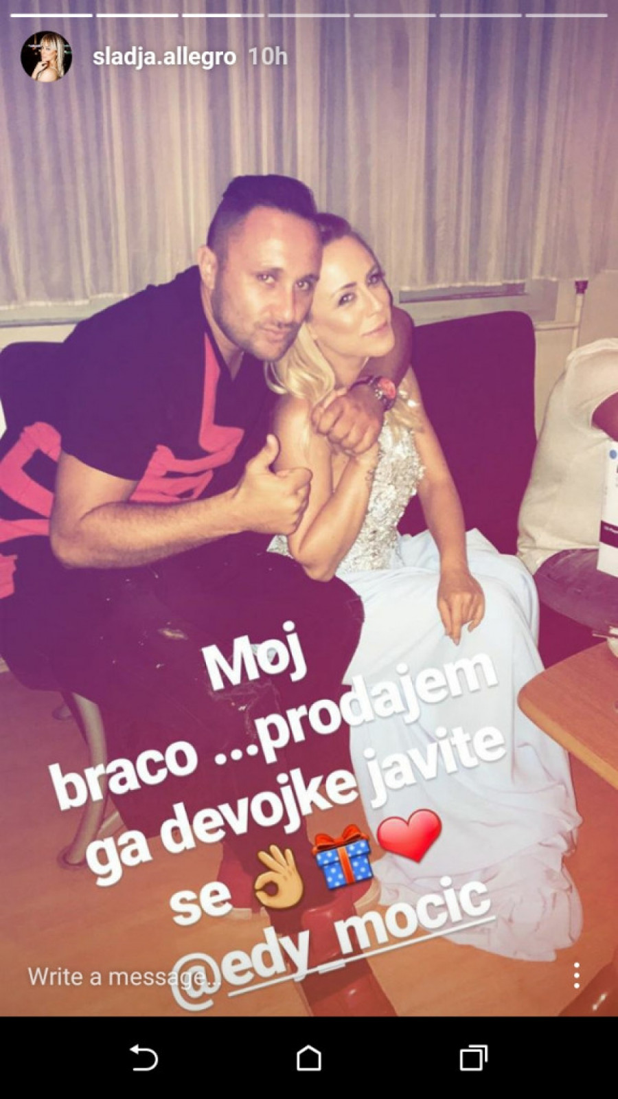 "Moj Braco. Prodajem ga. Devojke, javite se!", napisala je Slađa šaljiv opis fotografije.