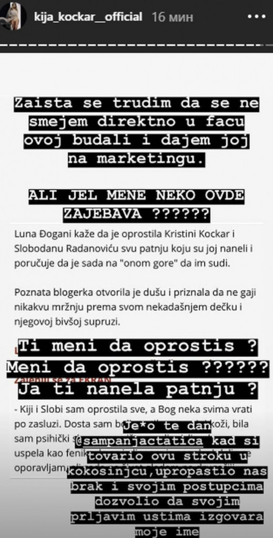 Kristina Kija Kockar nedavno je brutalno odreagovala na izjavu Lune Đogani da Slobodanu Radanoviću i njoj sve oprašta, a sada je otkrila i koliko ju je blogerkina izjava izrevoltirala.