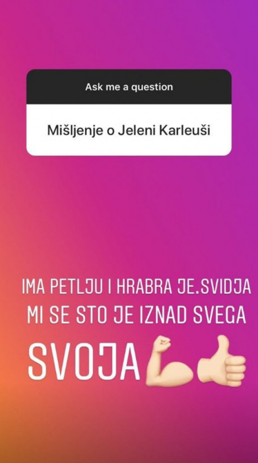 Foto: instagram.com/badrichOdgovarajući na pitanja fanova Nina je, takođe, progovorila i o hrabrosti koja krasi njenu koleginicu pevačicu Jelenu Karleušu.