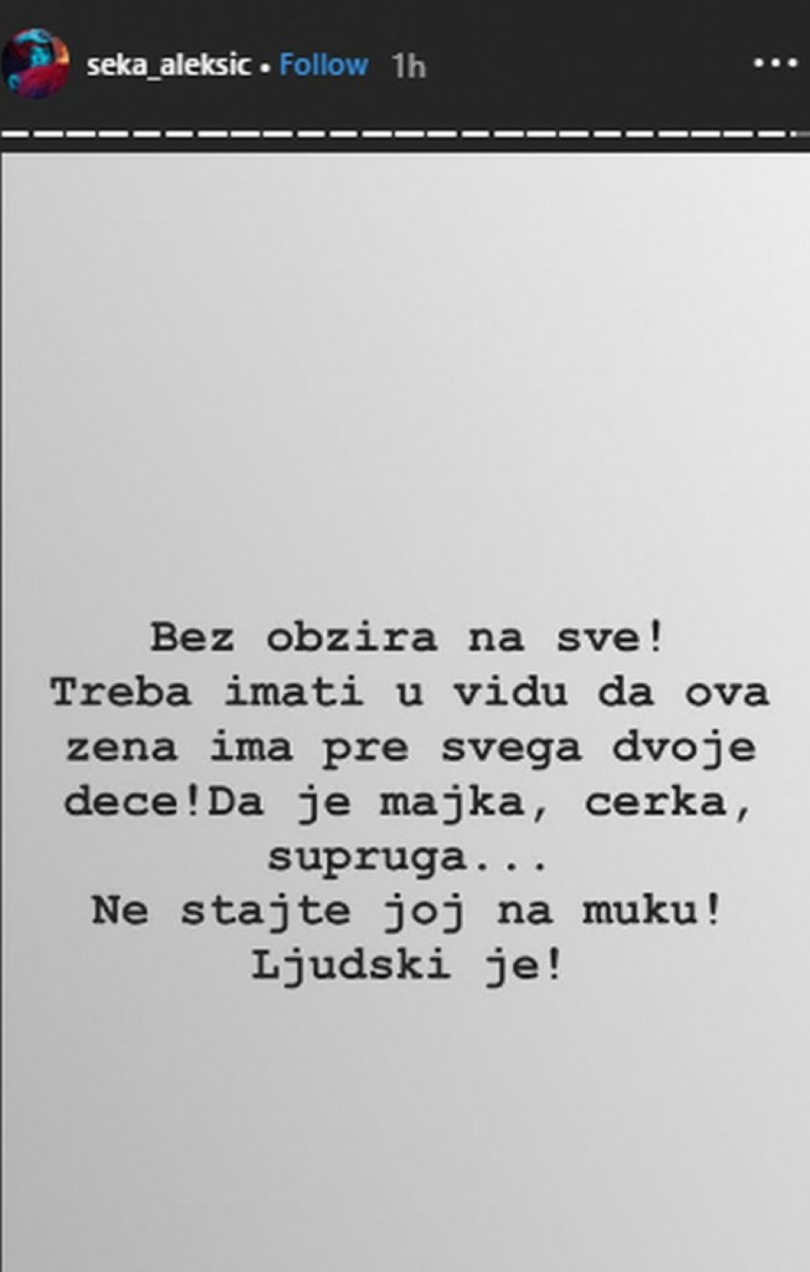 - Bez obzira na sve! Treba imati u vidu da ova žena ima pre svega dvoje dece! Da je majka, ćerka, supruga... Ne stajte joj na muku! Ljudski je! - napisala je Seka.