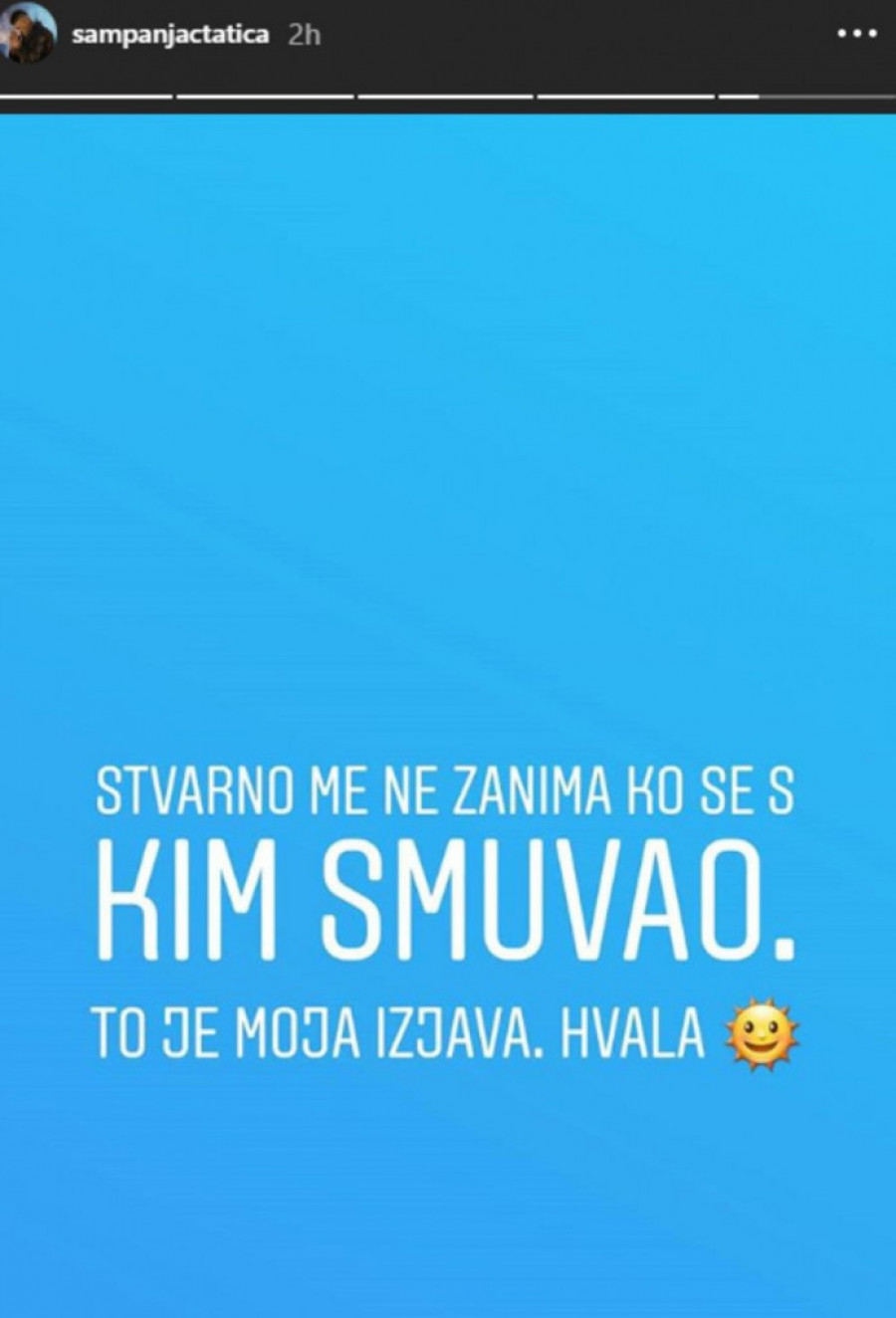 Foto: printscreen/instagram.com/sampanjactatica- Stvarno me ne zanima ko se s kim smuvao. To je moja izjava. Hvala.
