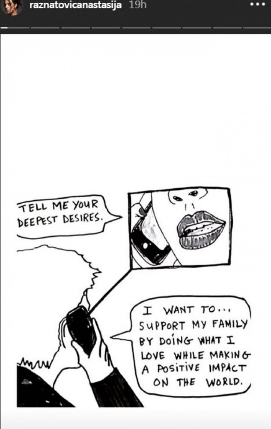 Mlada Ražnatovićeva je objavila fotografiju na Instagramu na kojoj momak i devojka razgovaraju o svojim željama. Koliko god njen život izgledao lagodno, reklo bi se da Taša ipak ima jednu želju, za koju još nismo sigurni da se ispunila, s obzirom na to da svoj ljubavni život ne voli da iznosi u javnost. Ona je na svom Instagramu objavila skicu devojke i dečka, a njihov razgovor ide ovako: