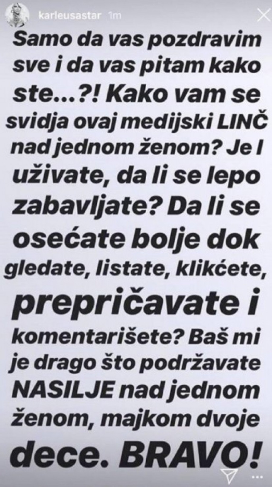 Foto: instagram.com/karleusastar- Samo da vas pozdravim sve i da vas pitam kako ste...?! Kako vam se sviđa ovaj medijski linč nad jednom ženom? Je l' uživate, da li se lepo zabavljate? Da li se osećate bolje dok gledate, listate, klikćete, prepričavate i komentarišete? Baš mi je drago što podržavate nasilje nad jednom ženom, majkom dvoje dece. Bravo - napisala je Jelena pa ubrzo obrisala.