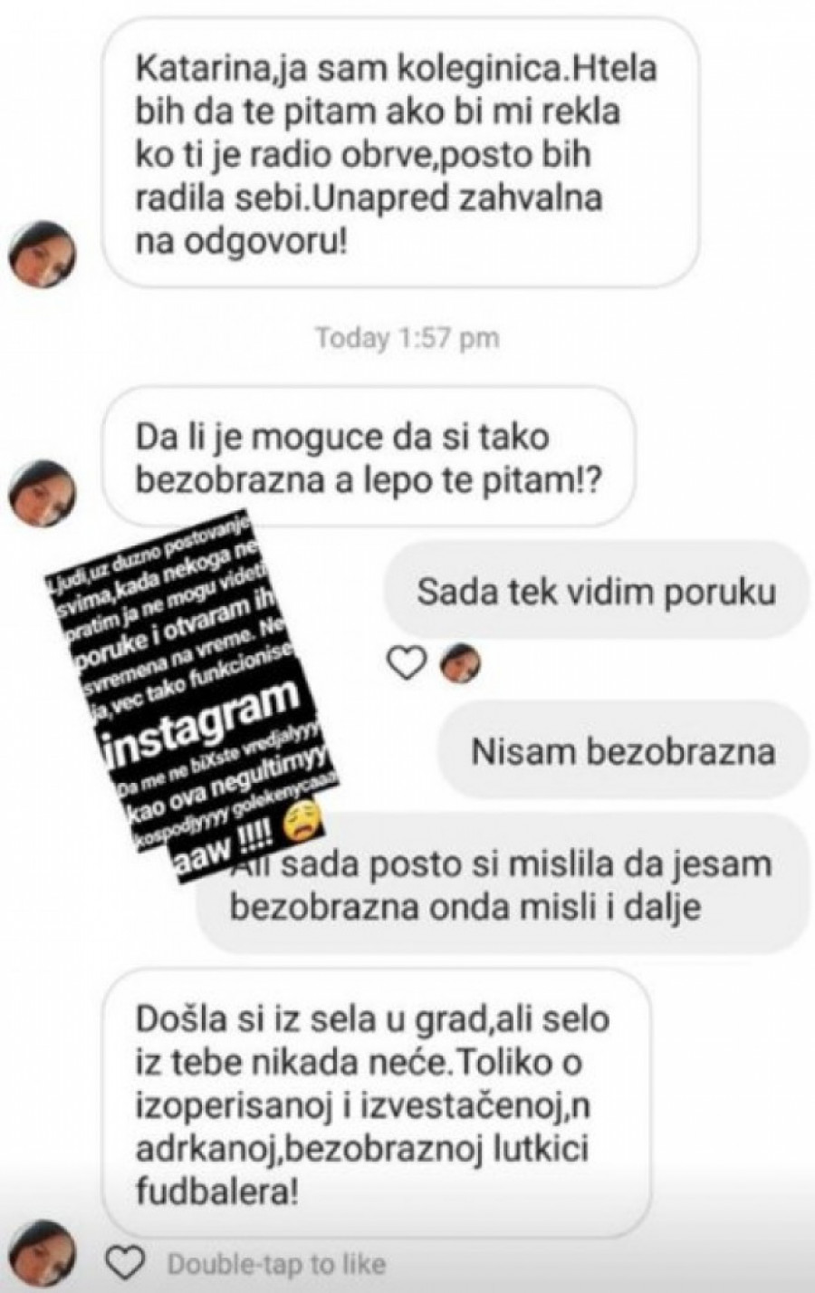 Foto: instagram.com/katarina2789Živkovićeva je deo njihove prepiske okačila na svoj profil na Instagramu jer je želela da svima pokaže kakvih sve ljudi ima i sa čim sve ona mora da se nosi.