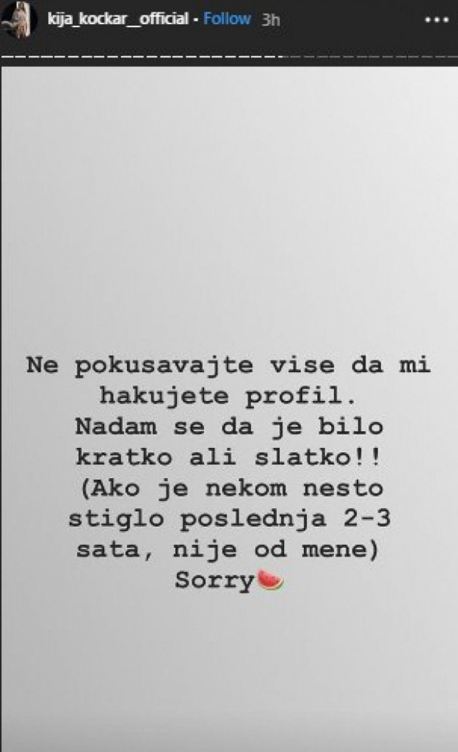 - Ne pokušavajte više da mi hakujete profil. Nadam se da je bilo kratko, ali slatko! Ako je nekome nešto stiglo poslednja 2, 3 sata, nije od mene. Izvinite- napisala je Kristina koja je umirila sve one koji su se zabrinuli.