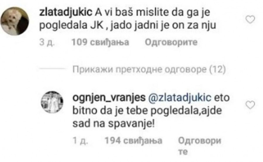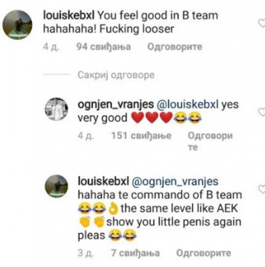 Foto: instagram.com/ognjen_vranjesJedan od Jeleninih fanova, Ognjenu je napisao na engleskom da je "gubitnik", na šta se Vranješ nasmejao, a potom mu je taj dečko napisao: "Pokaži opet svoj mali penis".