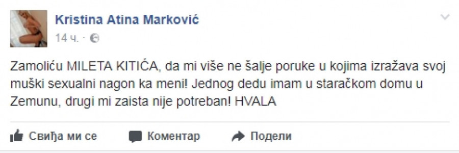 "Zamoliću Mileta Kitića da mi više ne šalje poruke u kojima izražava svoj muški seksualni nagon ka meni! Jednog dedu imam u staračkom domu u Zemunu, drugi mi zaista nije potreban! Hvala", napisala je ona na Fejsbuku.