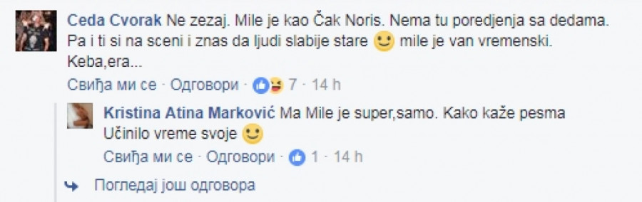 "Ne zezaj. Mile je kao Čak Noris. Nema tu poređenja sa dedama. Pa i ti si na sceni i znaš da ljudi slabije stare. Mile je vanvremenski. Keba, Era", napisao je on, a onda je starleta dodala: