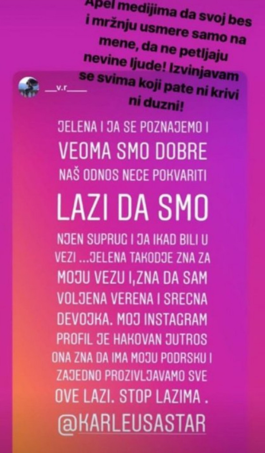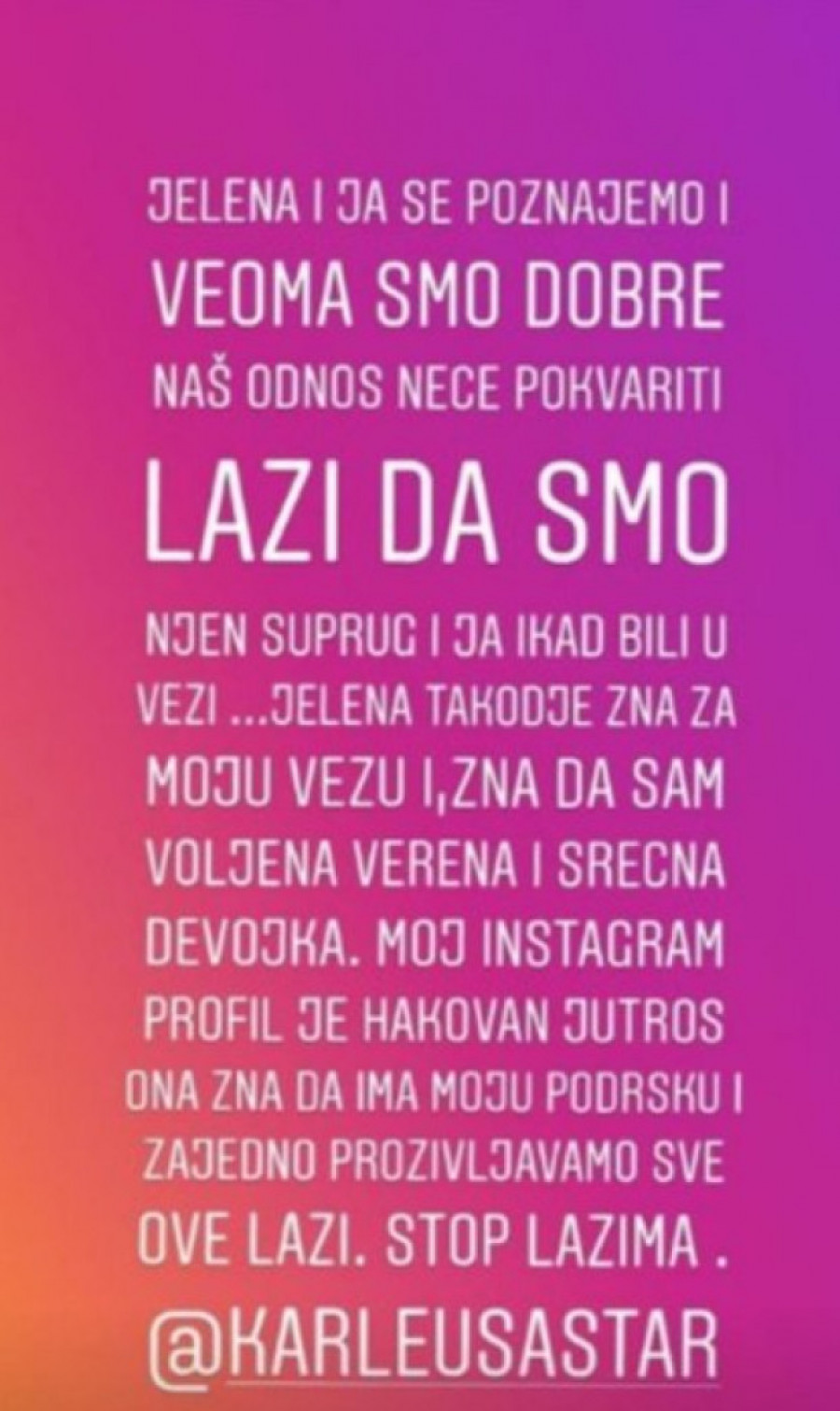 - Po stoti put demantujem priču da sam bila u vezi sa Duškom. Čoveka i ne poznajem, nikad ga srela nisam, kao ni ostale ljude koji su upetljani u ovo. Moj profil je od juče ujutro bio hakovan. Nikad nisam dala ni jednu izjavu da sam u vezi sa Duškom. Ja imam verenika i godinu dana sam već u vezi. Jelenu podržavam i ne želim da znam kako se ona oseća. Ako je meni ovako loše, ne mogu da zamislim kako se ona oseća. Stop lažima - napisala je ona.