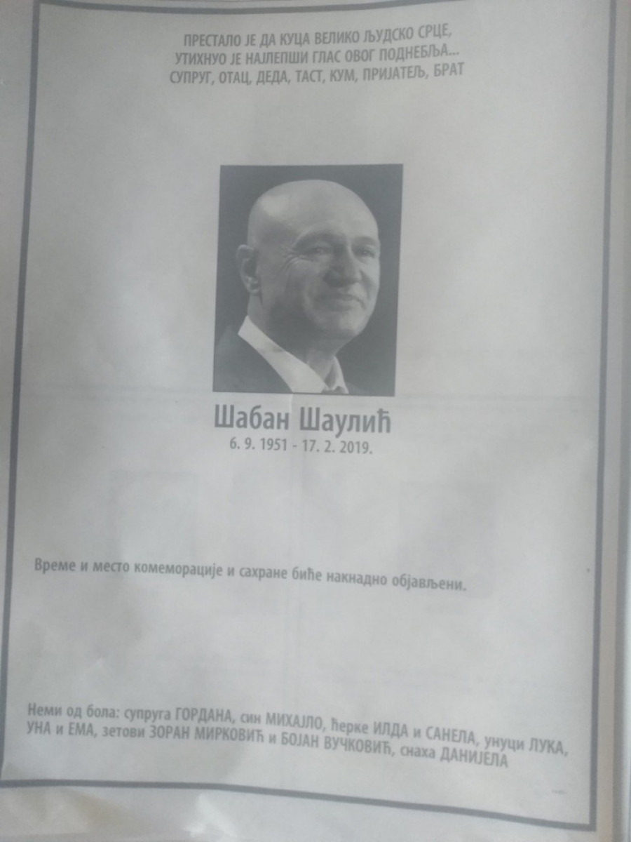 - Prestalo je da kuca veliko ljudsko srce, utihnuo je najlepši glas ovog podneblja... suprug, otac, deda, tast, kum, prijatelj, brat... - piše u čitulji. Čitulja Gordane Šaulić potresla je mnoge.