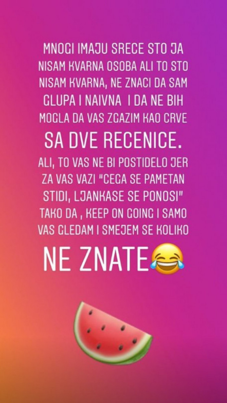 - Mnogi imaju sreće što ja nisam kvarna osoba, ali to što nisam kvarna ne znači da sam glupa i naivna i da ne bih mogla da vas zgazim kao crve sa dve rečenice. Ali, to vas ne bi postidelo jer za vas važi "Čega se pametan stidi, ljankase se ponosi". Samo vas gledam i smejem se, koliko, ne znate - napisala je Kija na svom instastoriju, a bilo je jasno da se obratila Editi.
