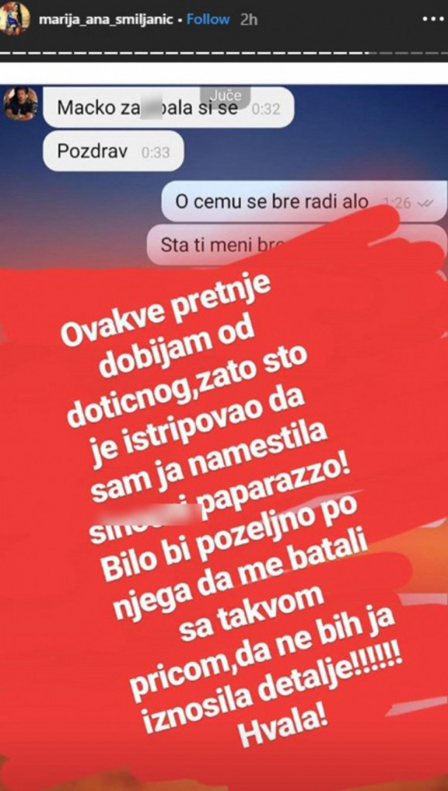 - Ovakve pretnje dobijam od dotičnog, zato što je istripovao da sam ja namestila paparaco. Bilo po poželjno po njega da me batali sa takvom pričom, da ne bih iznosila detalje. Hvala! - napisala je Smiljanićeva, vidno iznervirana.