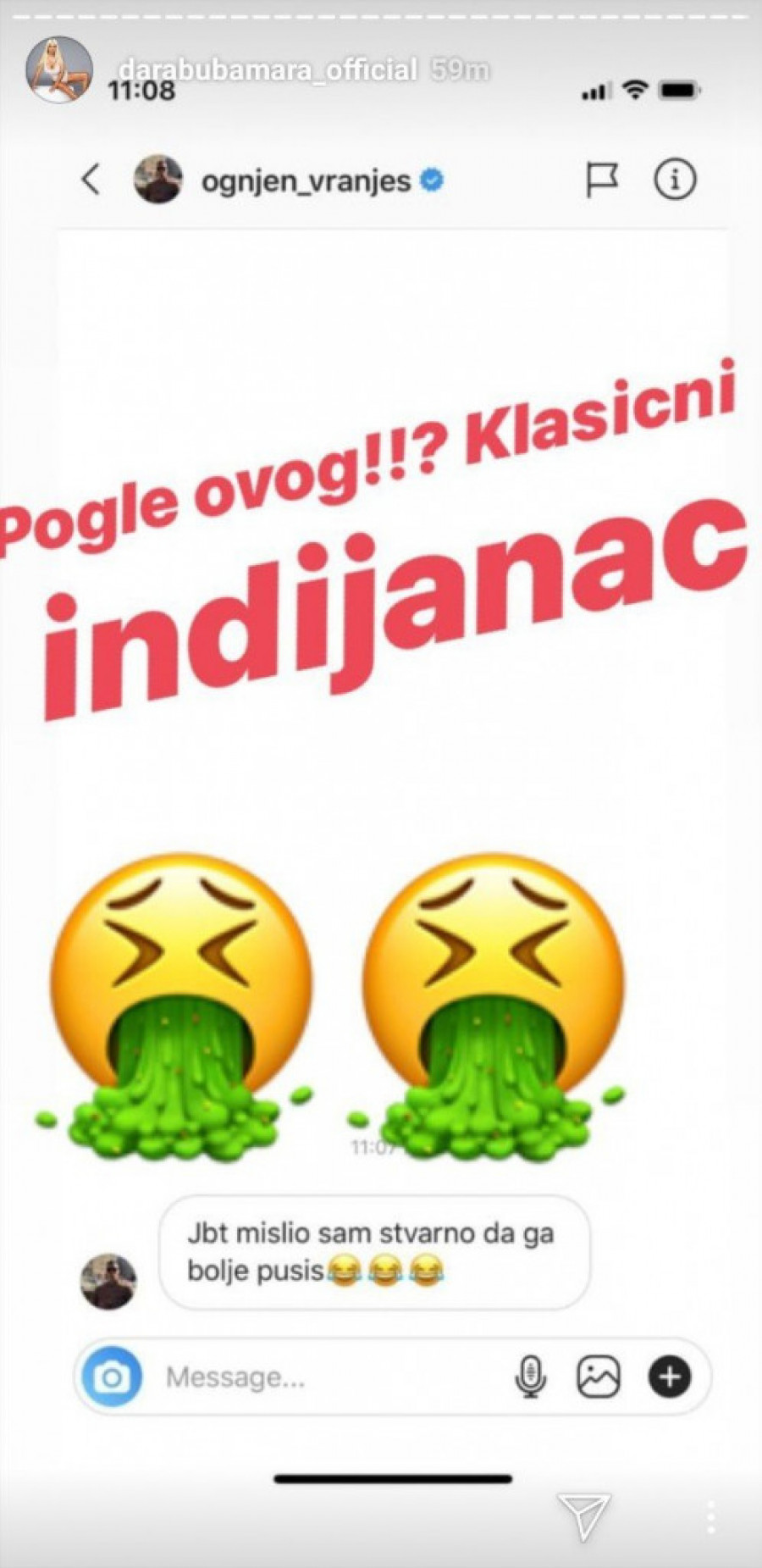 Foto: instagram.com/darabubamara_official- Pogle ovog! Klasični indijanac - odogovorila je pevačica i na Instagramu objavila njegovu nepristojnu poruku.