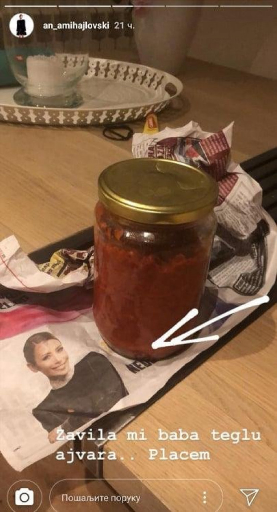 Foto: instagram.com/an_amihajlovskiAna je od bake dobila teglu domaćeg ajvara uvijenu u novine, baš u stranu na kojoj je bila fotografija voditeljke.