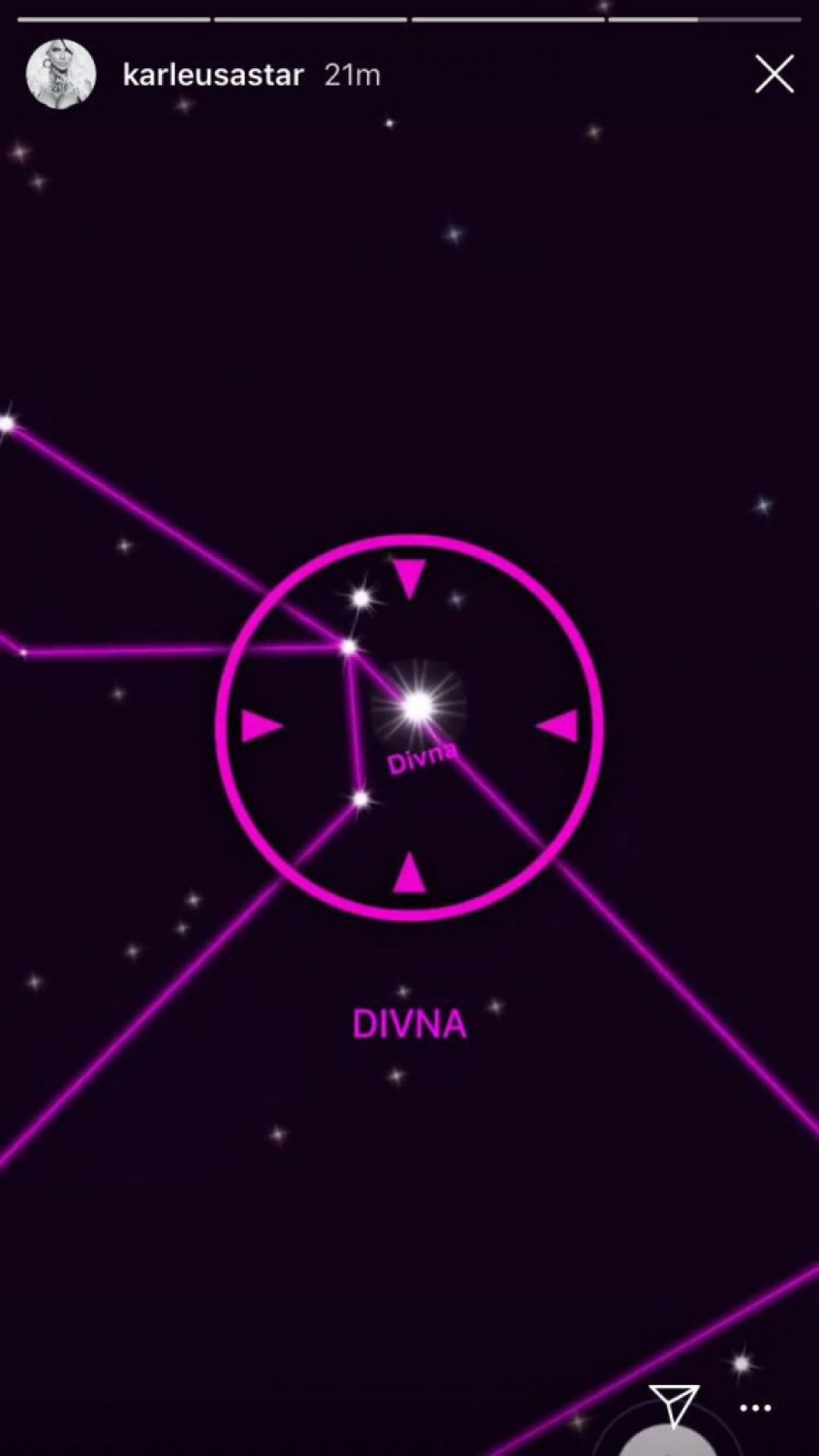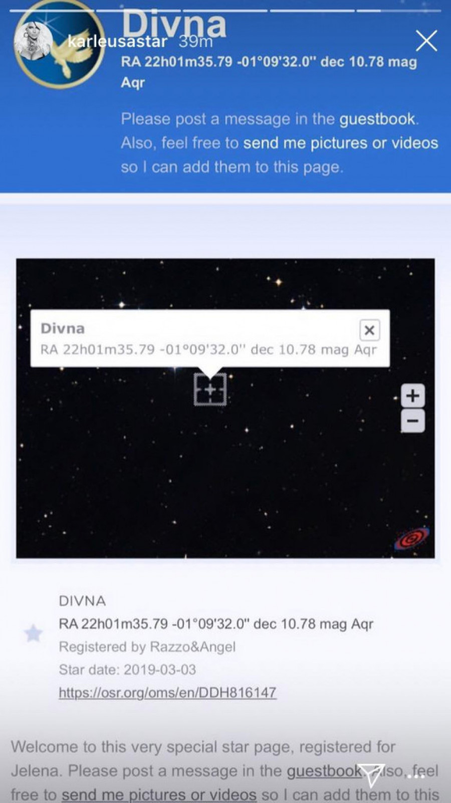 Foto: instagram.com/divnakarleusaU toku današnjeg dana Divni je podignut spomenik, a baš danas Jelena je objavila snimak zvezde u Vodoliji koji je zodijački znak pokojne Divne.