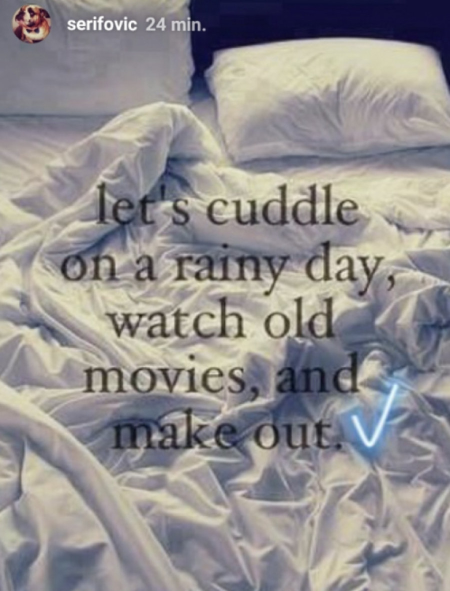 Ovoga puta Šerifovićeva je na Instagramu objavila fotografiju kojom poručuje šta bi volela da radi na kišni dan, samo ne znamo da li je to nekom konkretnom uputila poziv na maženje i poljupce?
