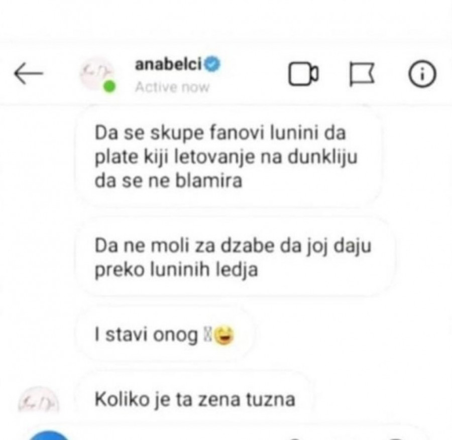 Kockar dodaje i da bi Anabela trebalo drugačije da iskoristi svoj uticaj na Lunine fanove.
