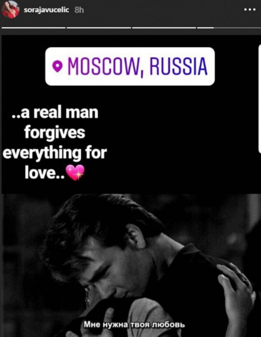Foto: instagram.com/vucelicsorajasaraNaime, starleta je u svojoj Instagram priči napisala "Pravi muškarac oprašta sve za ljubav", a u pozadini su reči na ruskom jeziku "Potrebna mi je tvoja ljubav".