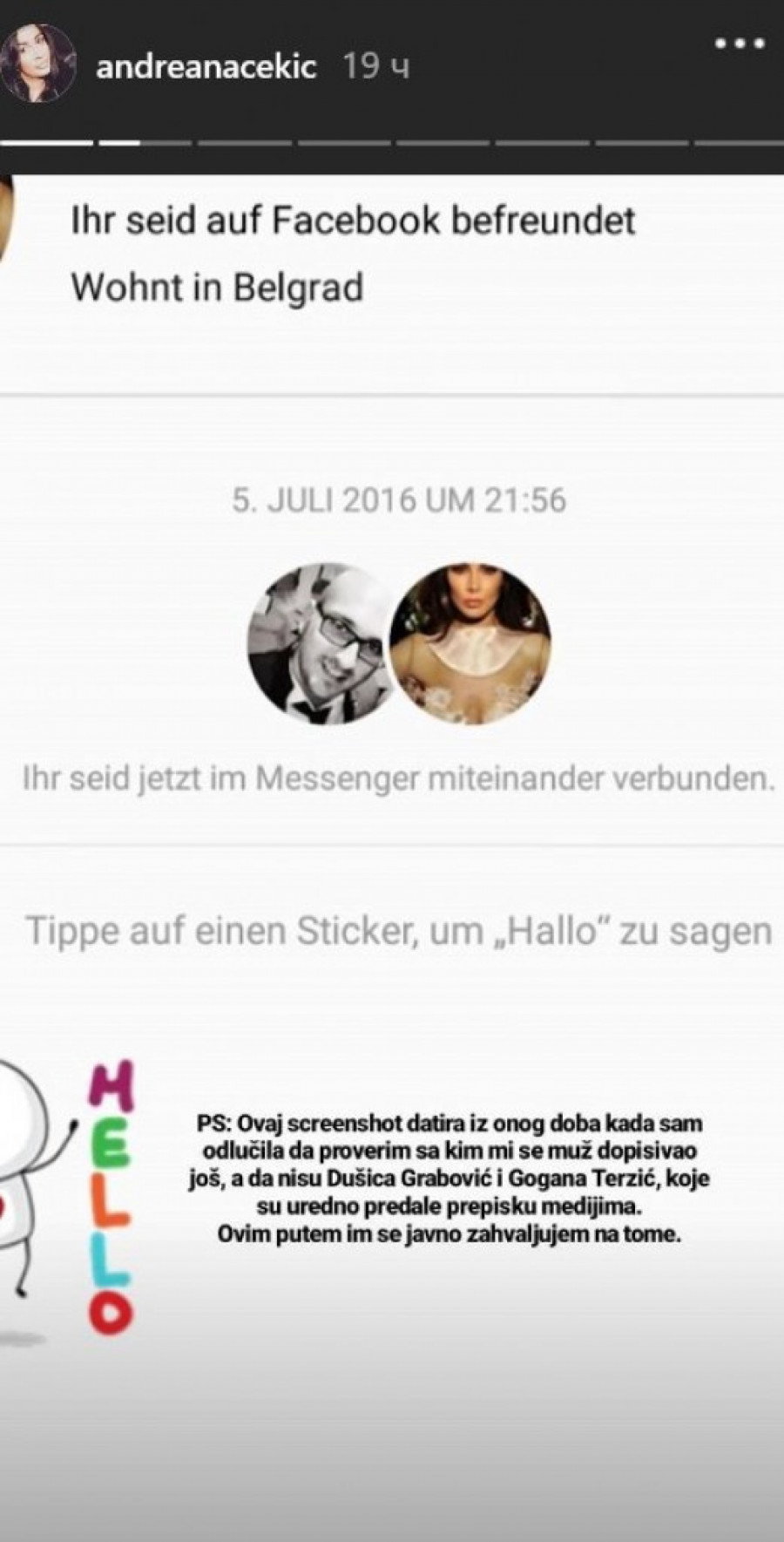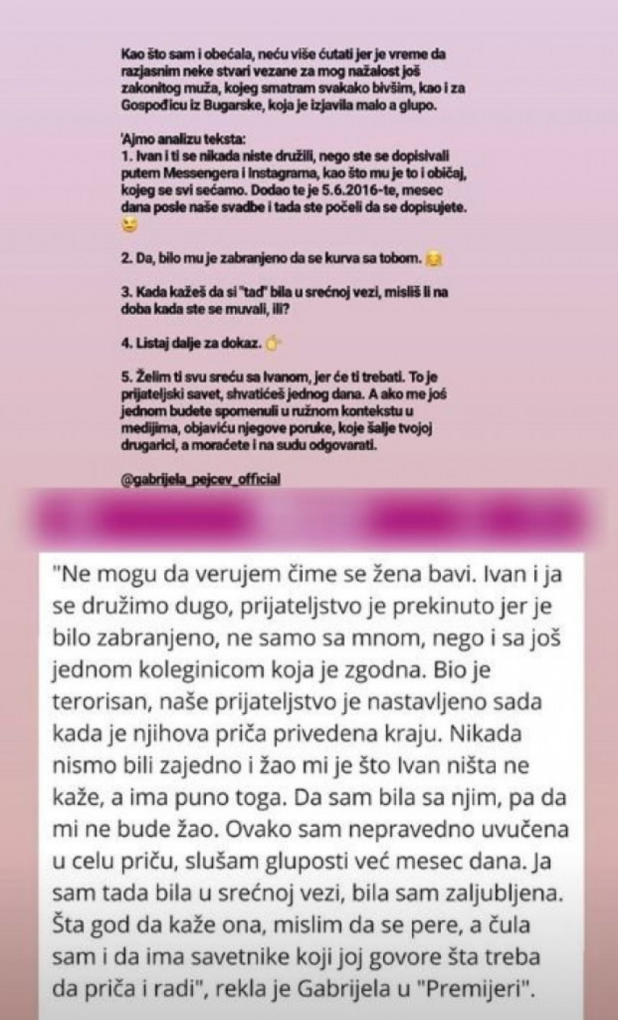 Nakon što je Gabrijela Pejčev izjavila da se samo družila sa mužem Andreane Čekić i da je u tom periodu bila zaljubljena i u srećnoj vezi, Andreana je imala potrebu da se oglasi na svom Instagramu i "pojasni neke stvari".