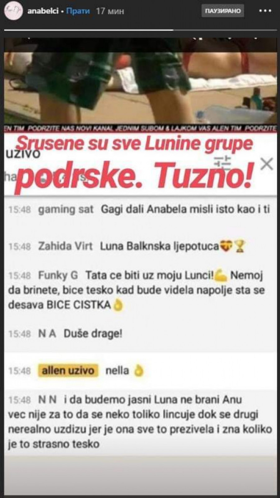 Foto: youtube.com/Zadruga Official- Srušene su Lunine grupe podrške! Tužno! - napisala je Anabela koja je očigledno očajna budući da su ove fan stranice mnogo značile Đoganijevoj tokom glasanja.