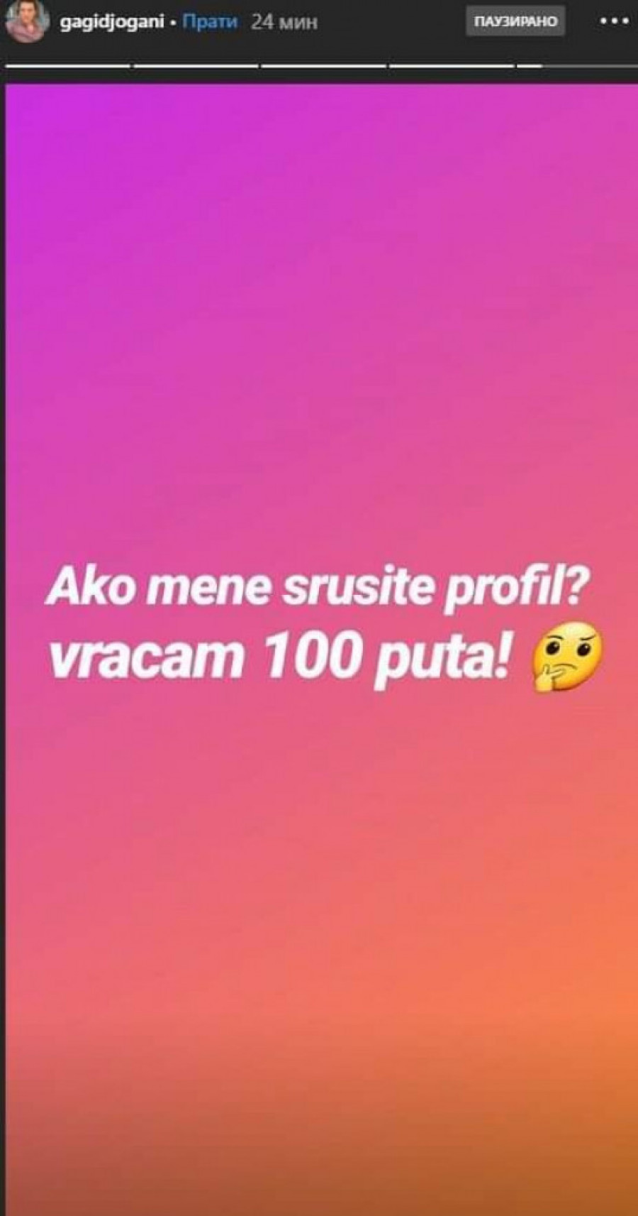 - Ako meni srušite profil, vraćam 100 puta- napisao je Gagi , koji je ovim sigurno uplašio one koji su srušili starnice Luninih fanova.